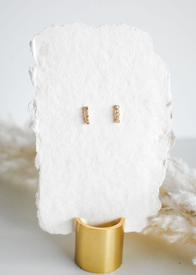 Get ready to add some sparkle to your wardrobe with our Gold Cubic Zirconia Bar Studs! These playful hoops are perfect for adding a touch of fun and glamour to any outfit. Made with 14k gold dipped and lined with sparkling cubic zirconia, these earrings are sure to be a hit.