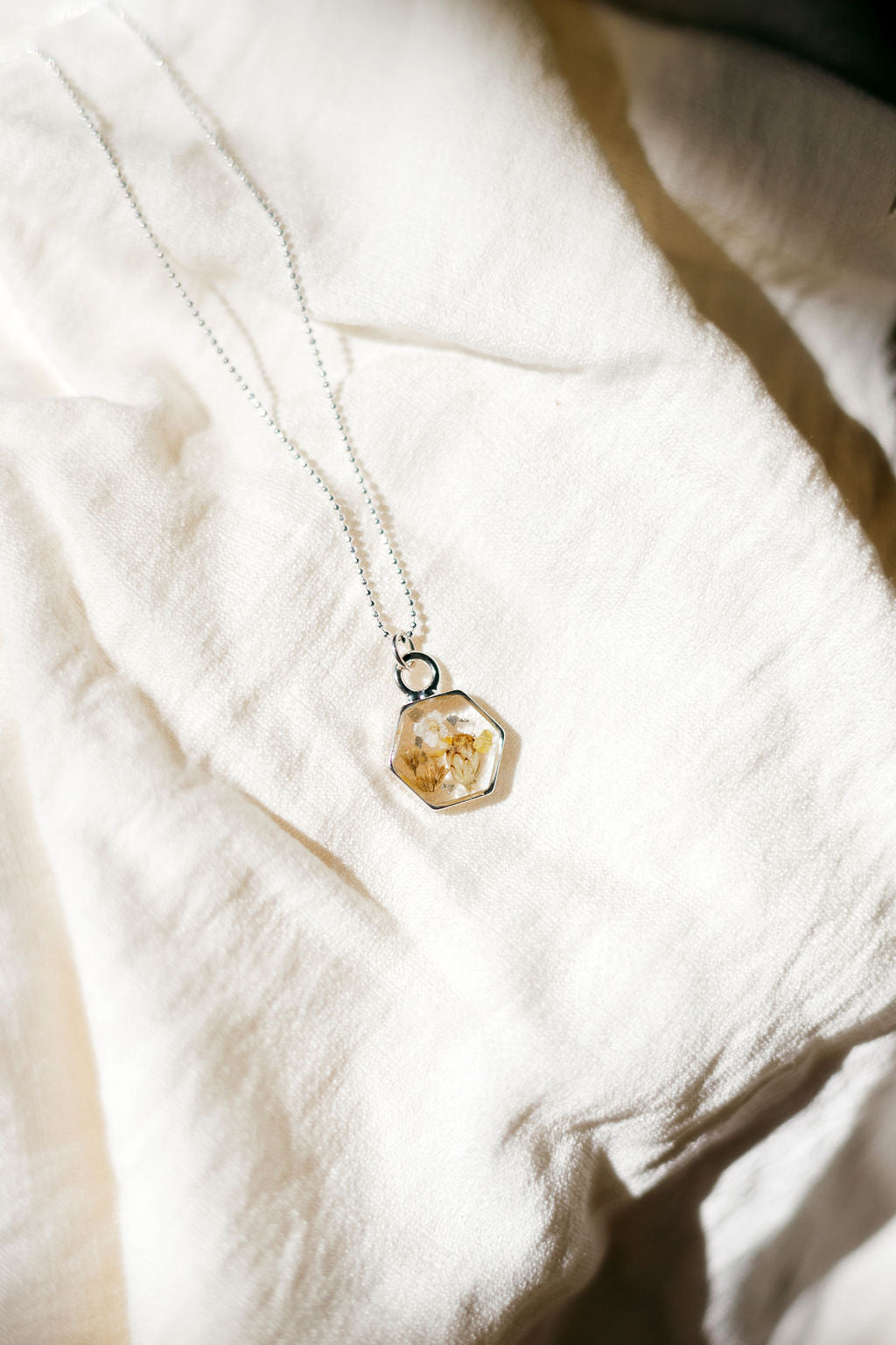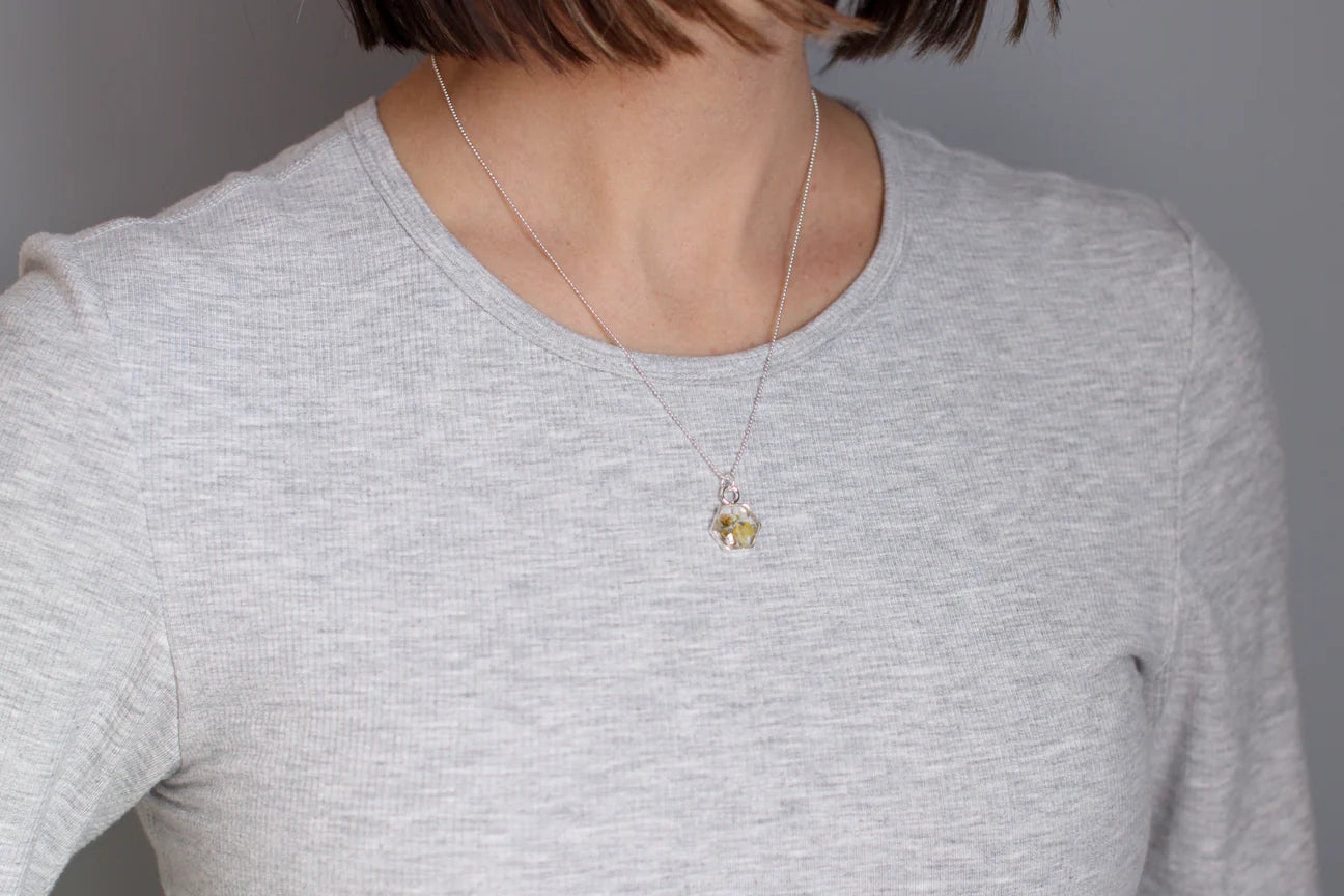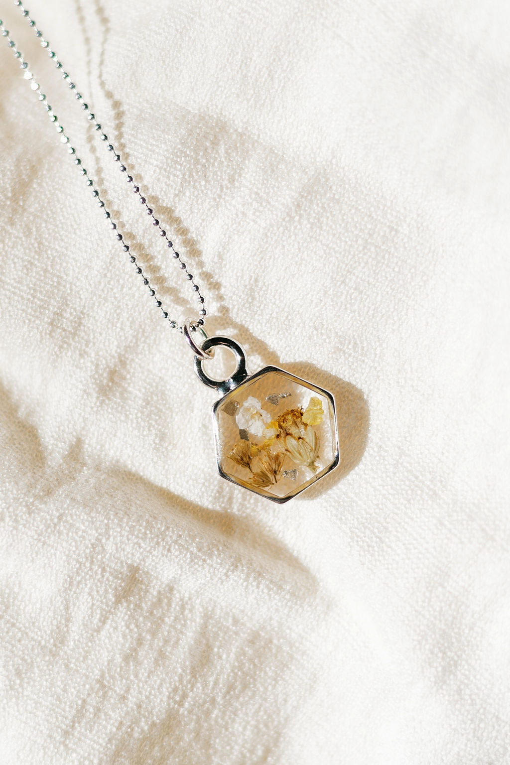 Tiny sweet yellow and white flowers are featured in this silver mini hexagon shaped necklace, perfect for layering or wearing on its own. Flowers include mustard, solidago, and white alyssum (or rice flowers, depending on seasonal availability). Flecks of silver glass adds subtle sparkle.