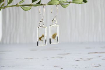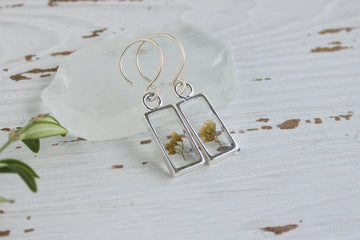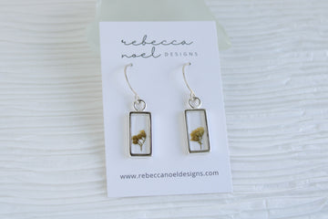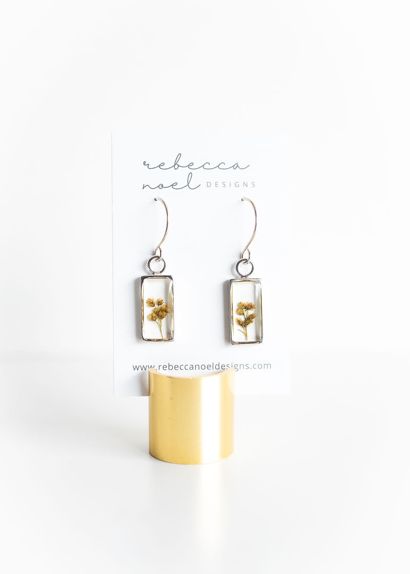 These cute silver rectangle earrings feature tiny solidago (goldenrod) flowers in resin. They hang on sterling silver handmade earwires. Total length is 1 5/8”.