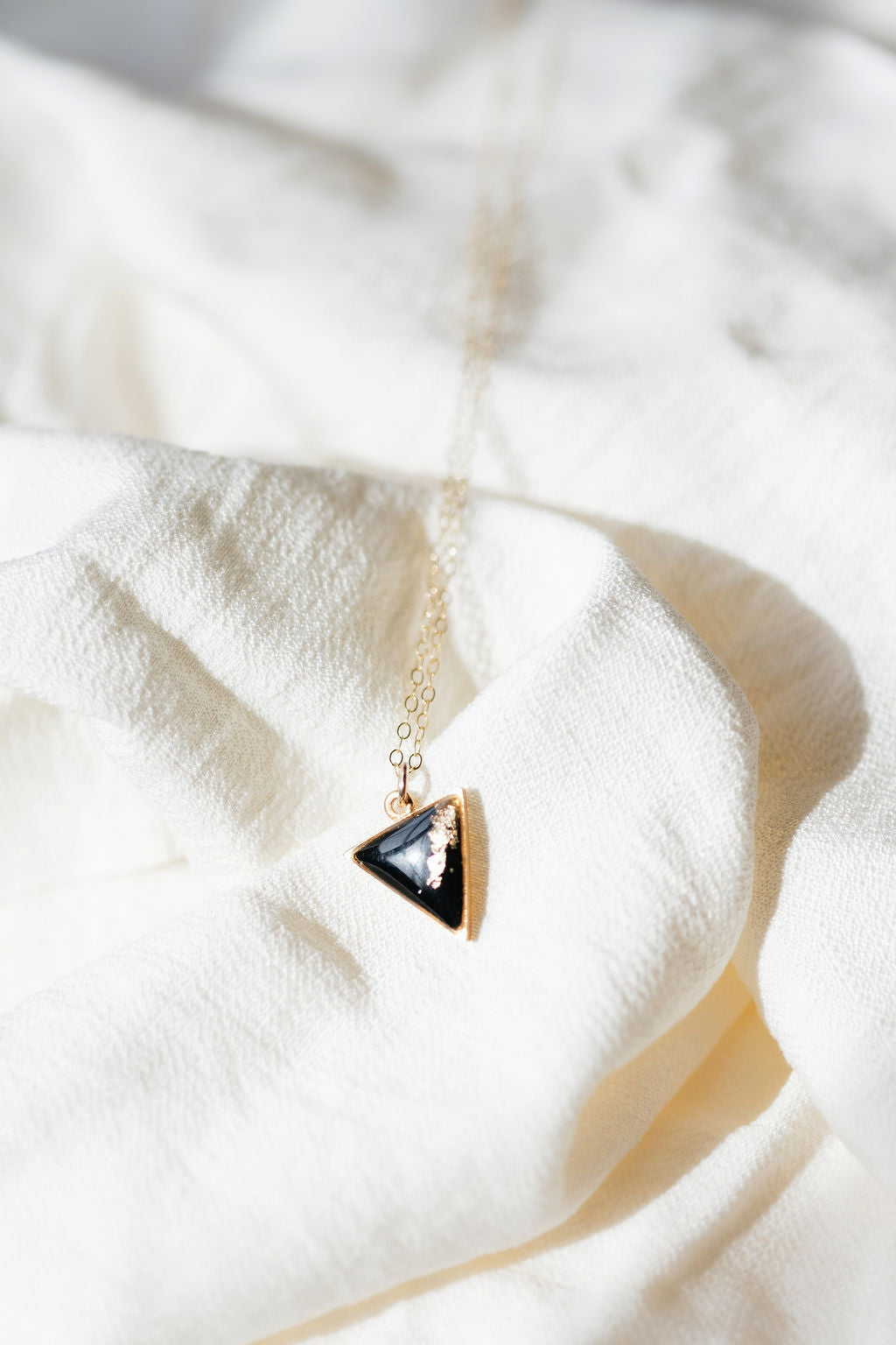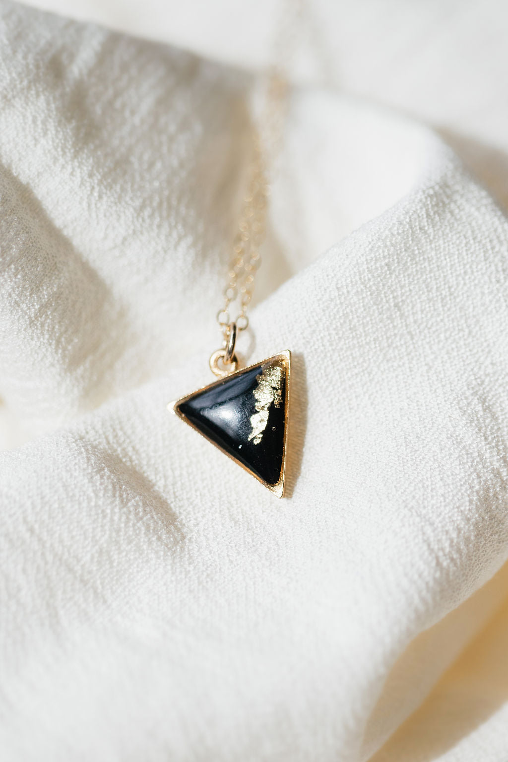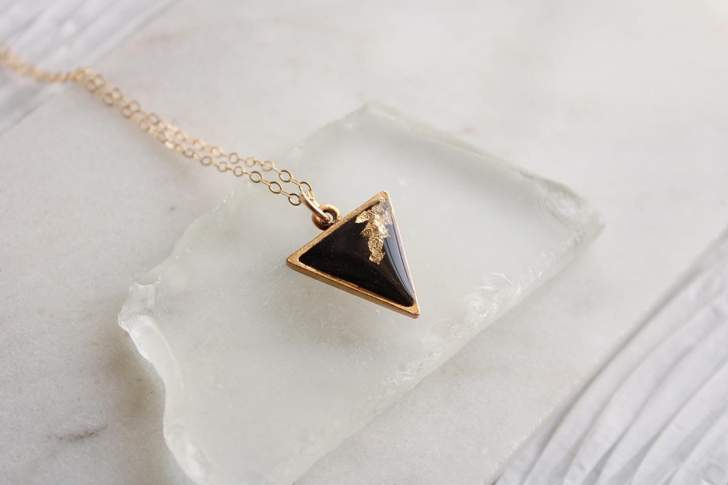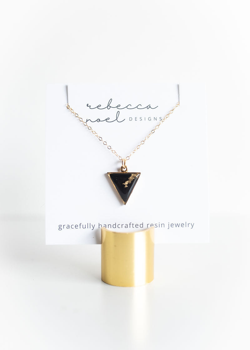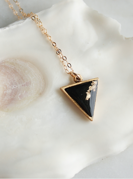 Tiny and fun, this gold triangle is filled with black epoxy clay and gold gilding flakes, topped with a glossy layer of resin. This charm hangs on an 18” gold filled chain.