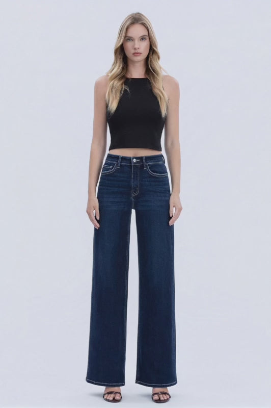 HIGH RISE DARK WASH FULL LENGTH WIDE JEANS COMFORT STRETCH DENIM, HIGH RISE WAIST, FINISHED HIM, FULL LENGTH, WIDE JEANS F. RISE: 10 1/2" / INSEAM: 33" / LEG OPENING: 22"