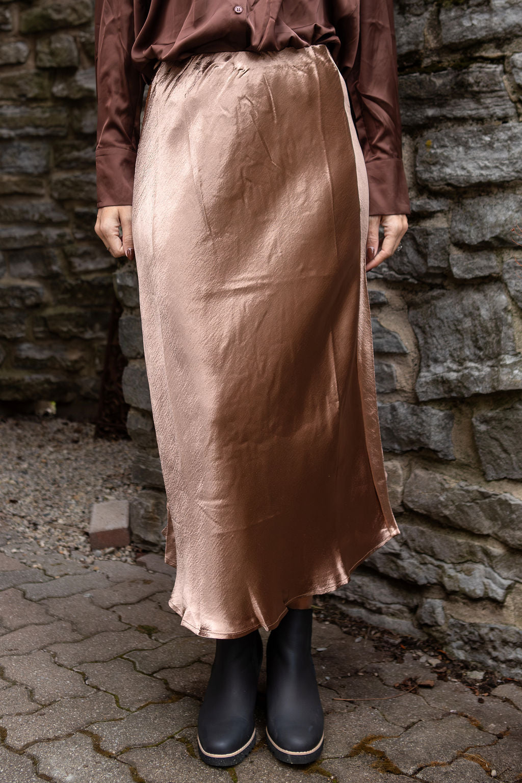 This satin long skirt, with its glossy, silky finish, reflects light beautifully. It has a fluid, draping silhouette that falls elegantly to a midi length, enhancing its chic and sophisticated appeal. The skirt features a smooth, elasticized waistband for a comfortable fit and a slightly flared hem for effortless movement. Its lustrous fabric adds a touch of glamour, making it perfect for both casual and dressy occasions.