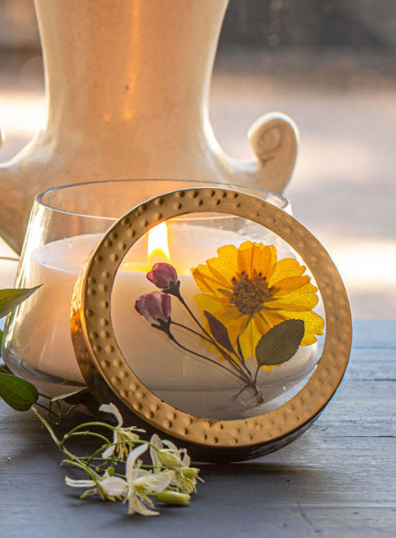Our pressed floral candles feature dreamy floral tableaus displayed between panes of glass. Hand poured with a coconut wax blend. Lovingly hand poured in Dayton, OH.
