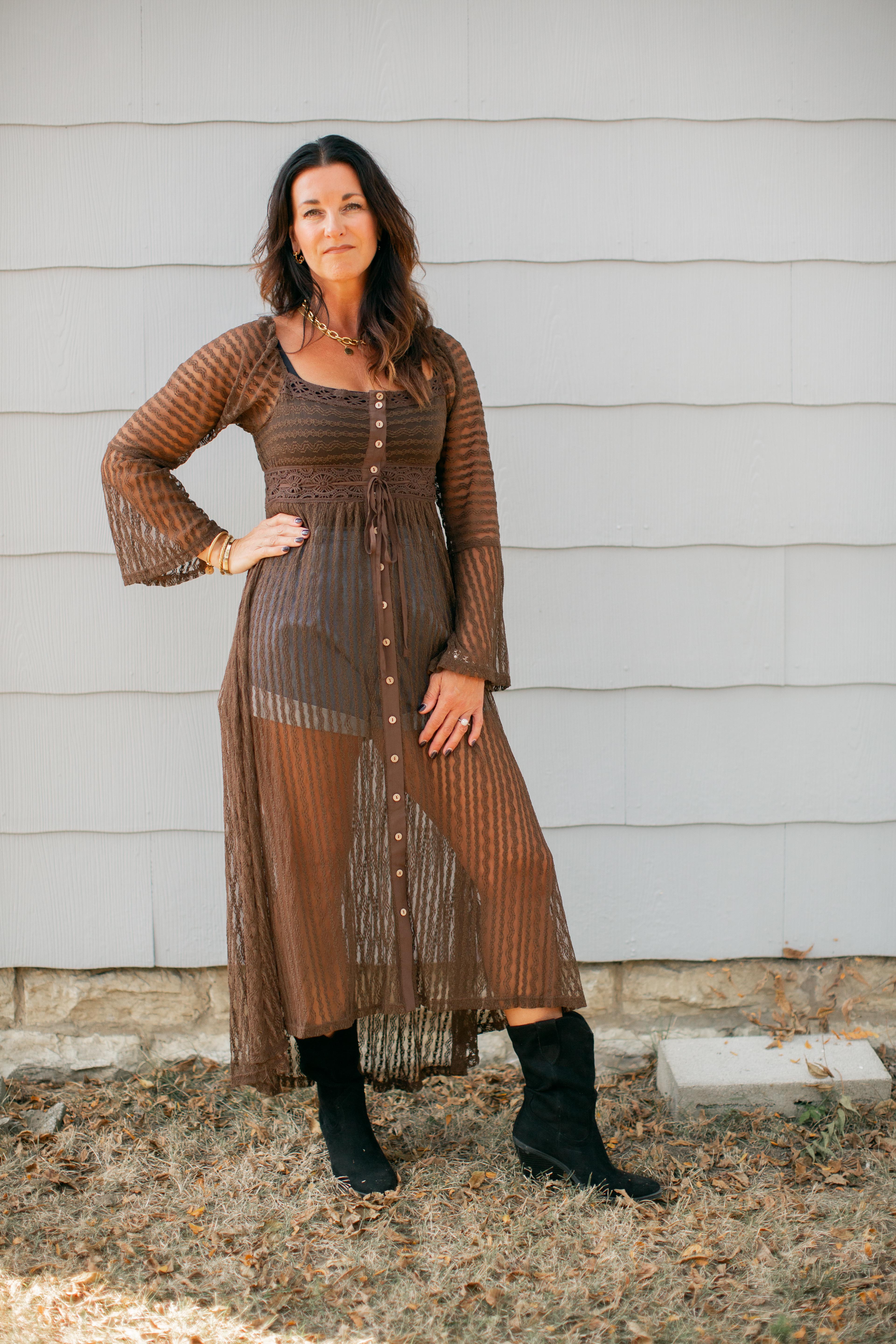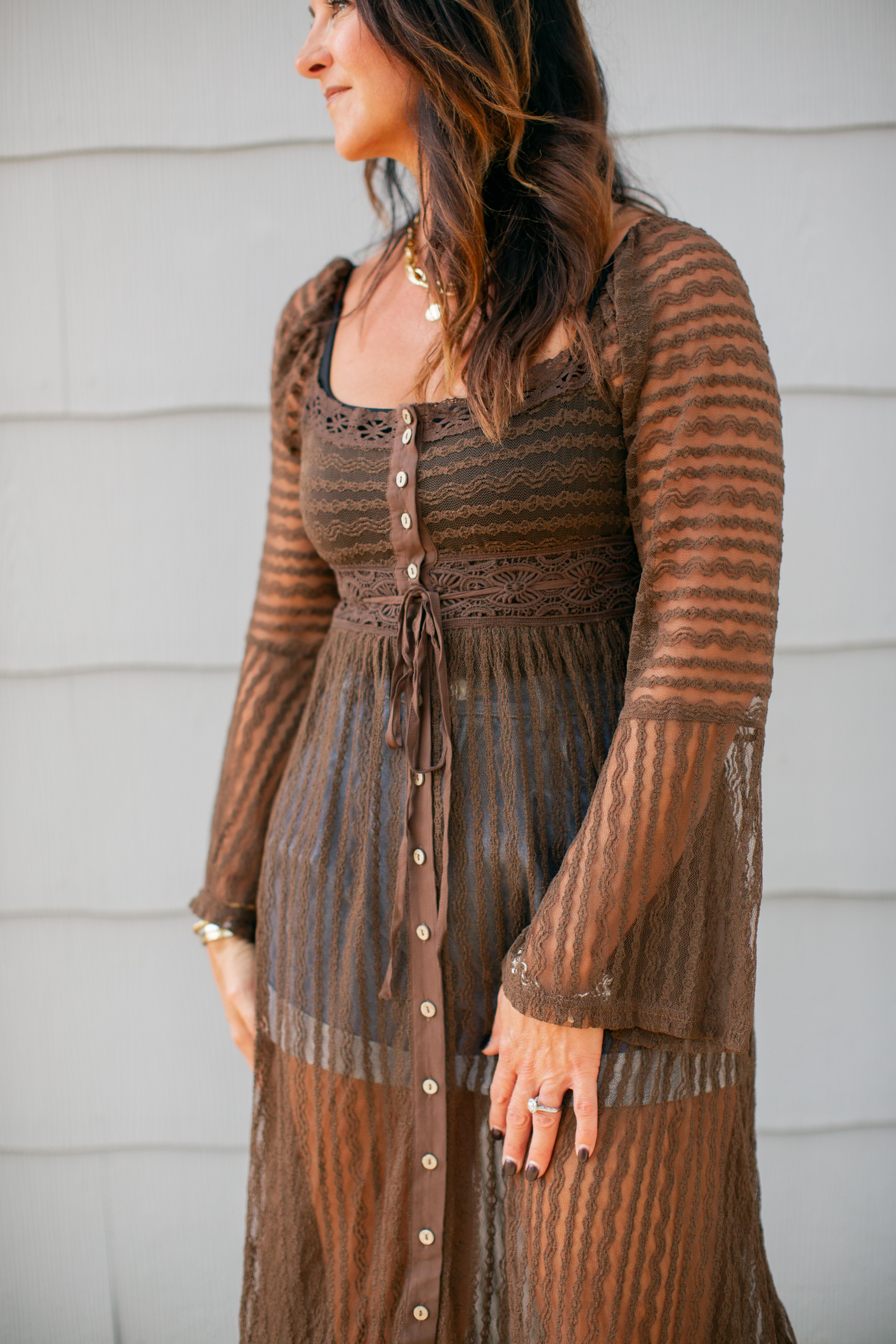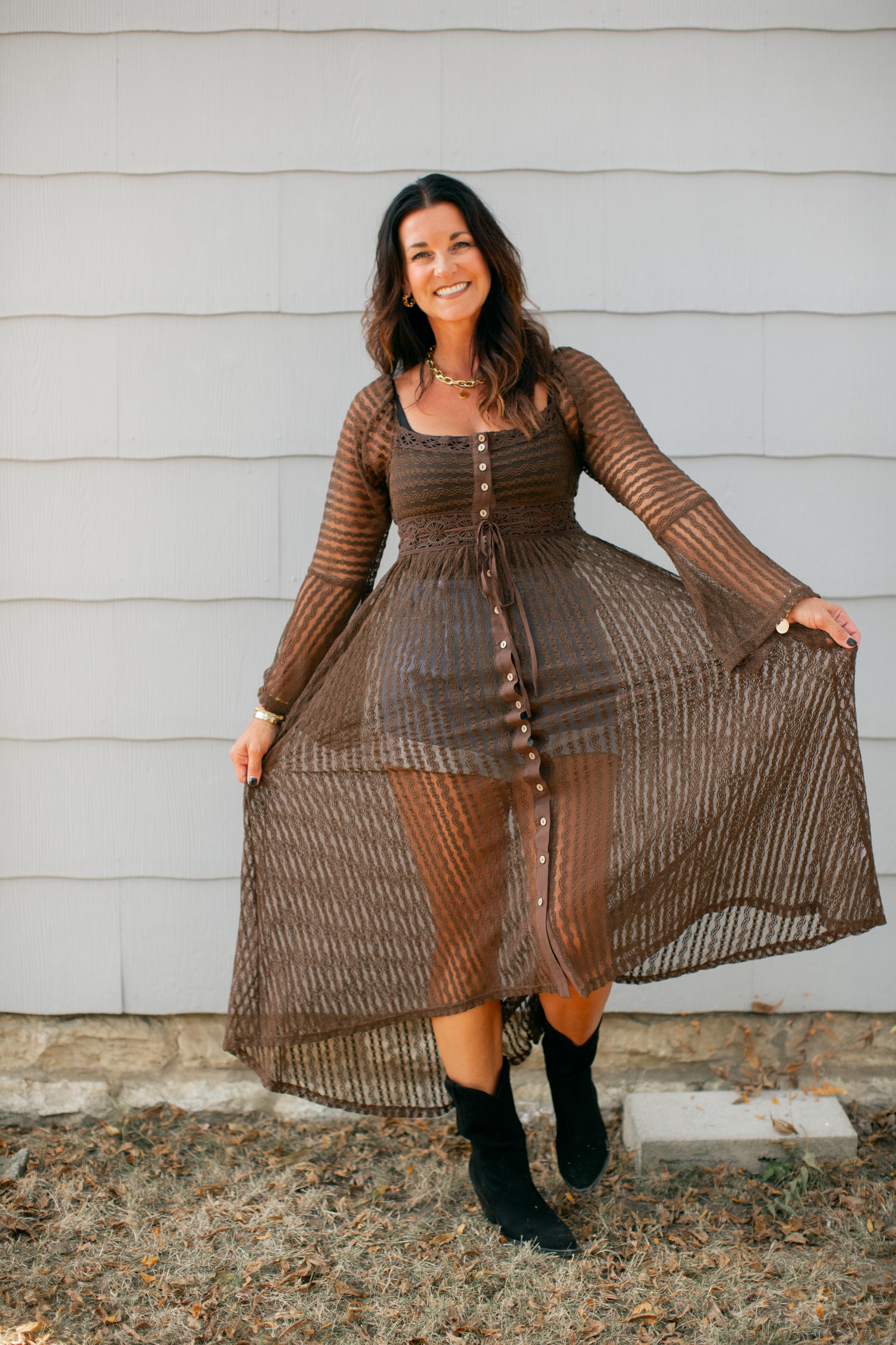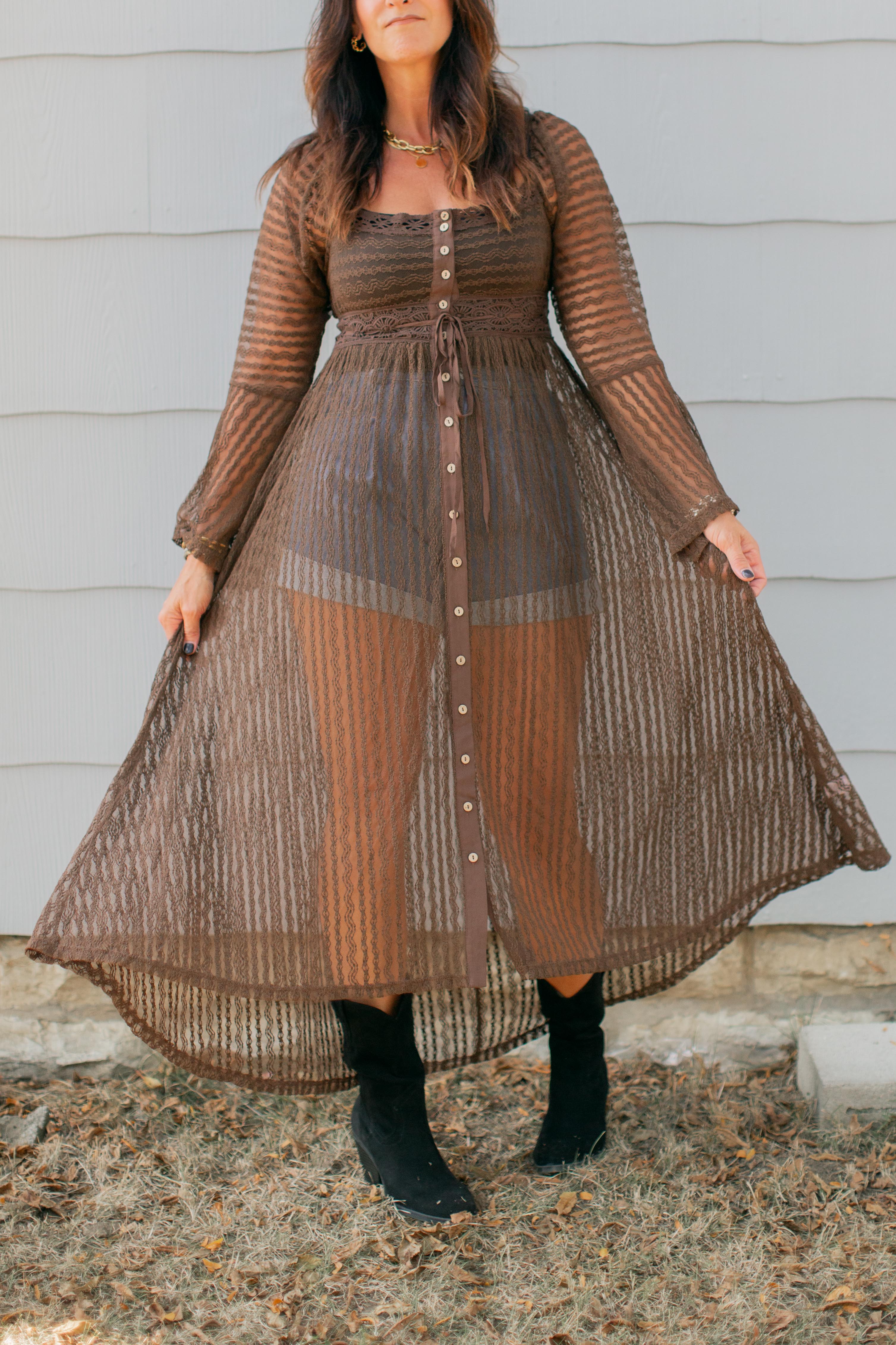 Trinity Taupe Sheer Striped Lace Layering Midi Dress