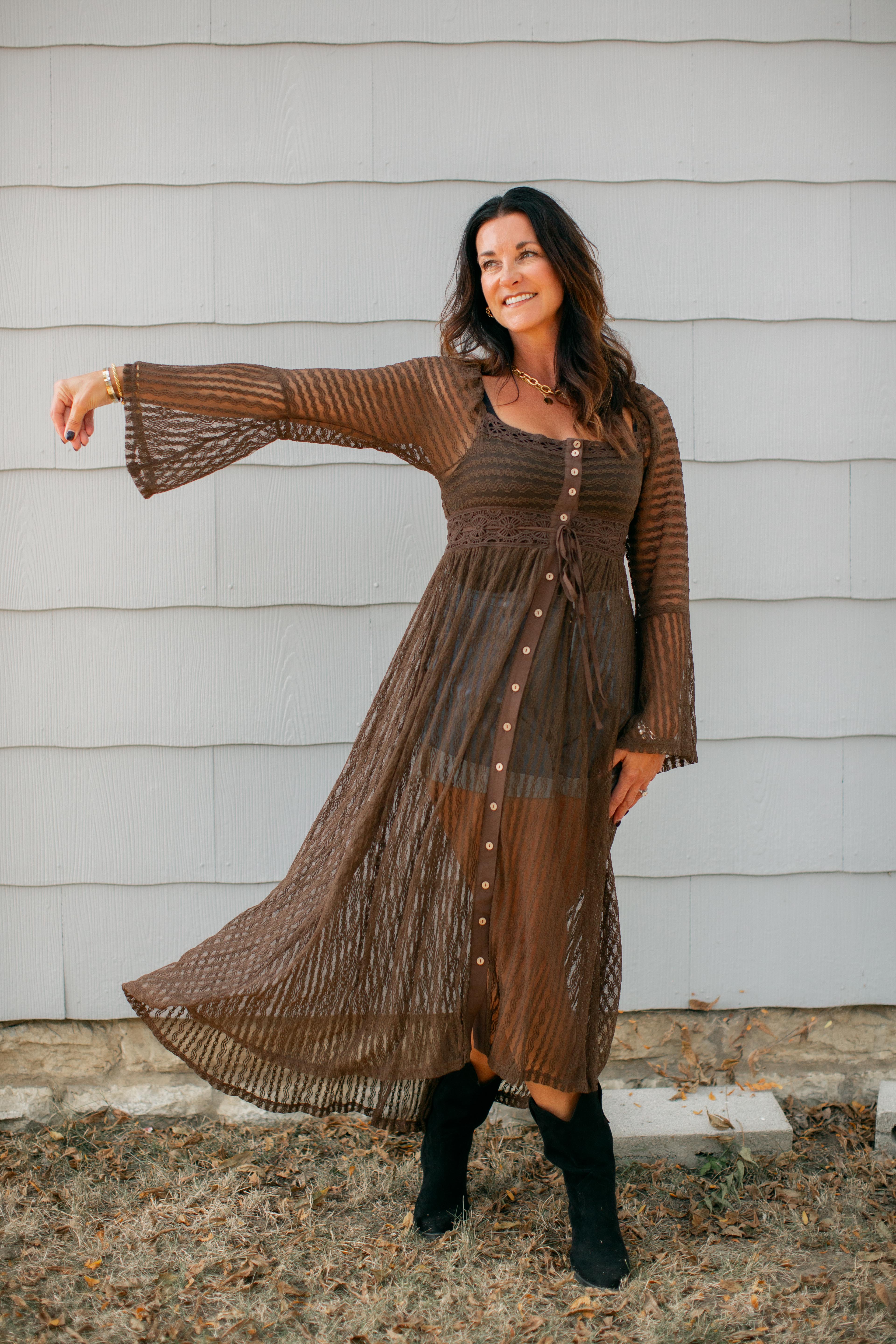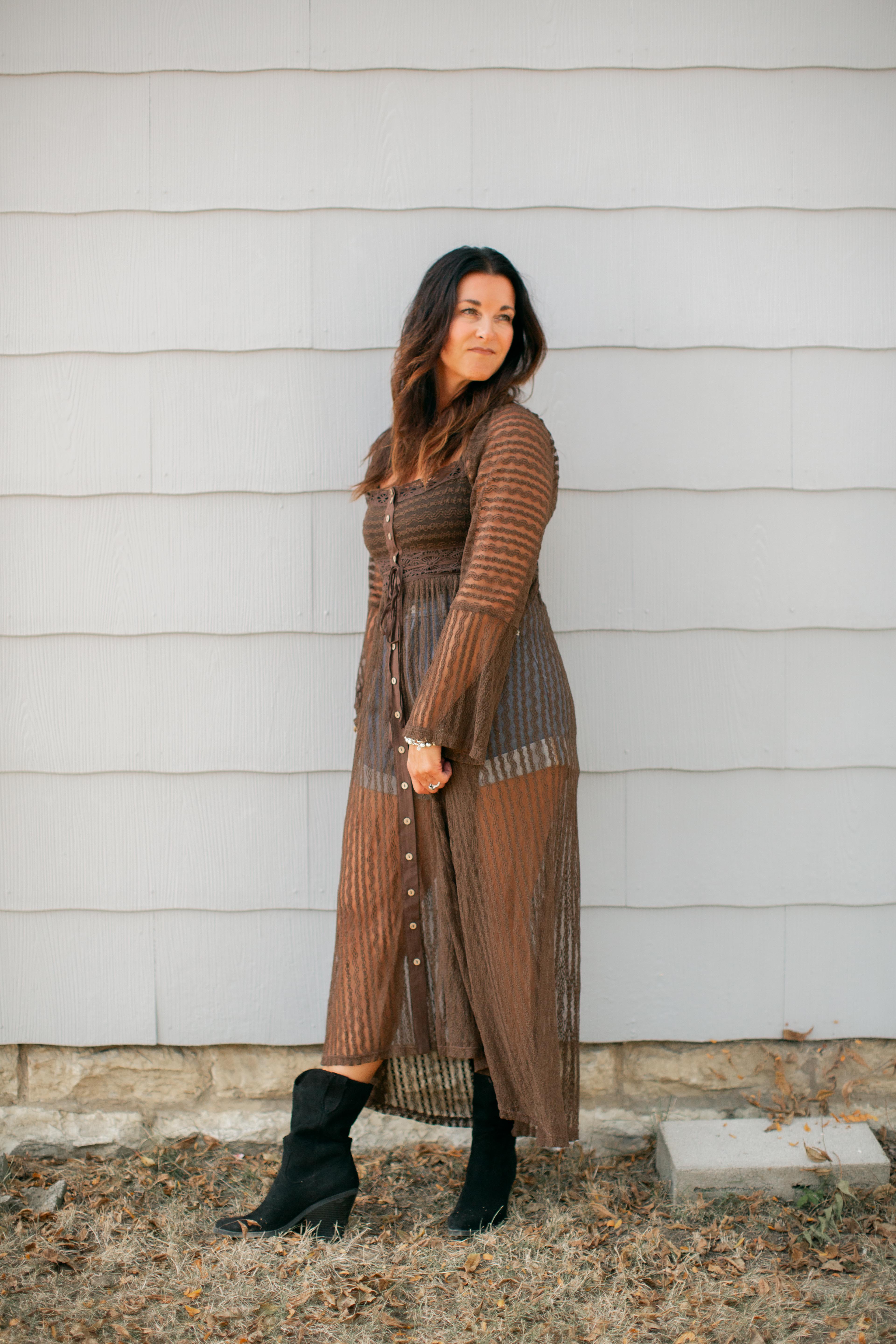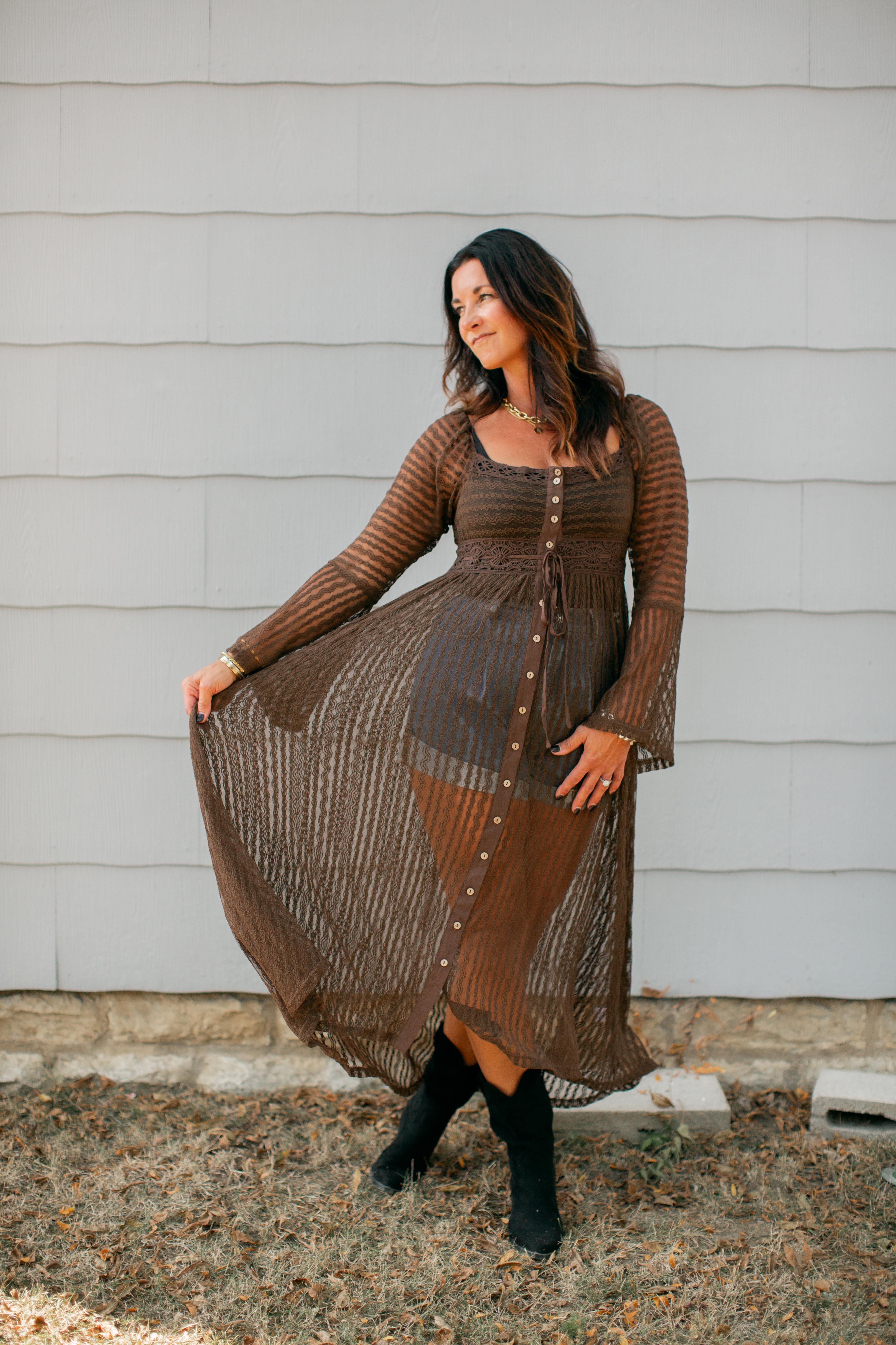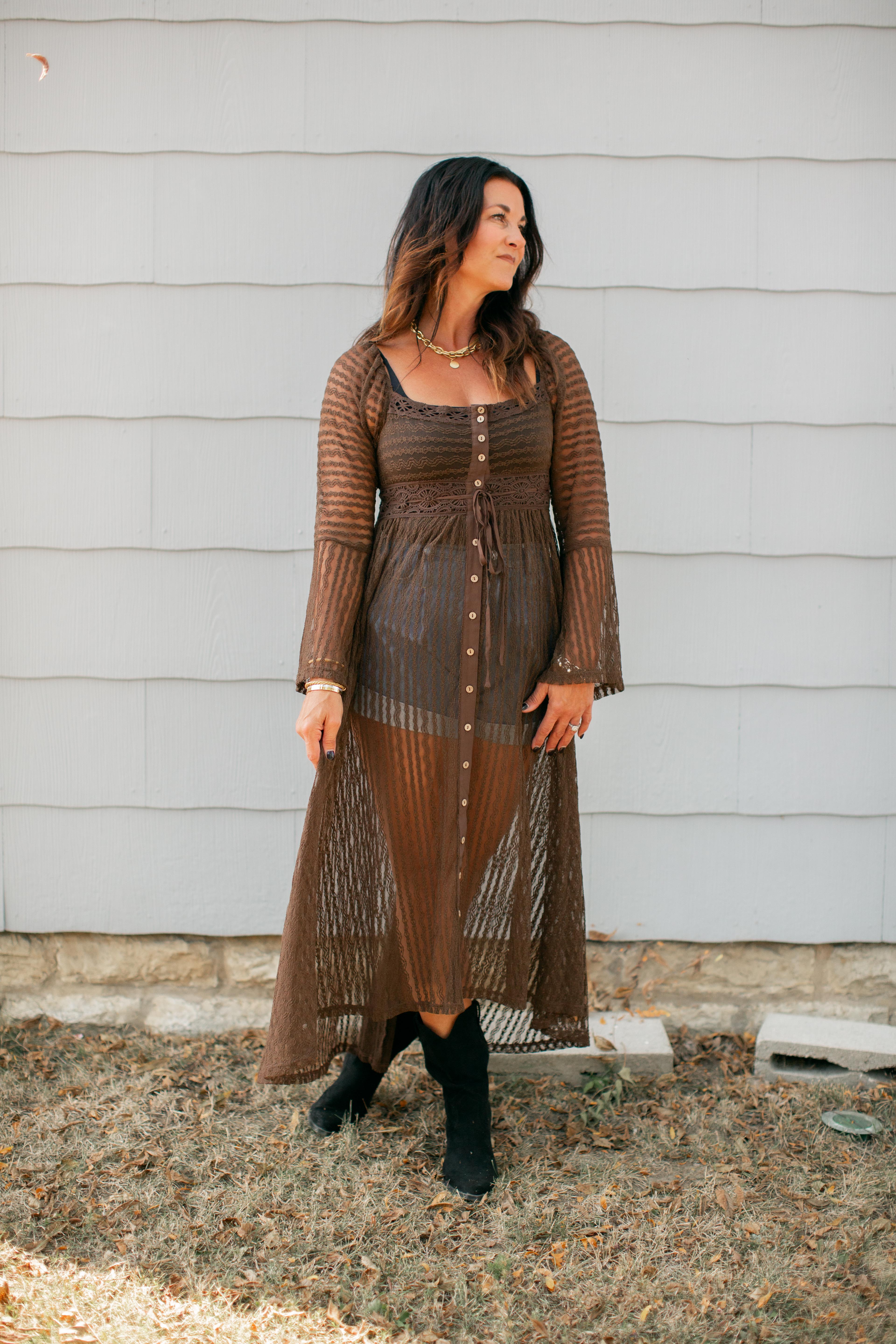 Trinity Taupe Sheer Striped Lace Layering Midi Dress