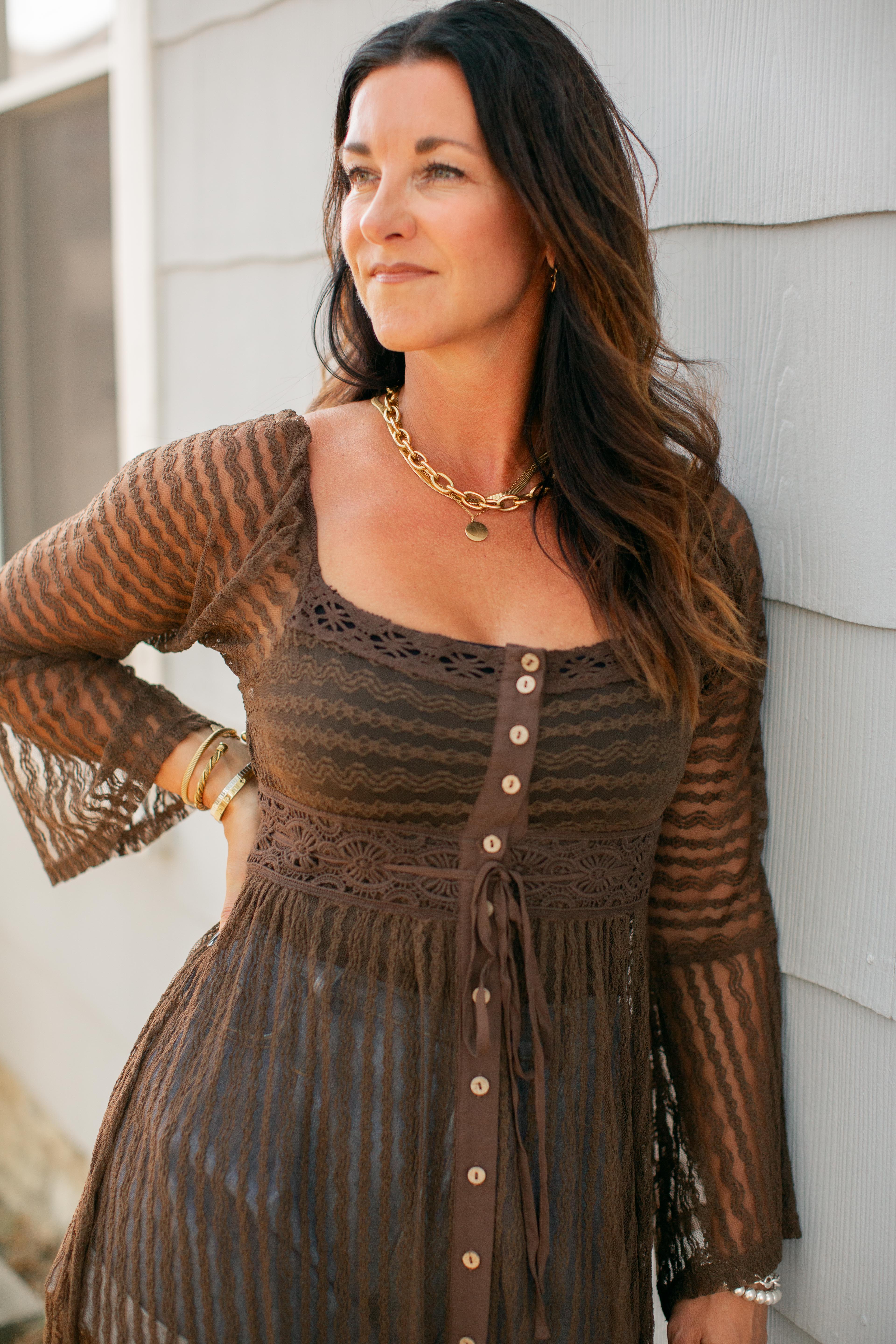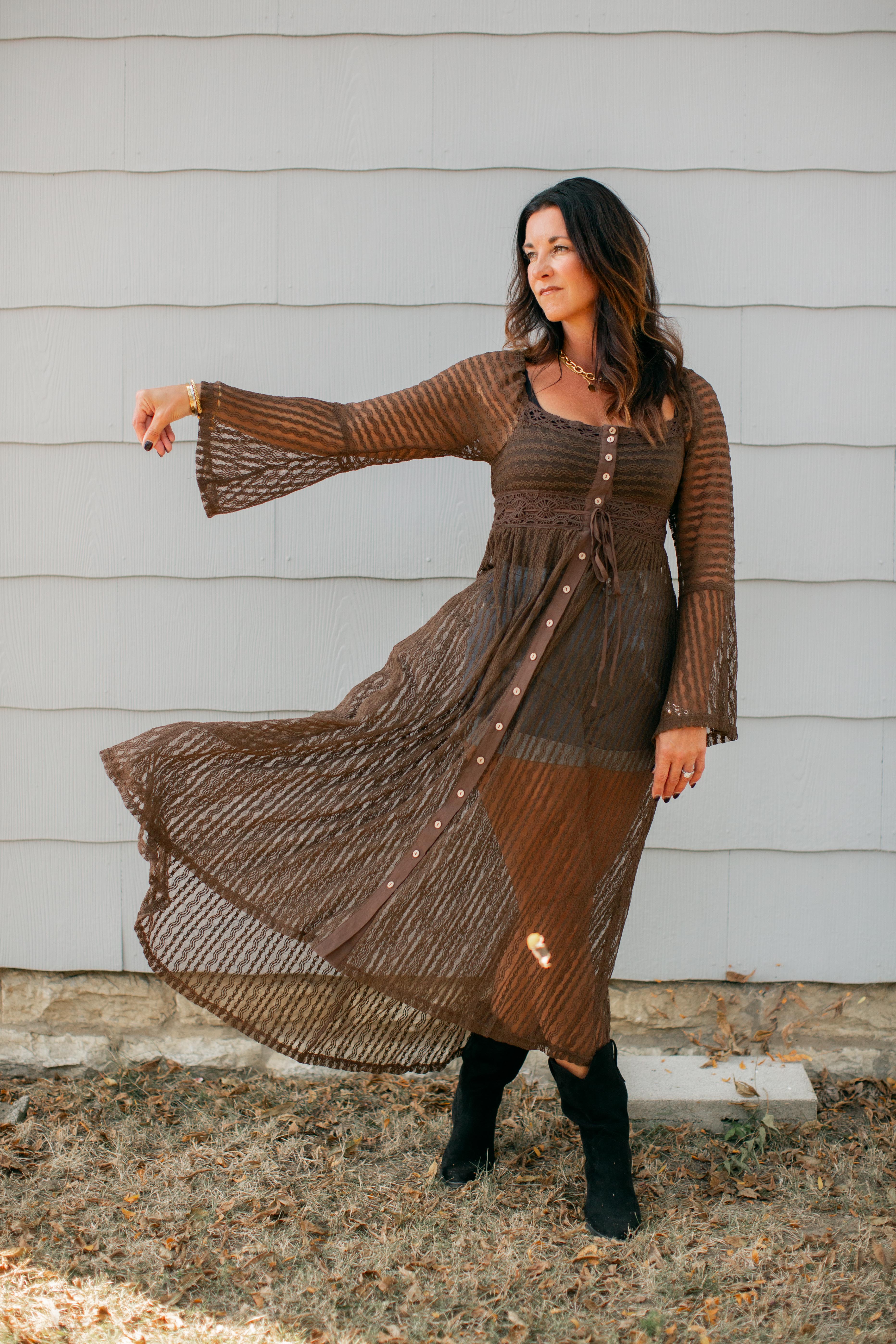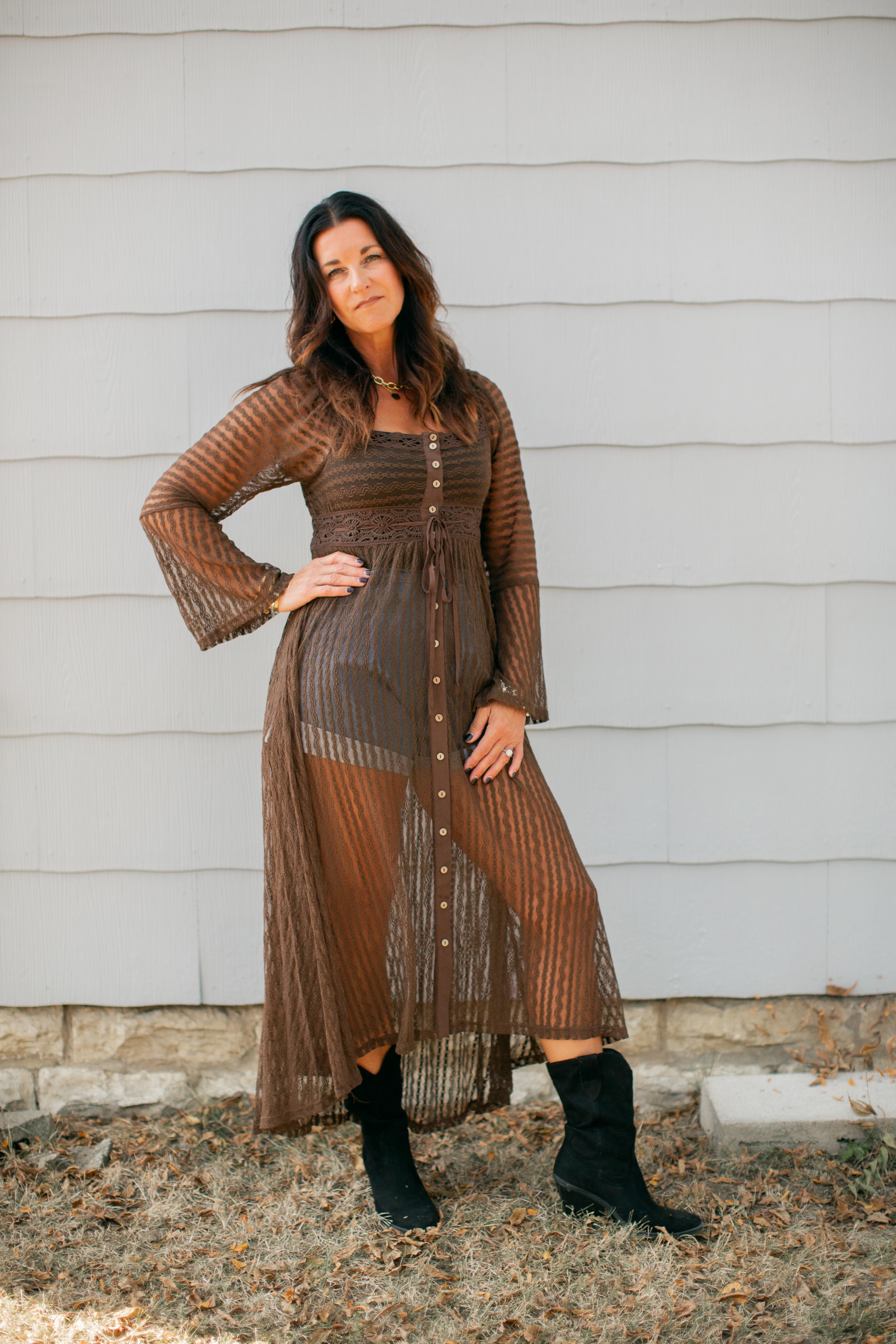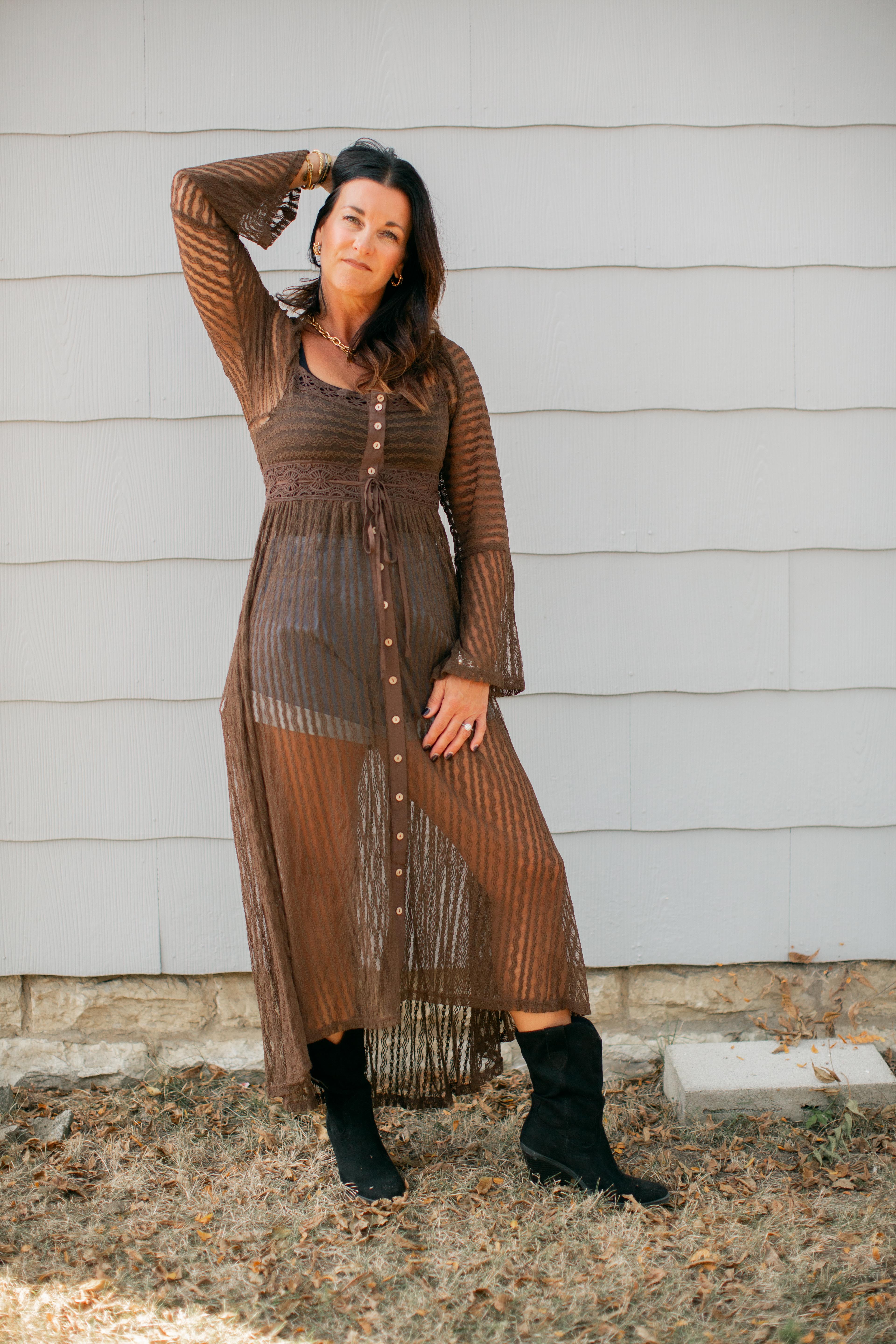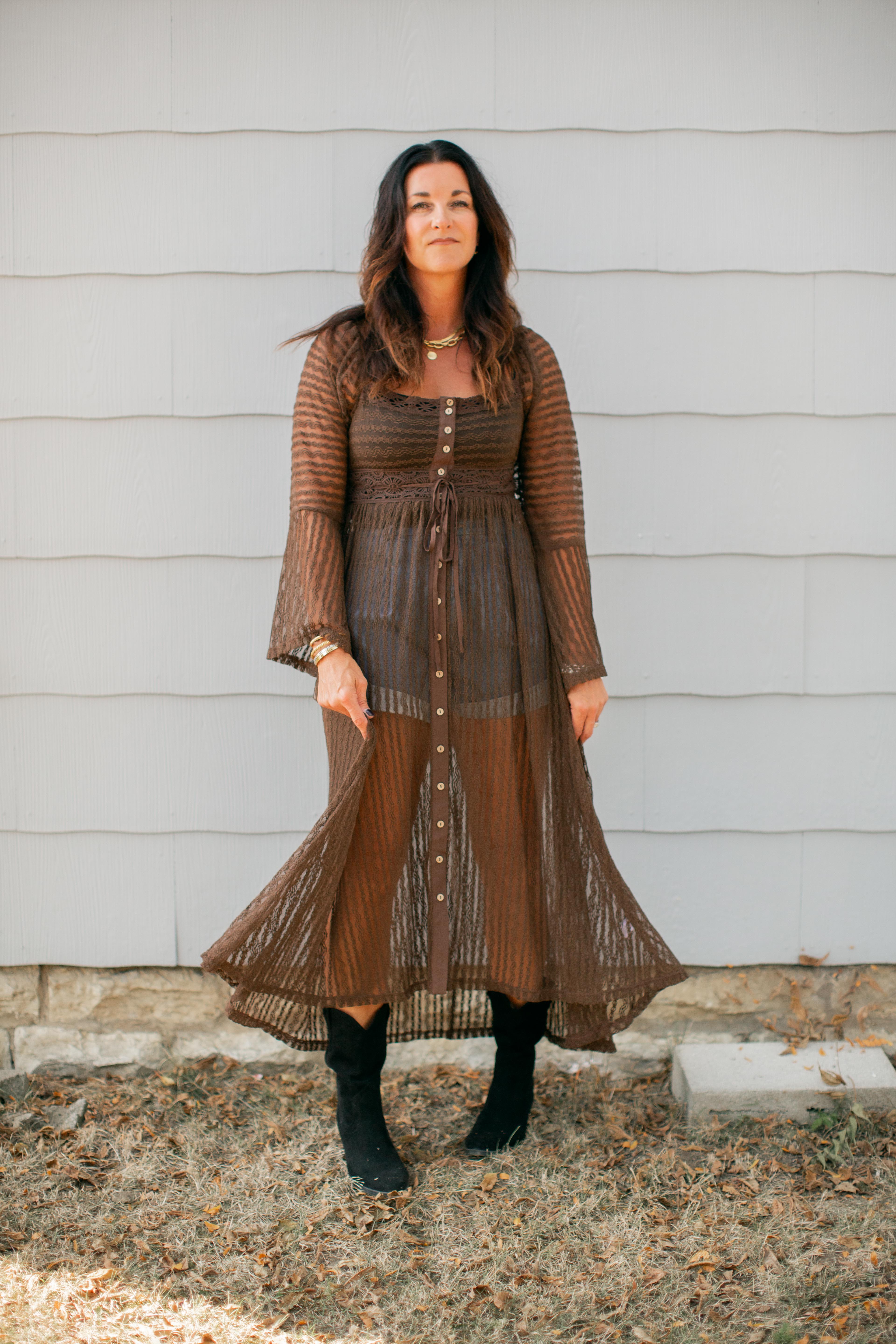 Trinity Taupe Sheer Striped Lace Layering Midi Dress