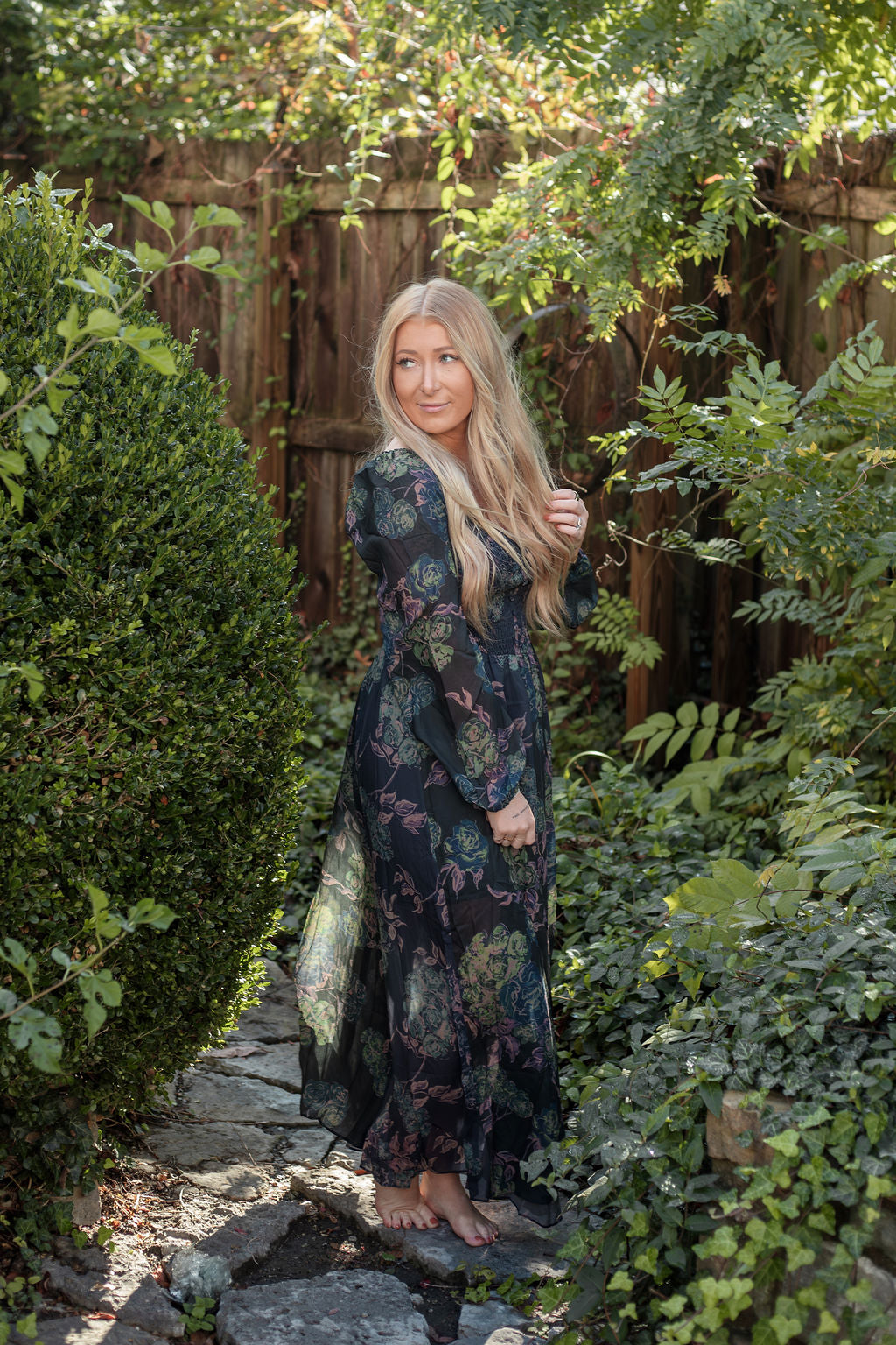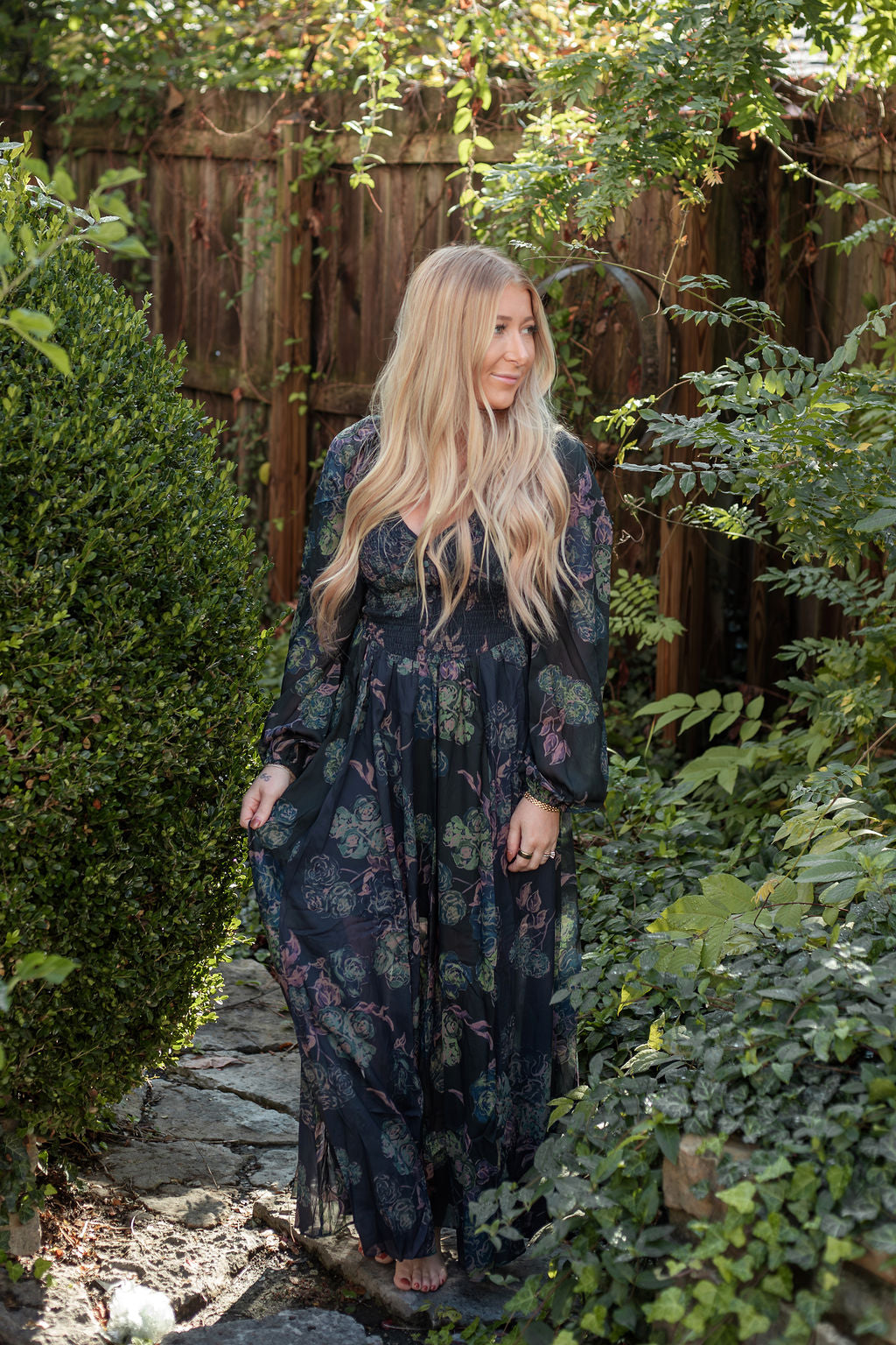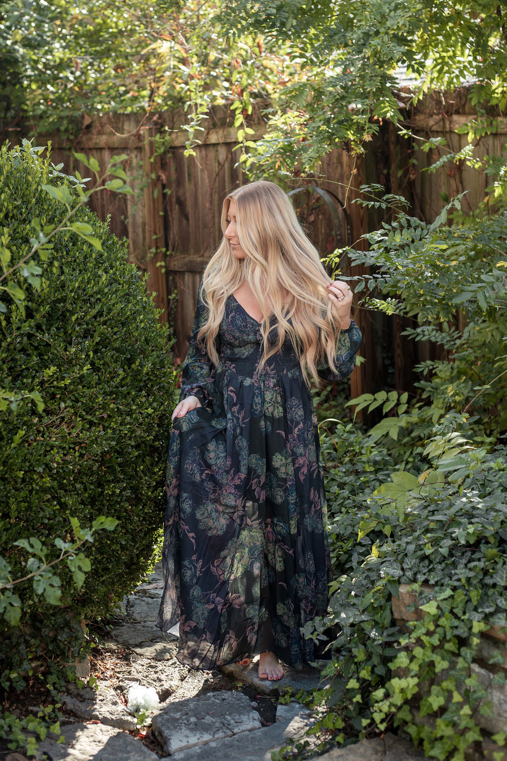 A floral-print woven maxi dress with the following features: Sweetheart neckline. Smocked bodice. Button-loop front closure with fabric buttons. Long bubble sleeves with elastic cuffs. Low back. Partial lining. Ankle length. Fit-and-flare silhouette.
