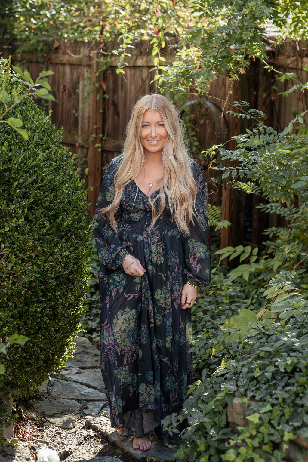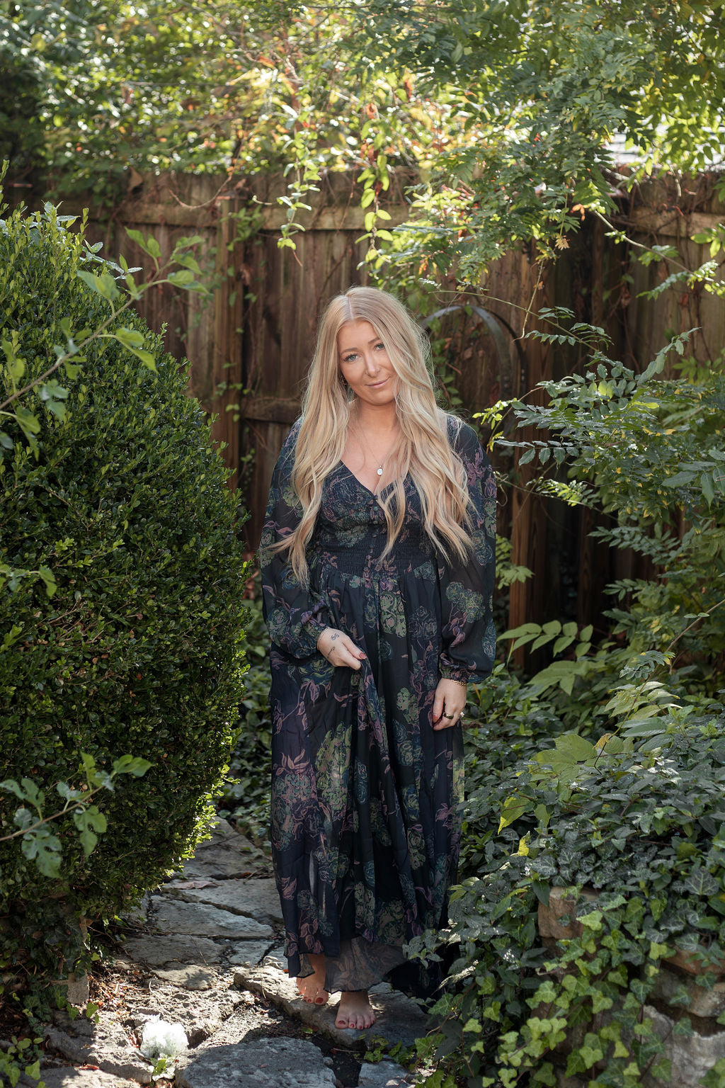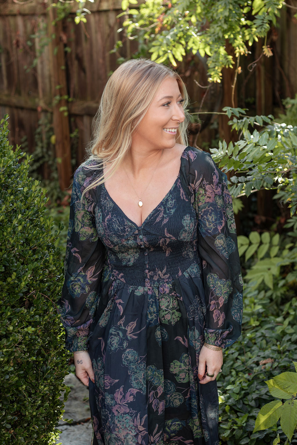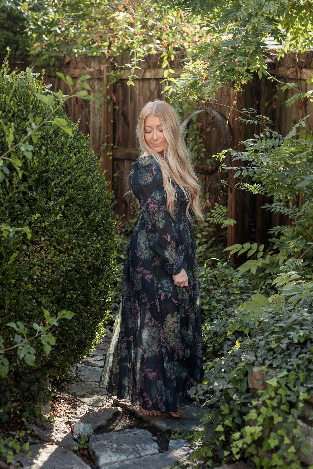 A floral-print woven maxi dress with the following features: Sweetheart neckline. Smocked bodice. Button-loop front closure with fabric buttons. Long bubble sleeves with elastic cuffs. Low back. Partial lining. Ankle length. Fit-and-flare silhouette.
