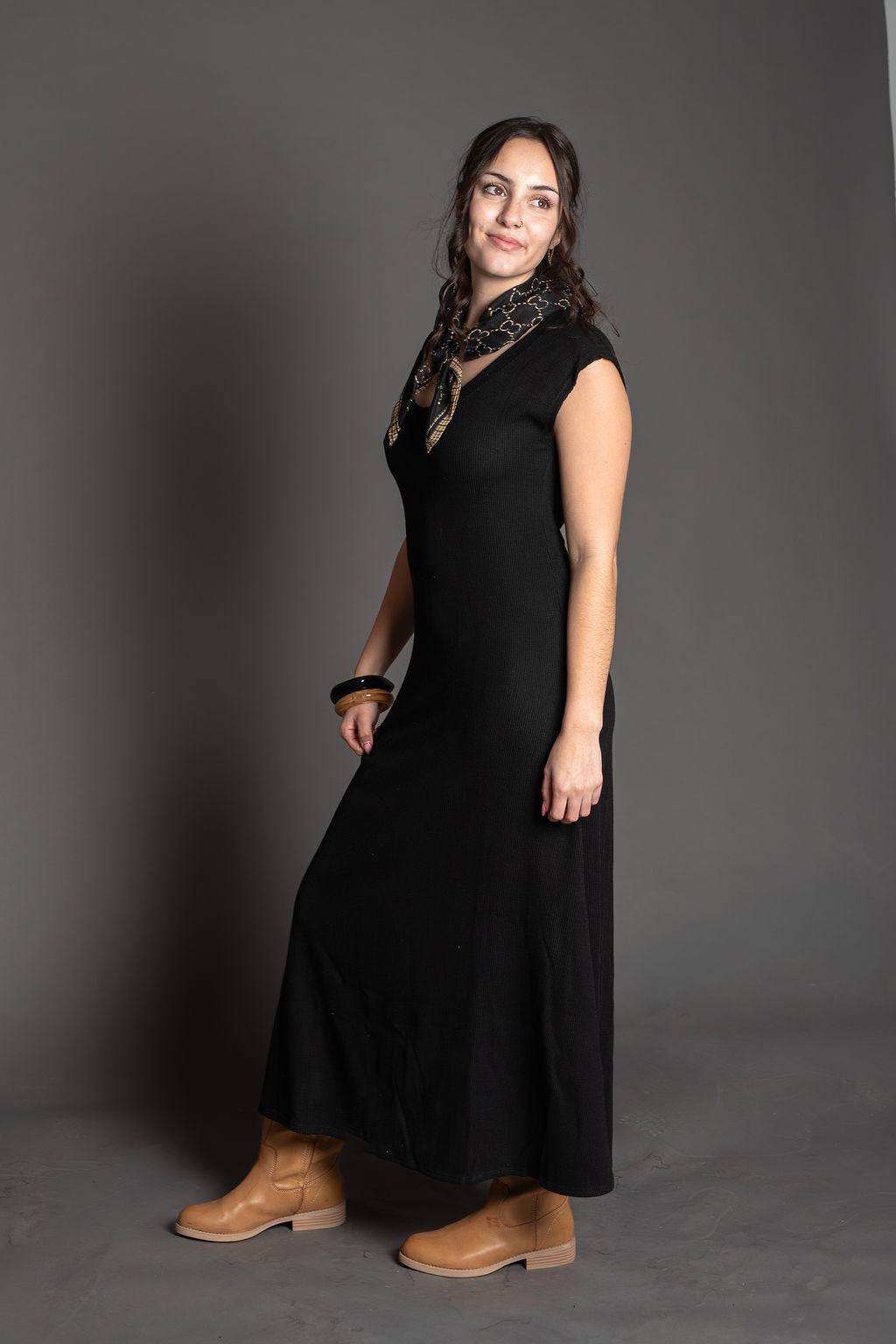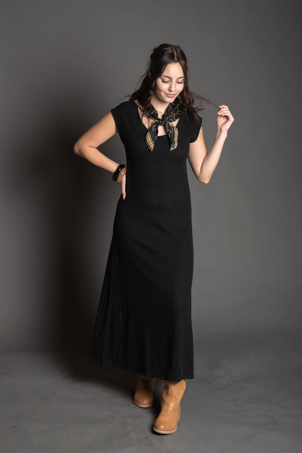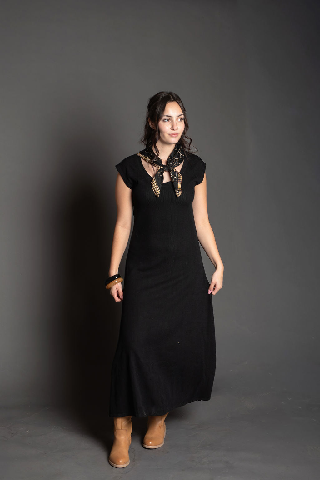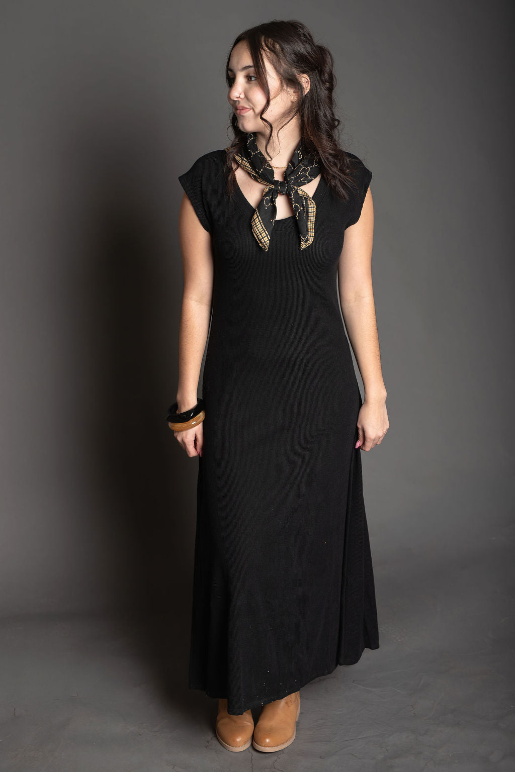 This elegant ribbed knit dress features a classic scoop neckline and comfortable cap sleeves, perfect for effortless everyday wear. The flare midi silhouette creates a flattering, graceful drape while the soft blend of cotton, rayon, and spandex ensures both comfort and durability. Made in the United States with quality construction, this versatile dress is a wardrobe essential that transitions seamlessly from casual to more polished occasions.