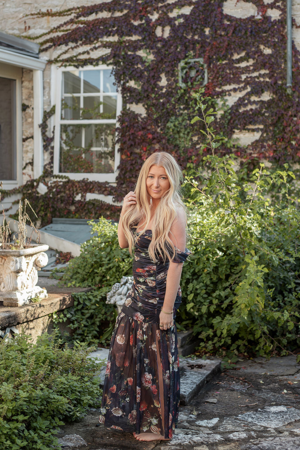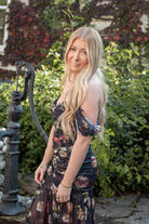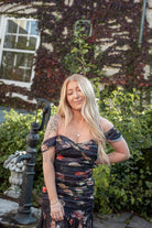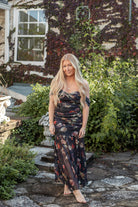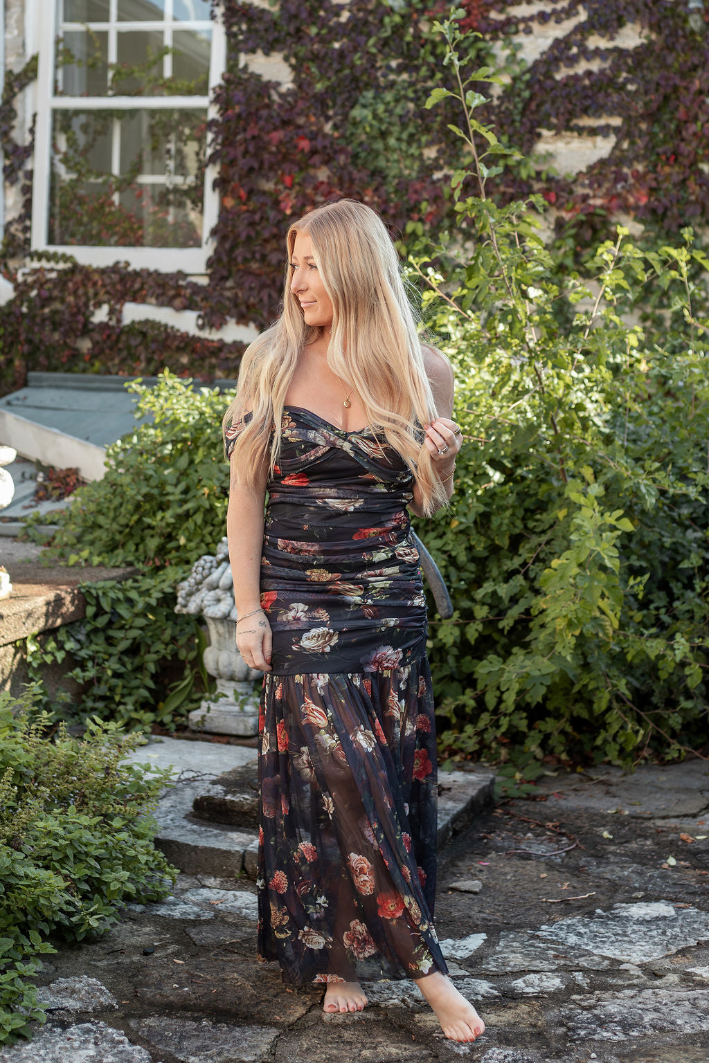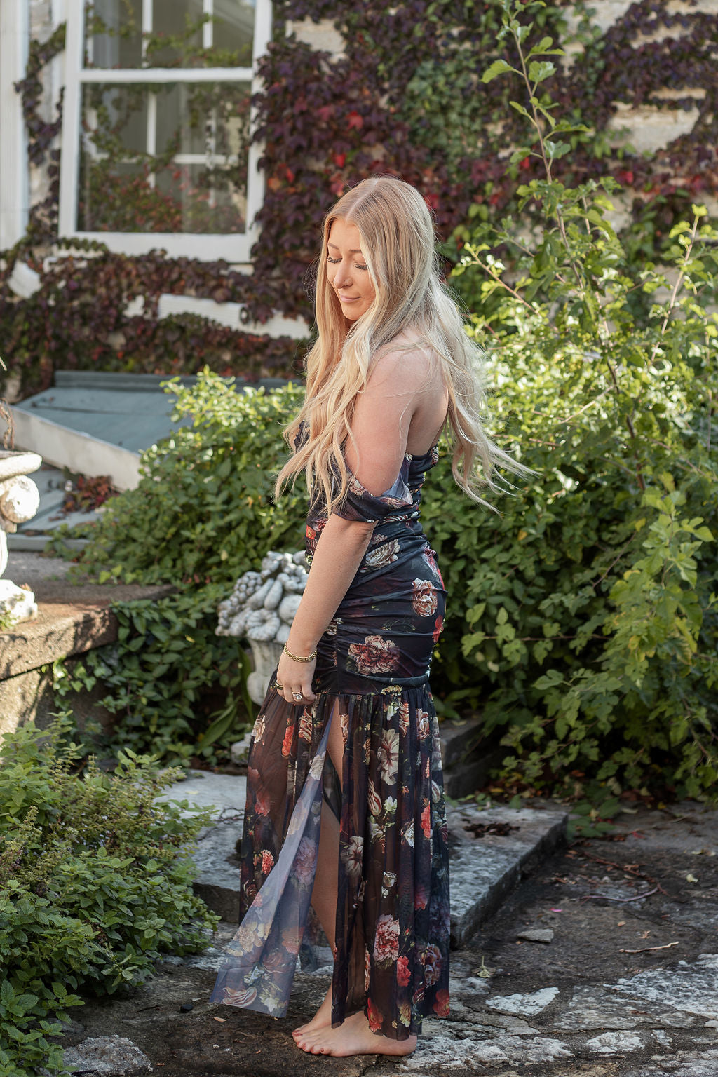 A floral-print mesh maxi dress with the following features: Sweetheart neckline. Ruched bodice with twist detail. Sleeveless with wide straps and off-shoulder option. Low back. Drop waist. Gathered skirt. Side slit. Raw-edge hem. Partial thigh-length lining. Ankle length.