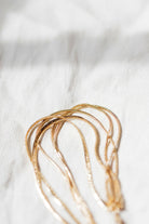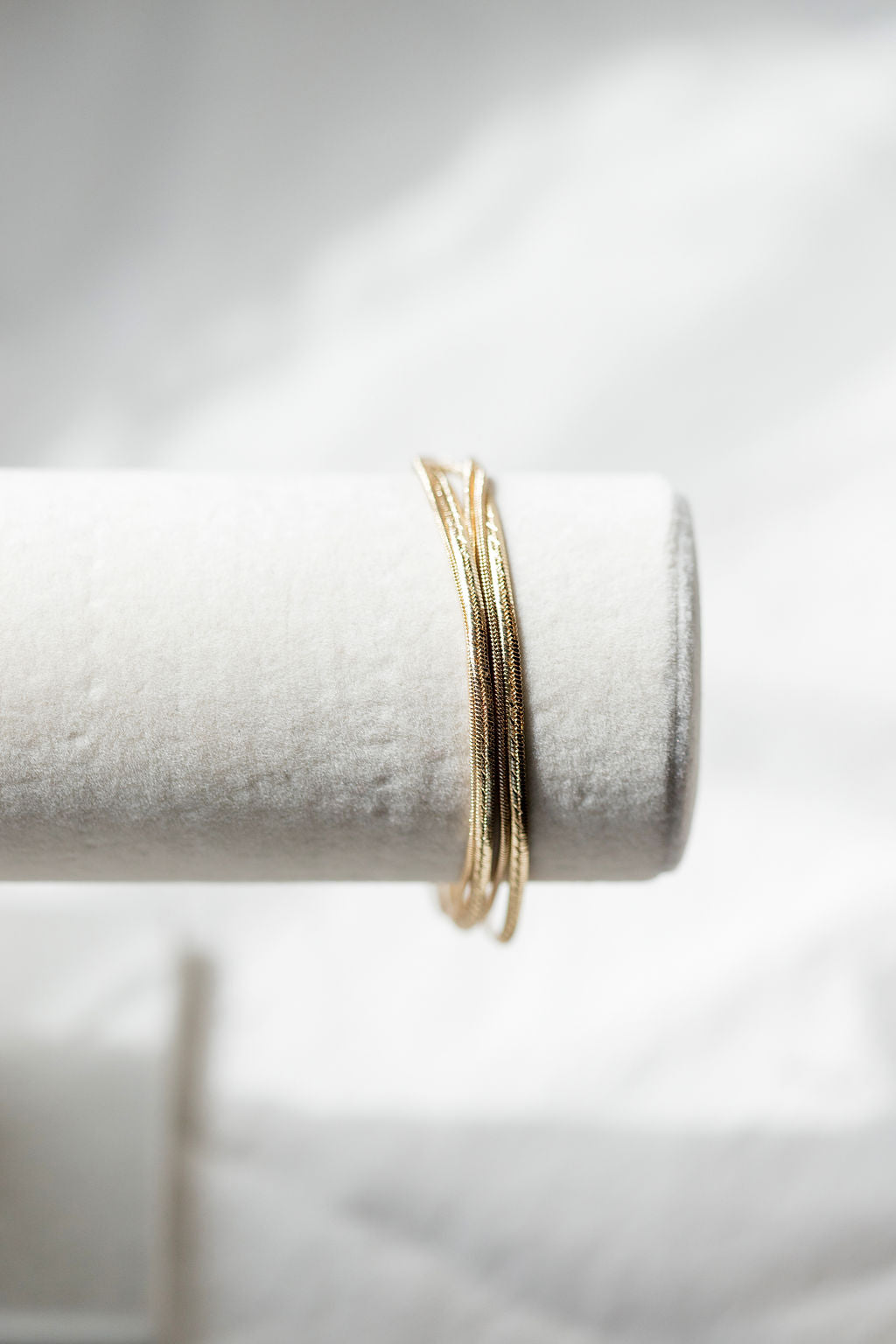 18K gold dipped, this five-strand bracelet is sure to make a statement and elevate any outfit. Shine bright like gold with this must-have accessory! Hypoallergenic and beautiful quality.