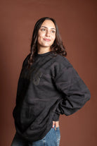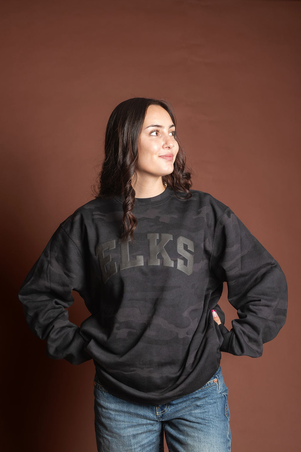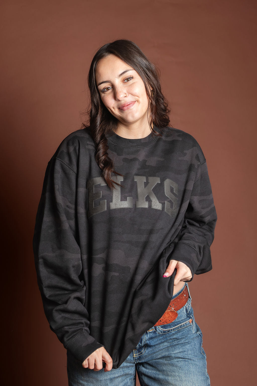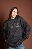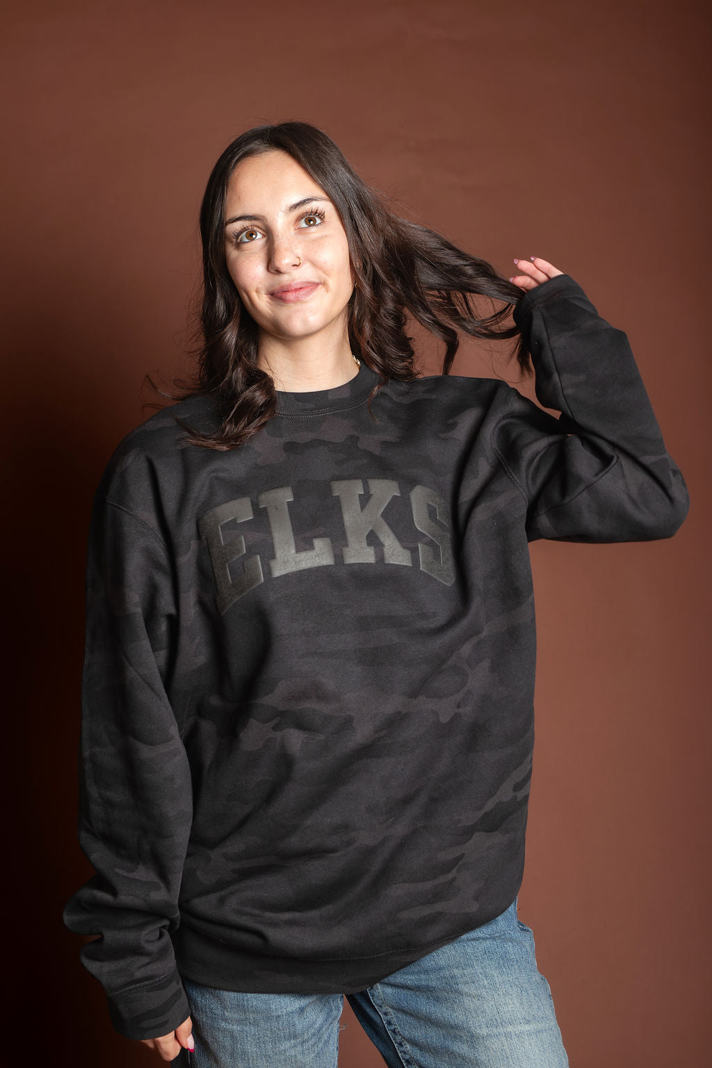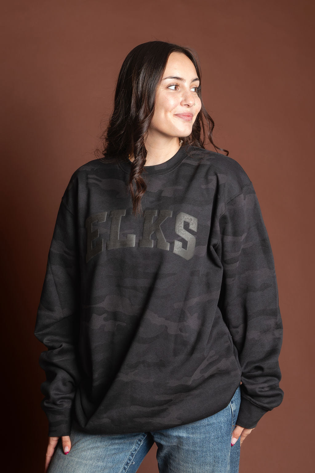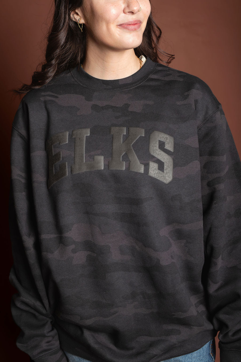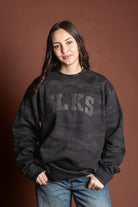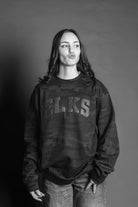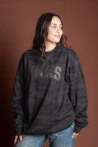 Unisex monochrome charcoal black puff print on black midweight camo crewneck sweatshirt. Subtle and stylish way to show your Elk Pride!