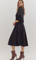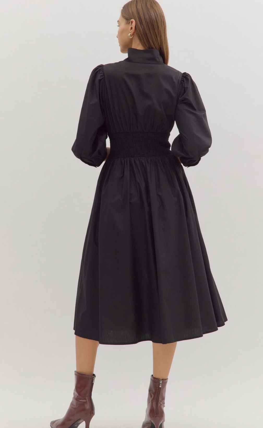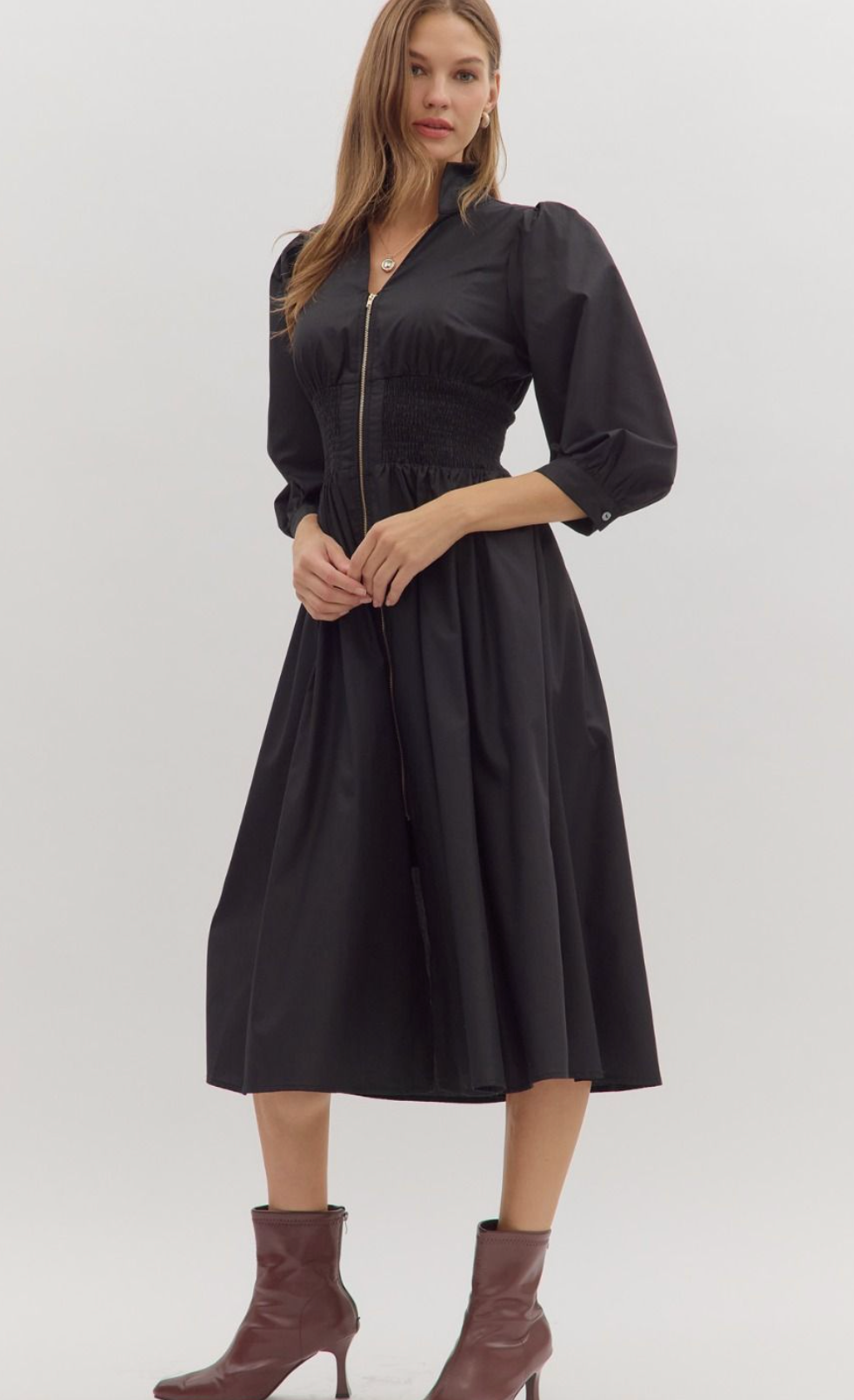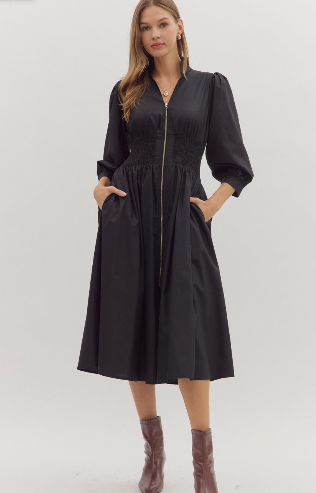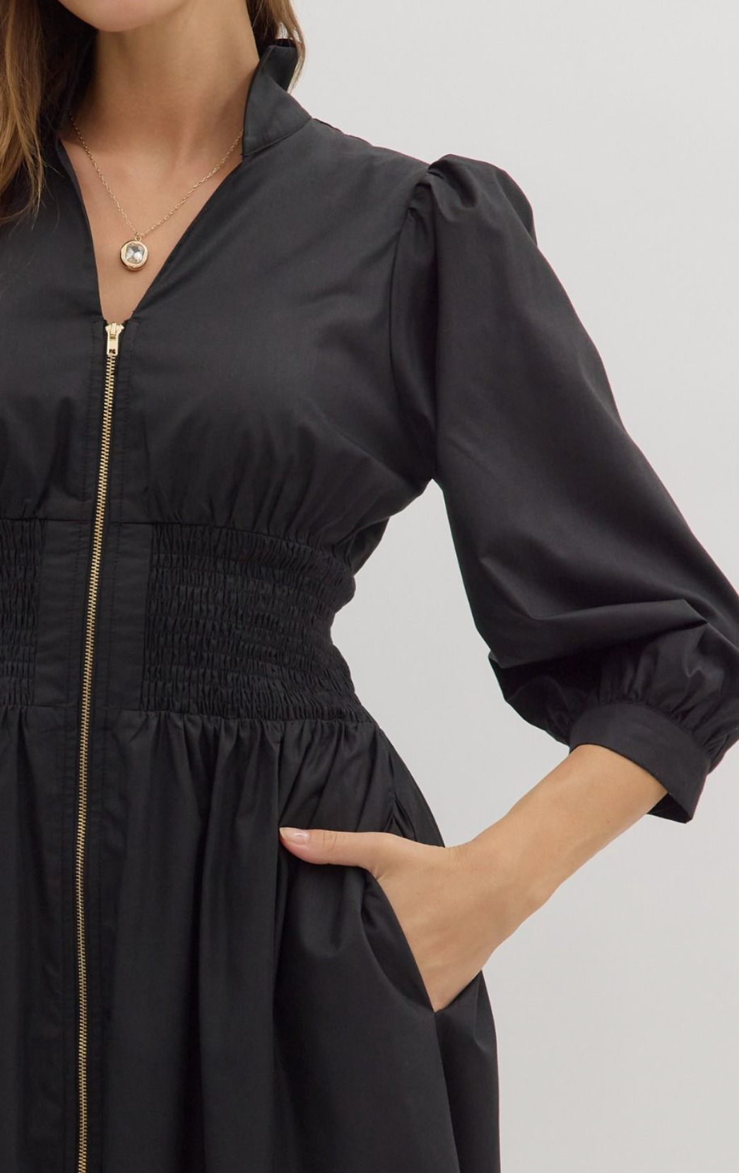 Solid puff 3/4 sleeve midi dress featuring smocked waist detail. Zipper closure at front. Button closure at sleeve. Side pockets. Lined. Woven. Non-sheer. Lightweight.