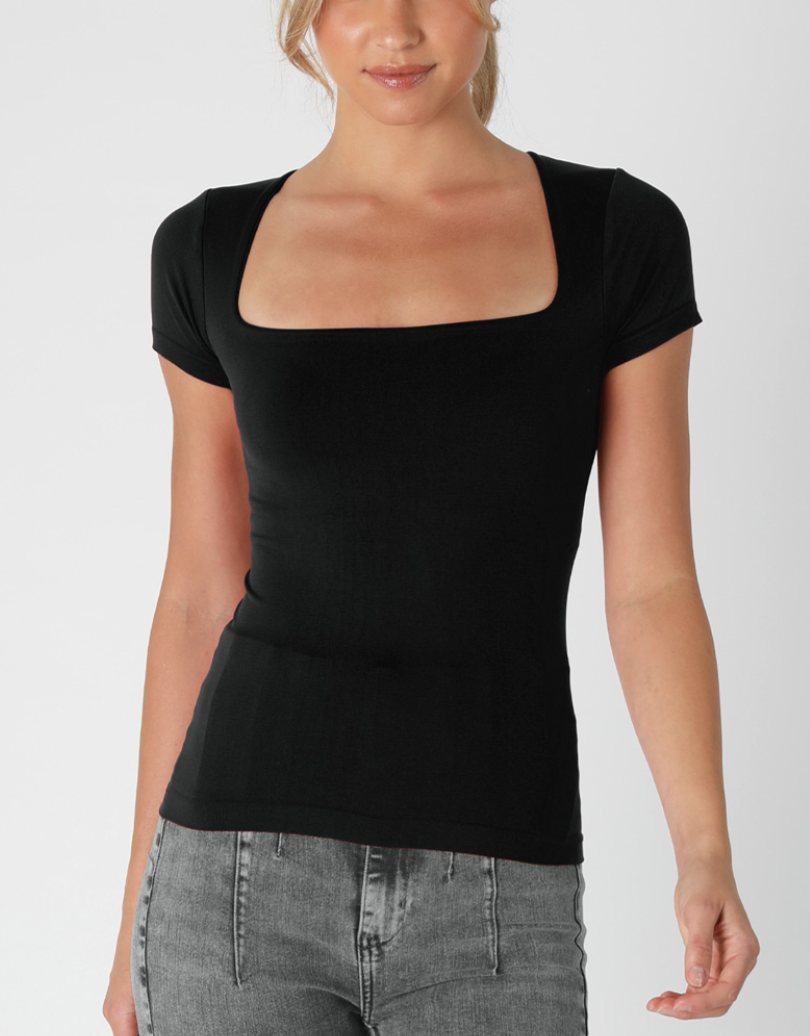 This top features a sleek square neckline that adds a contemporary touch to any outfit. The seamless design ensures a smooth, irritation-free fit, making it ideal for all-day wear.