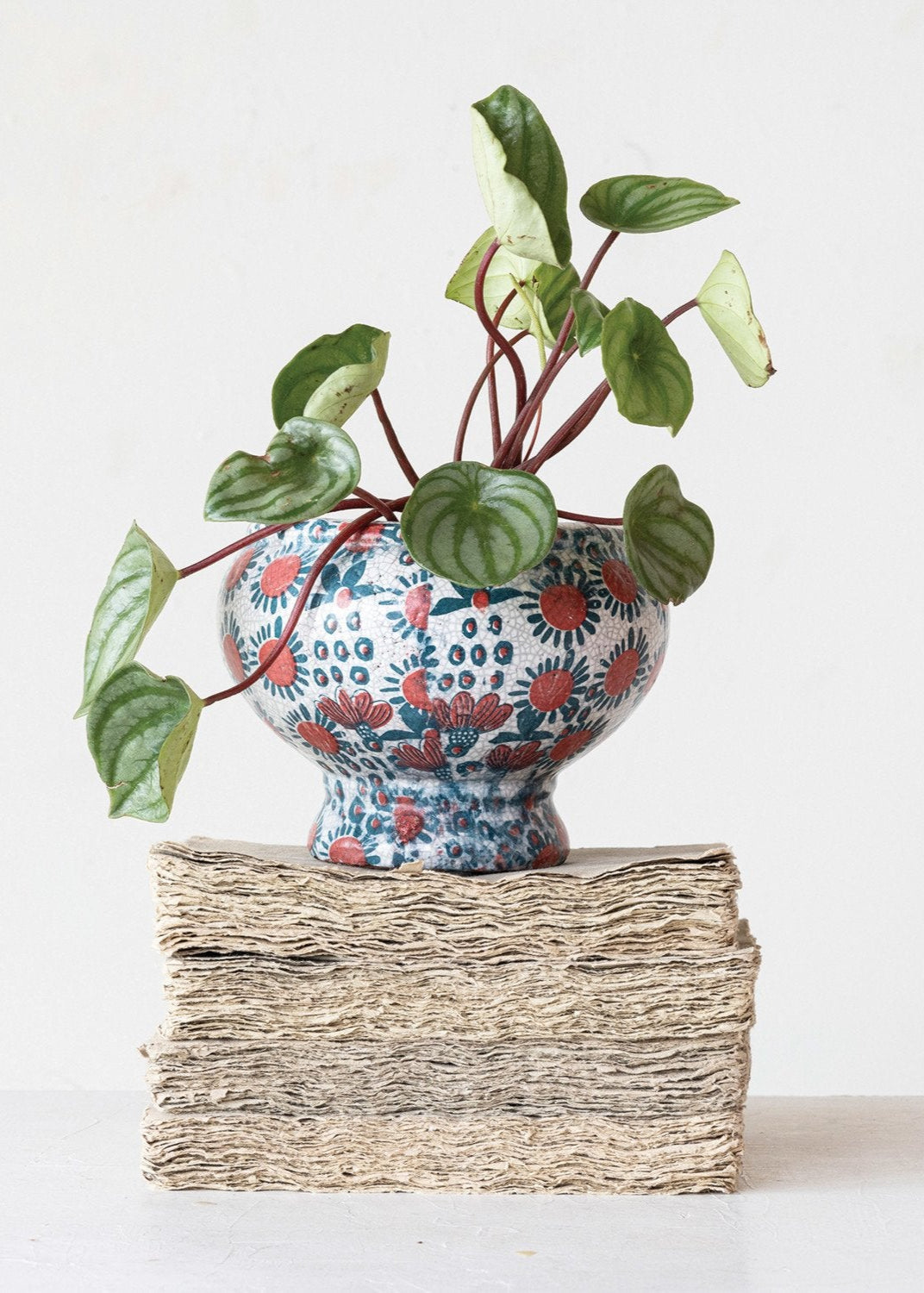 Add some charm and color to the space with this Decorative Printed Terra-cotta Footed Planter, Crackle Glaze, Multicolor. This beautiful planter is made of high-quality terra-cotta that has a printed design that creates a lively and cheerful look. The crackle glaze finish gives it a glossy and smooth surface that reflects light. The multi color palette includes shades of blue, green, yellow, and pink that add a touch of freshness and vibrancy to the planter. It has a round shape and a feat that elevate the planter and provide stability. Use it to display plants or flowers indoors or outdoors.