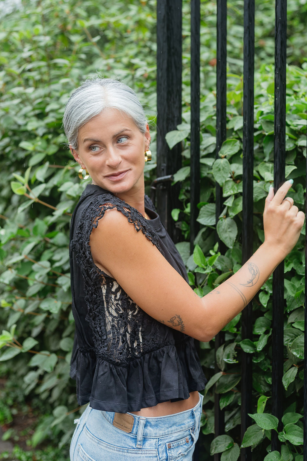 This stunning solid sleeveless top featuring a ribbed round neckline, side lace trim detailing, exposed seams, a ruffled bottom hem and is a slight cropped length.