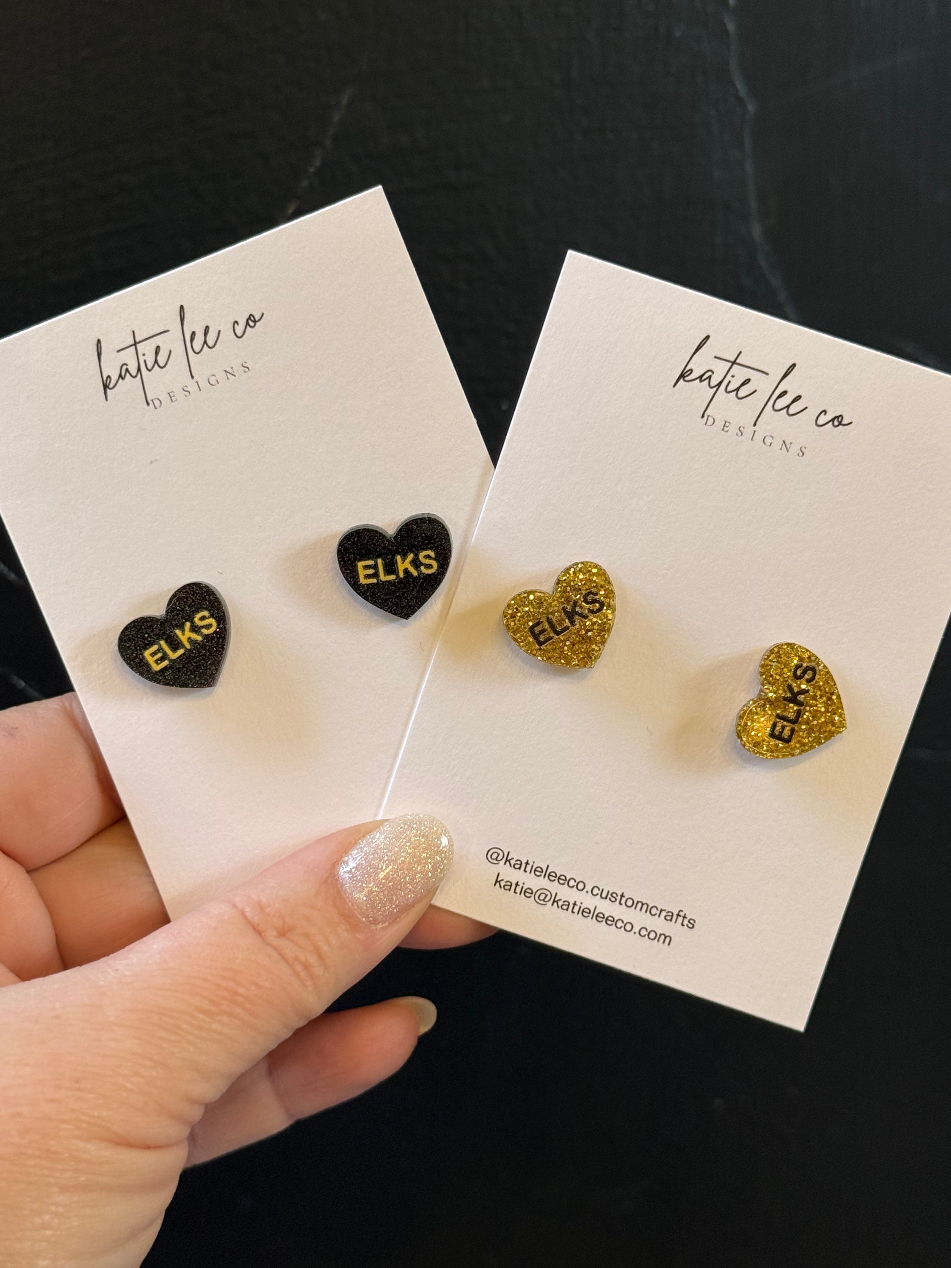 Variety of sparkly black or gold heart earrings, engraved with ELKS.
