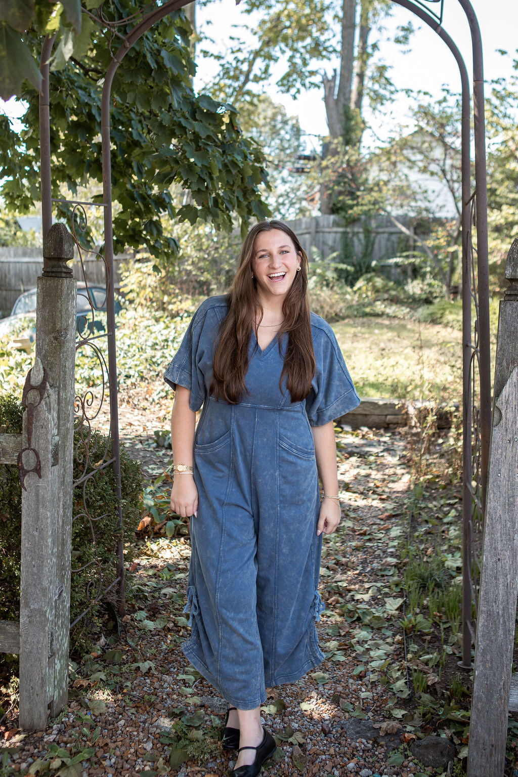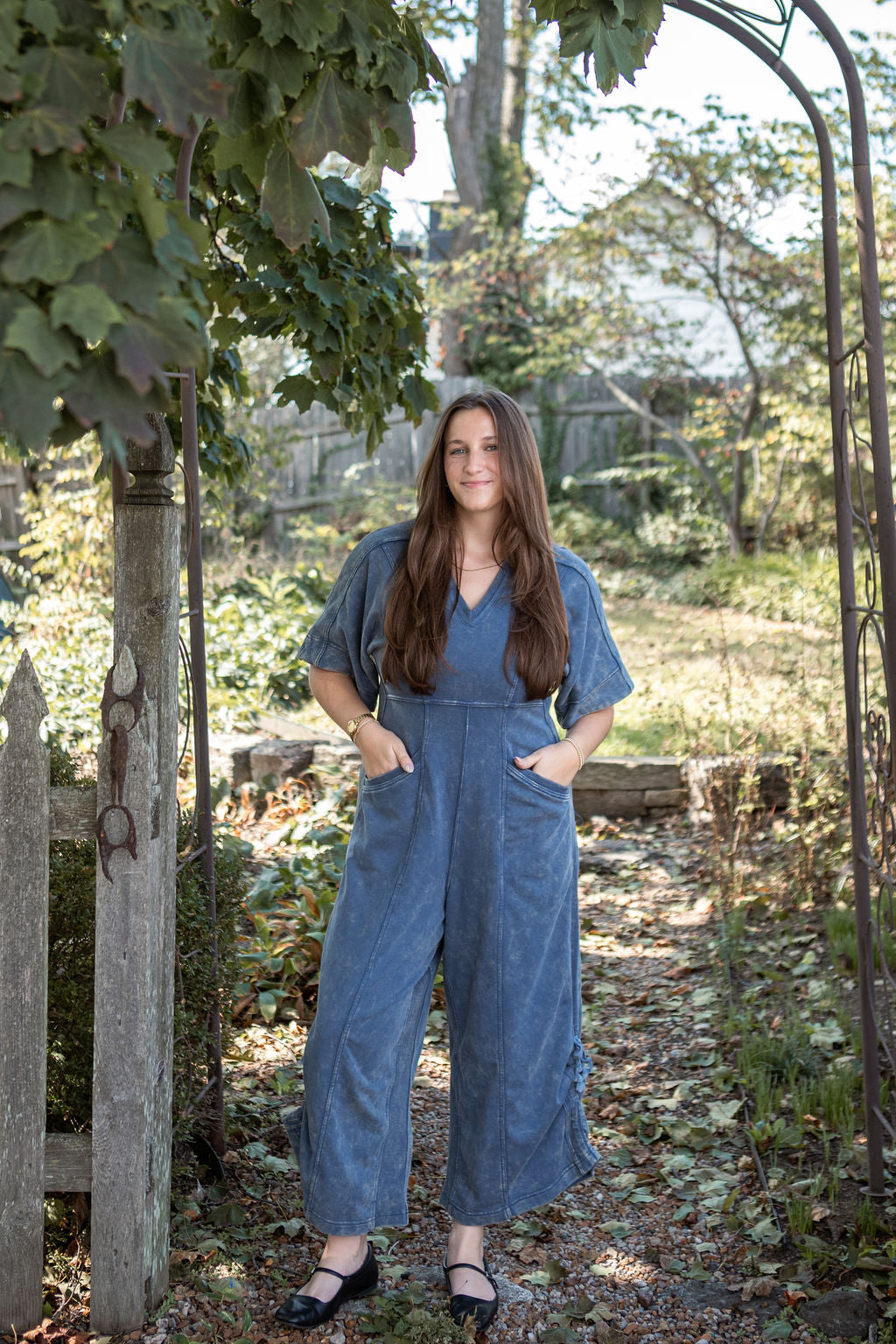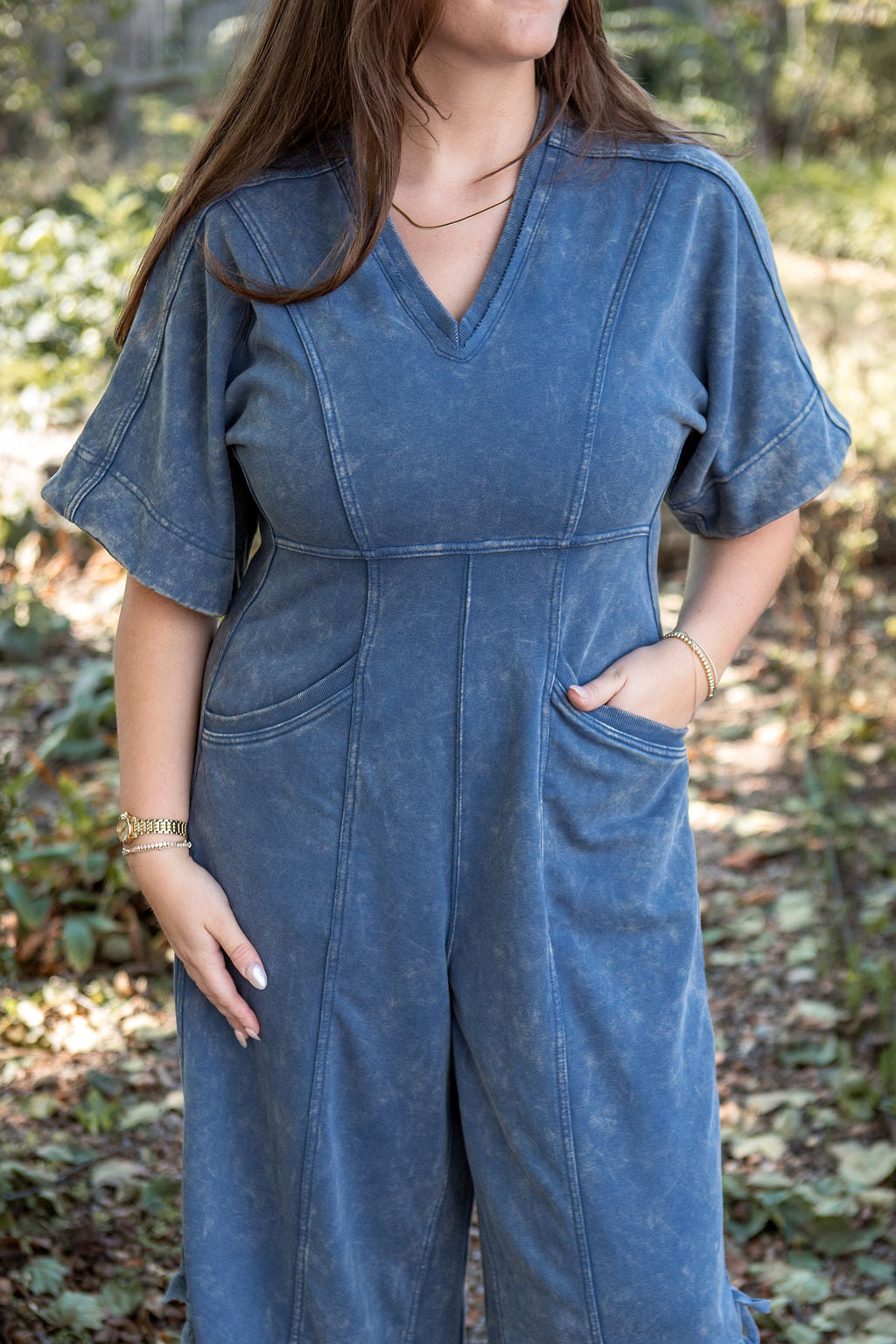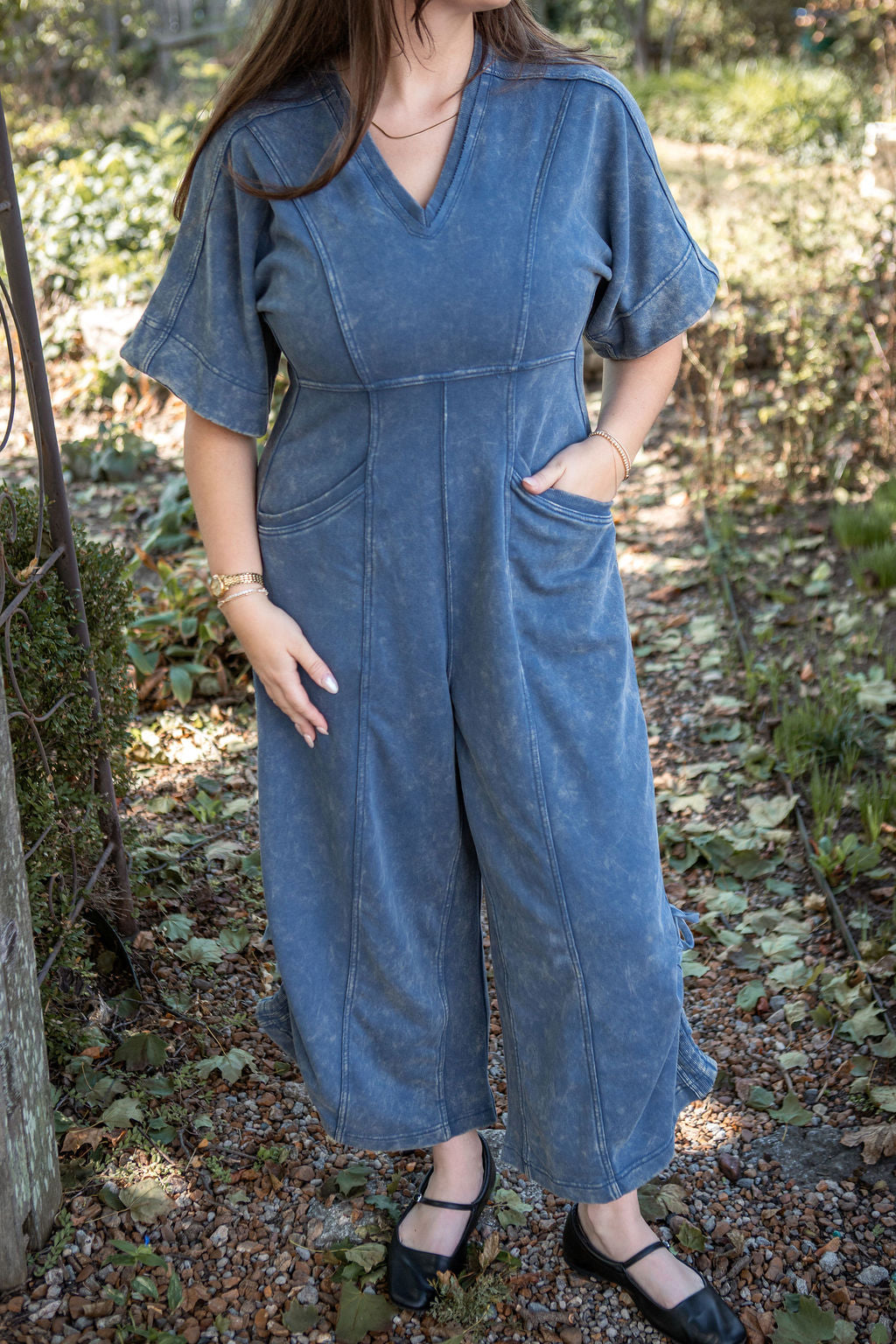 This mineral washed jumpsuit showcases a soft vintage inspired texture, a relaxed wide leg silhouette with adjustable drawstring hems, a flattering V-neckline, oversized short sleeves, a structured panel design, functional pockets, and a back zip closure for an effortlessly stylish and laid back look.