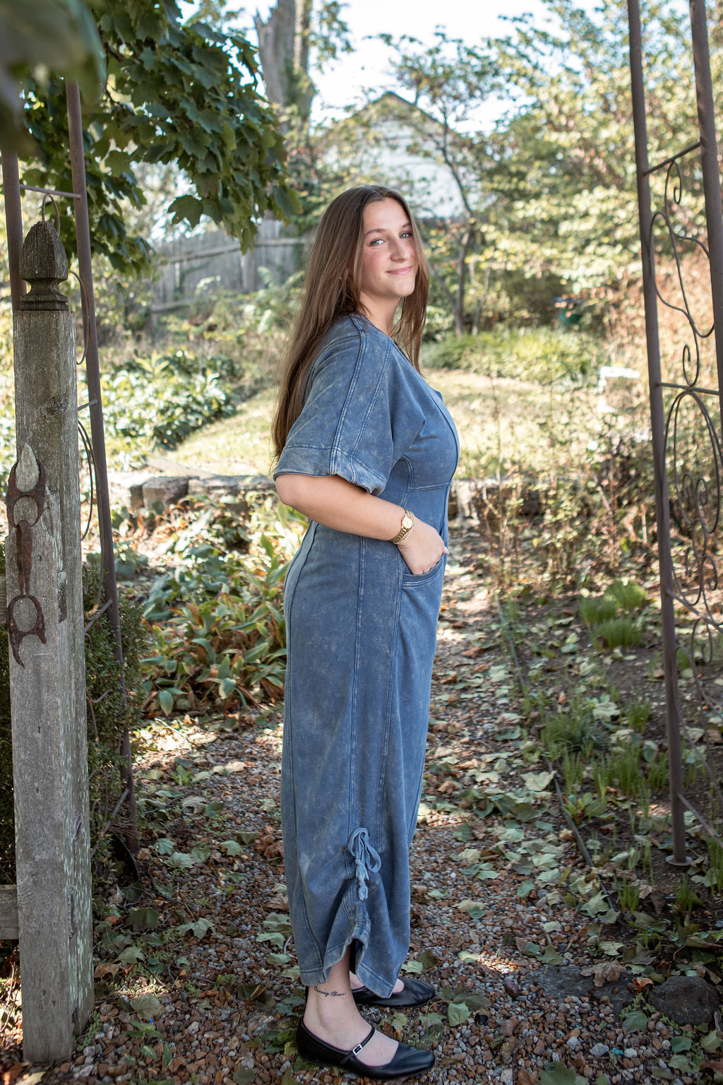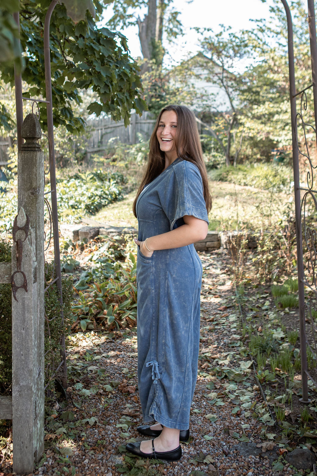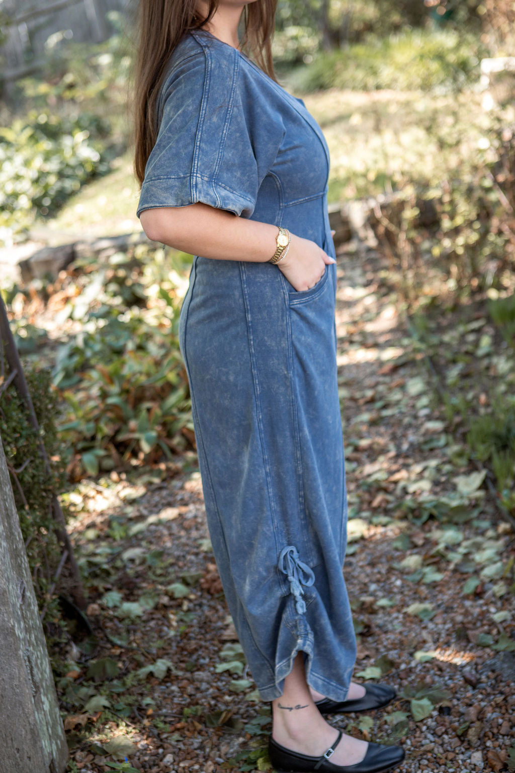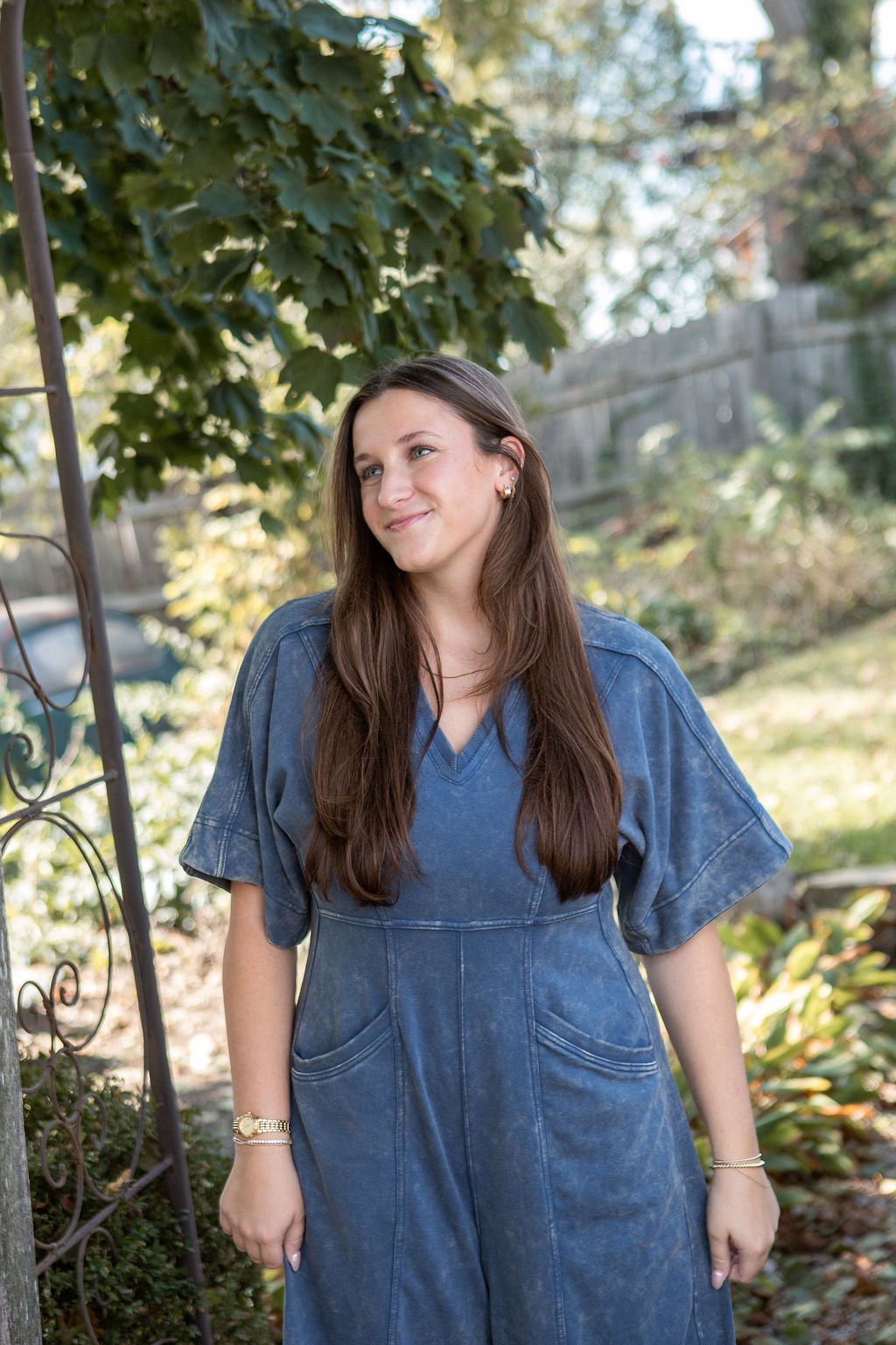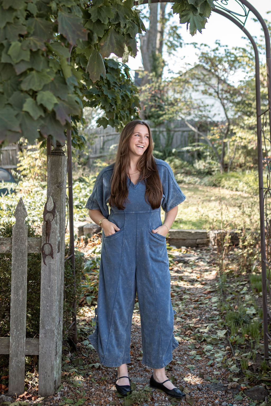This mineral washed jumpsuit showcases a soft vintage inspired texture, a relaxed wide leg silhouette with adjustable drawstring hems, a flattering V-neckline, oversized short sleeves, a structured panel design, functional pockets, and a back zip closure for an effortlessly stylish and laid back look.