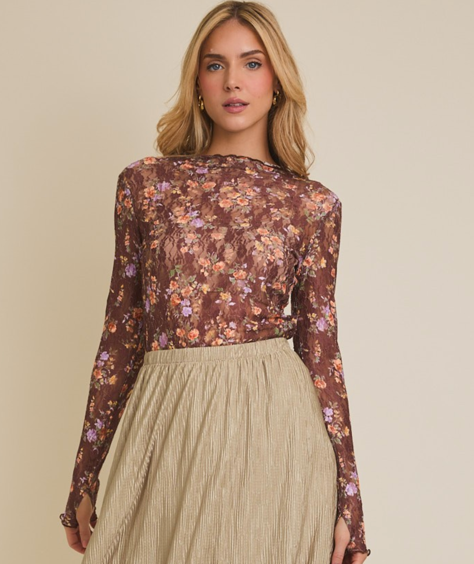 This playful mesh top sports a charming floral print with a subtle ruffle mock neck and long raglan sleeves. It features thumbhole cuffs and a lettuce-edge trim on both the cuffs and hem.