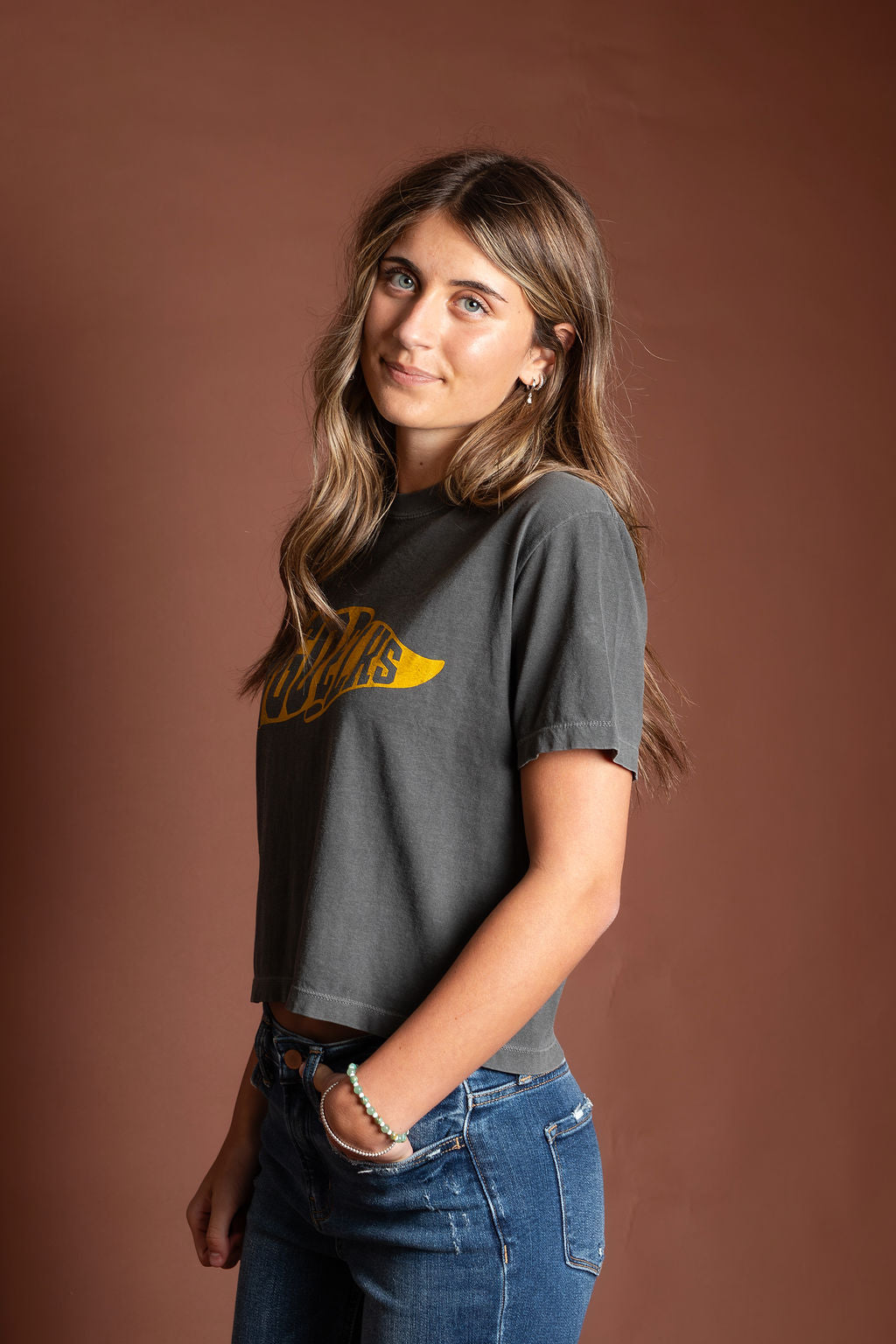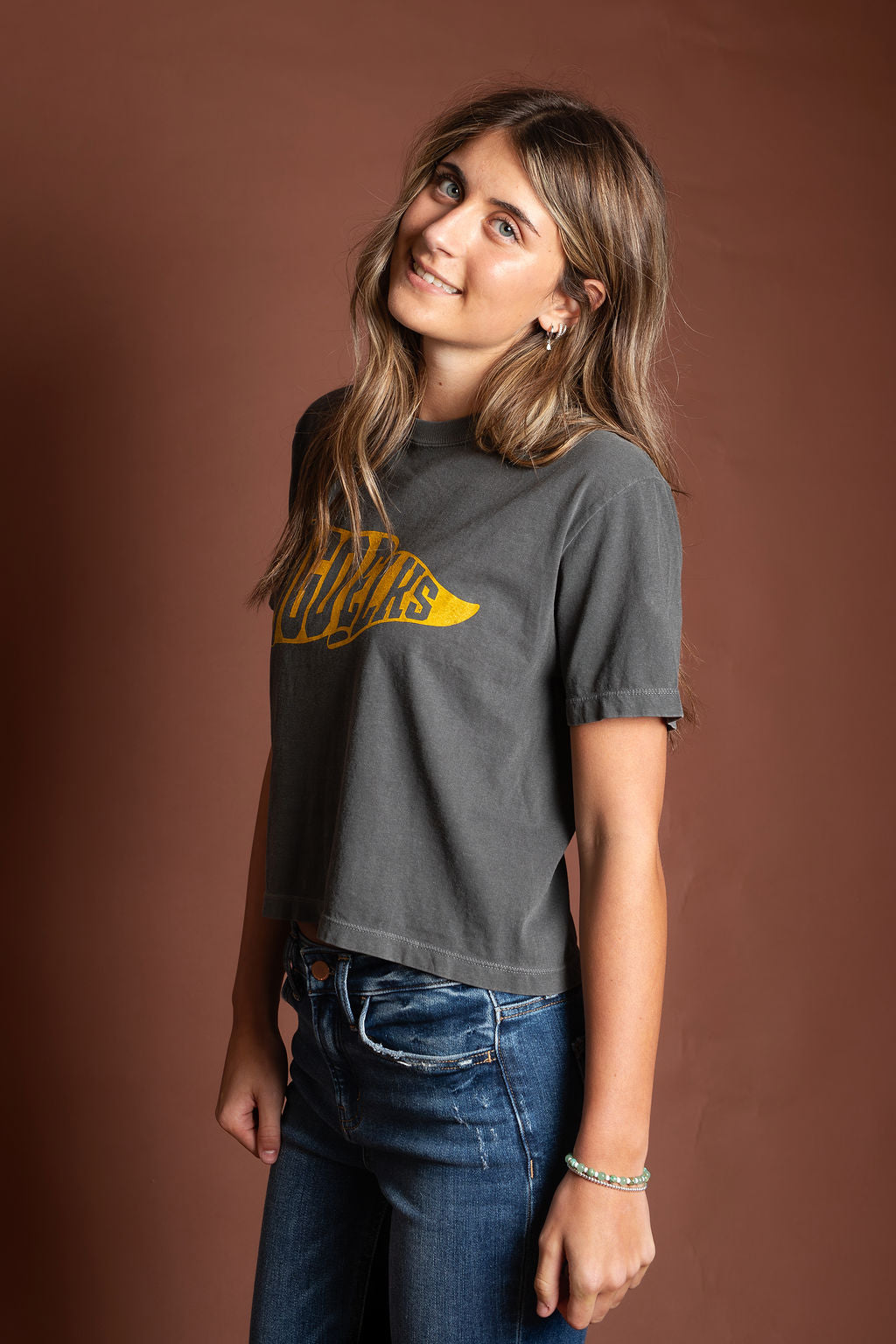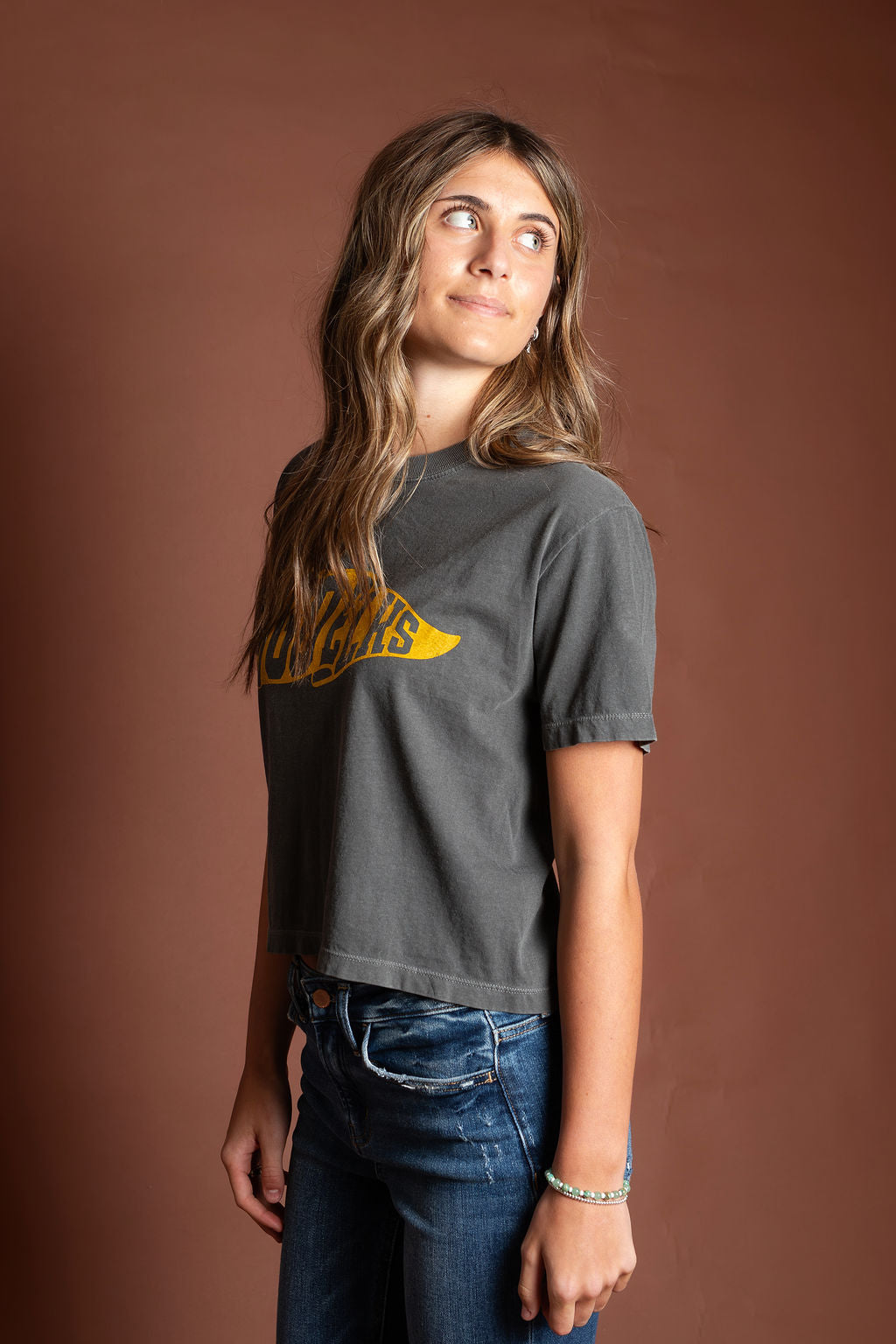 Go Elks!! We love this women's tee - thick cotton boxy, mid-length subtle crop. She hits right at the waist, and runs true to size.