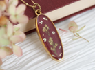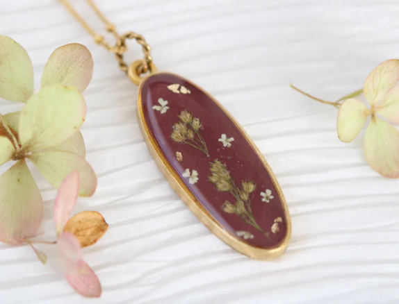 Elevate your style with this sophisticated burgundy and gold-plated long necklace. Featuring an elegant oval pendant crafted from resin and clay, it beautifully encases delicate solidago and Queen Anne's lace flowers. This timeless piece adds a refined touch to any outfit, blending natural charm with graceful design for a standout accessory. Gold plated chain is 30", perfect for sweater weather.