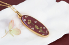 Gold Long Oval Burgundy with Flowers Necklace by Rebecca Noel Designs