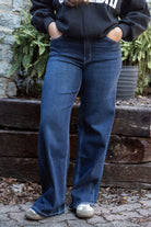 HIGH RISE DARK WASH FULL LENGTH WIDE JEANS COMFORT STRETCH DENIM, HIGH RISE WAIST, FINISHED HIM, FULL LENGTH, WIDE JEANS F. RISE: 10 1/2" / INSEAM: 33" / LEG OPENING: 22"