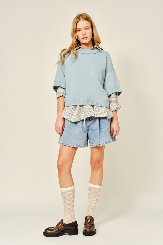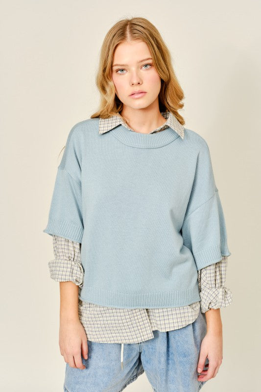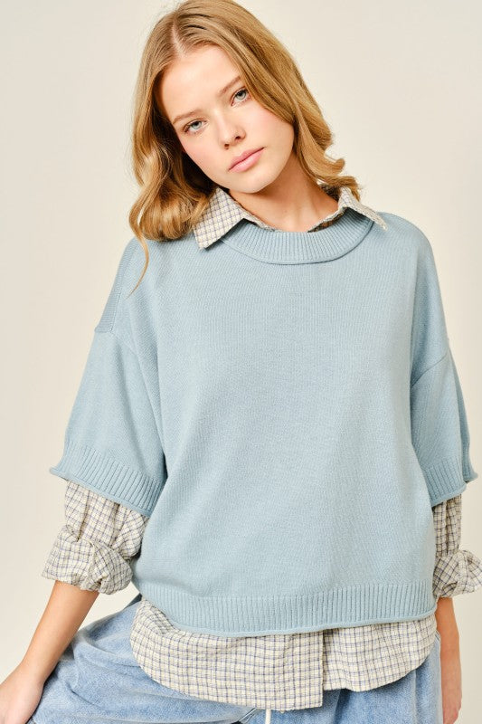 March Light Blue Round Neck Solid Sweater Top