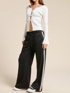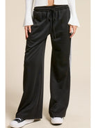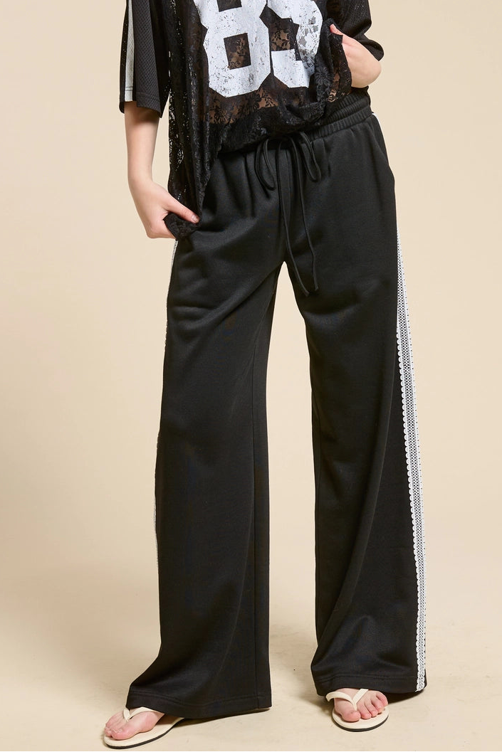 These wide-leg track pants feature contrast lace trim detailing along the sides, a full-length silhouette, and a mid-rise elasticized waistband with an adjustable drawstring for a perfect fit. Designed with functional side pockets for convenience, the lace contrast adds a feminine touch to this sporty-chic staple.