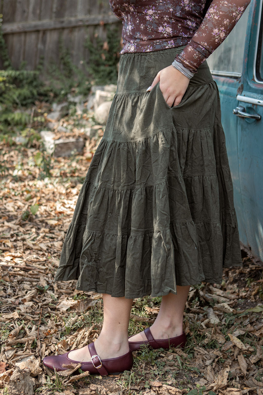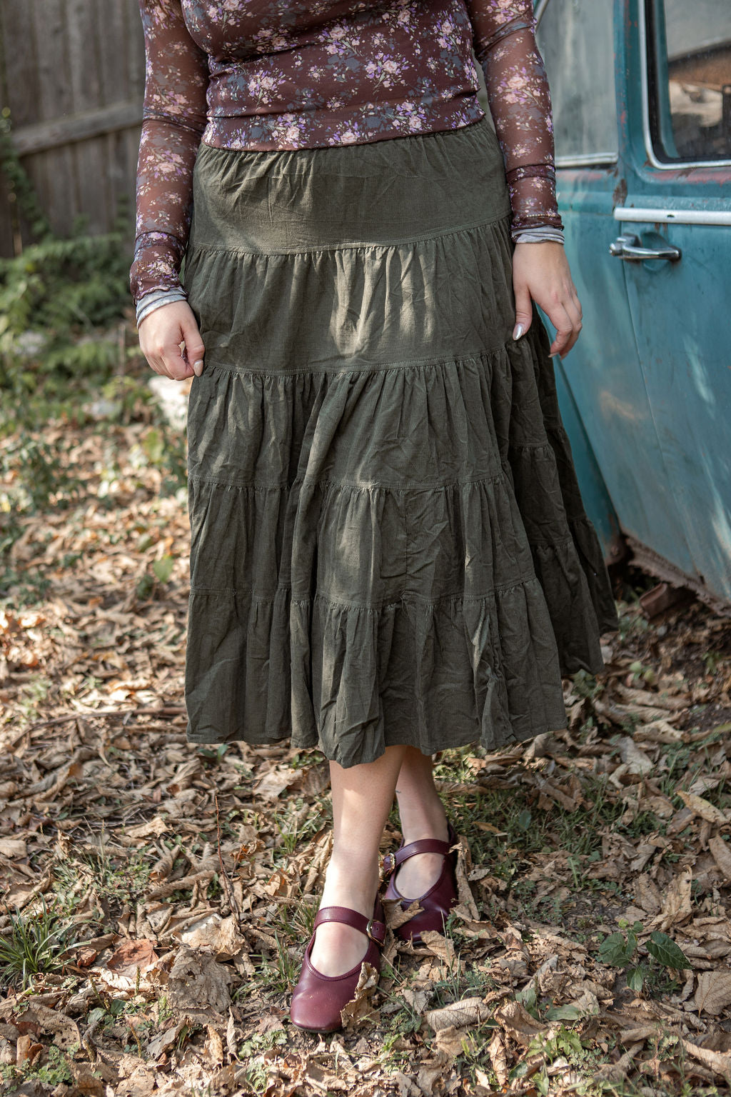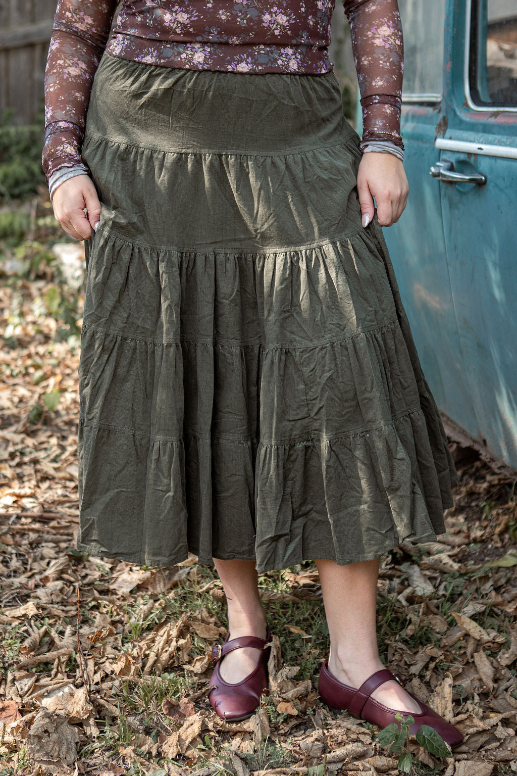 Its tiered silhouette adds a graceful flow to effortless style, making it perfect for crisp autumn days. Whether you're dressing up or down, this cotton skirt brings a timeless touch to your wardrobe.