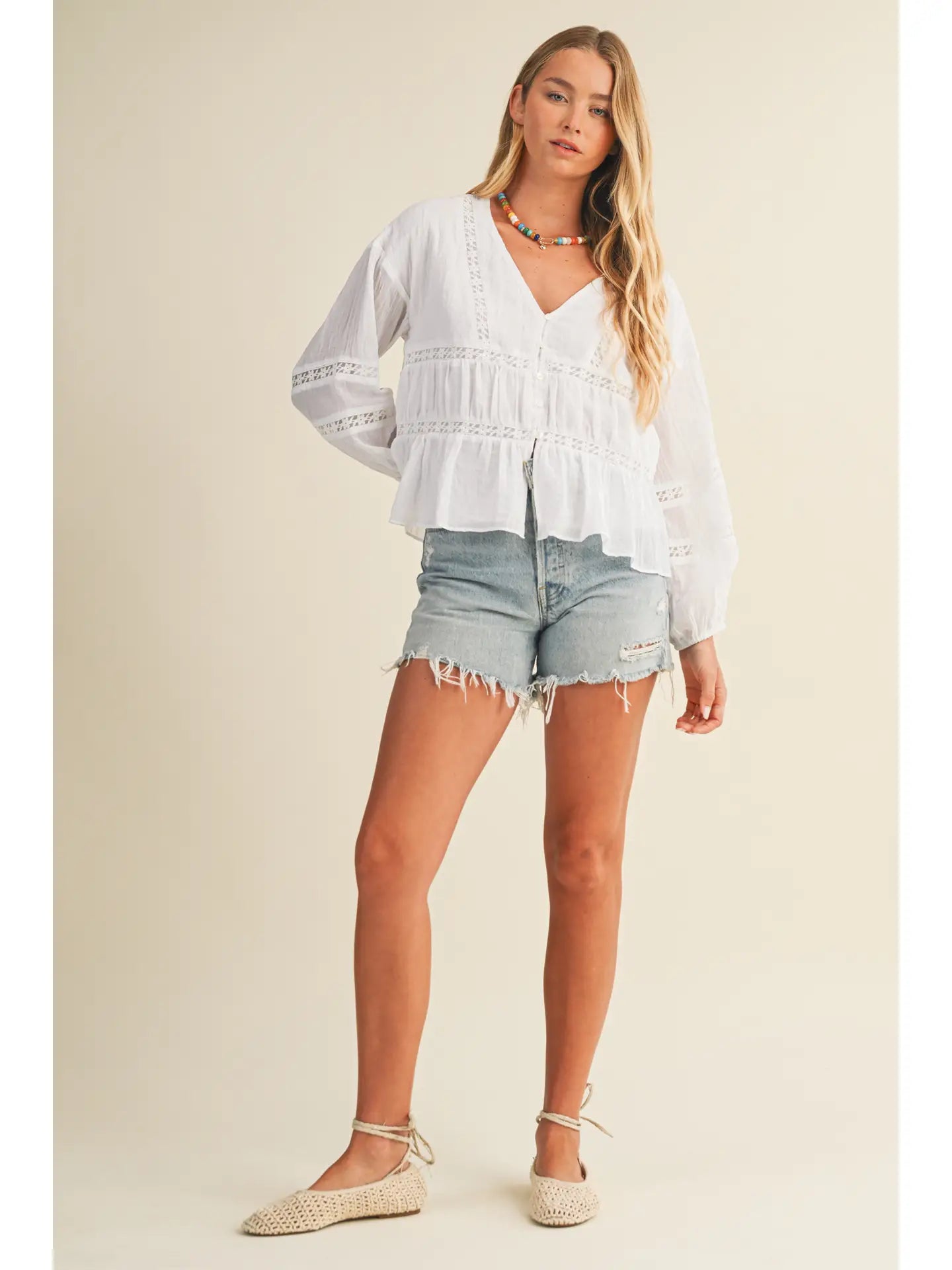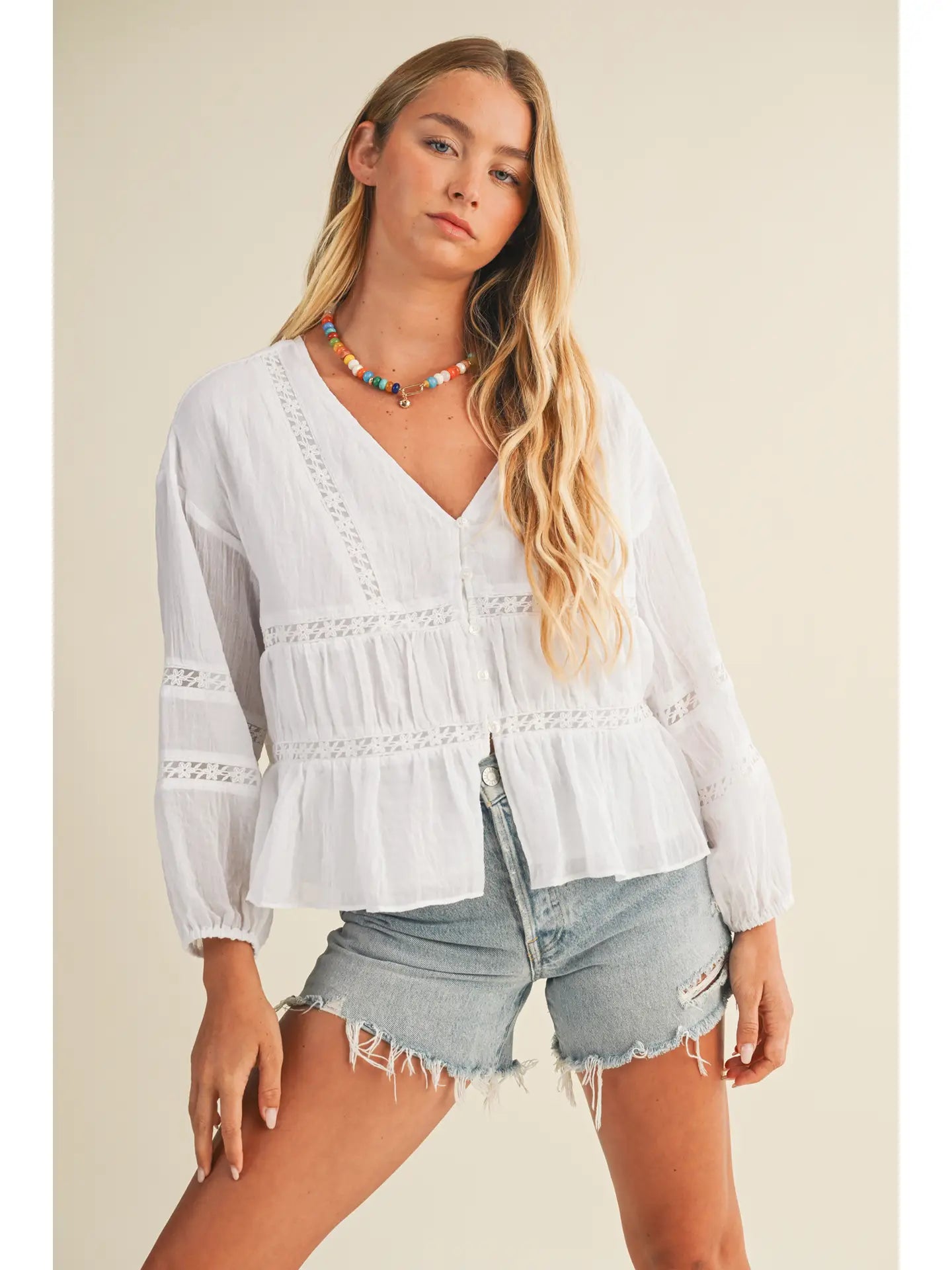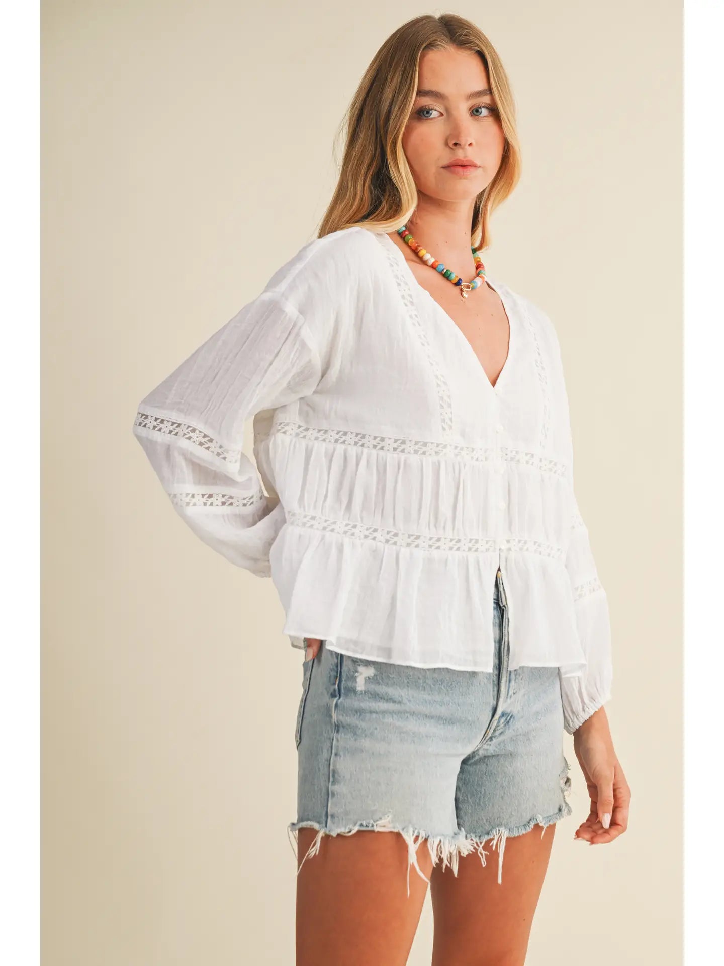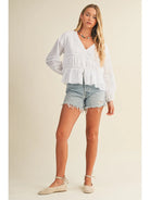Elevate your everyday wardrobe with this charming white V-neck blouse. The delicate ruffle detailing at the neckline adds a touch of feminine flair, while the classic V-neckline flatters any frame. Perfect for layering or wearing solo, this versatile piece transitions seamlessly from office to weekend. Soft and comfortable, it's an essential addition to any closet.