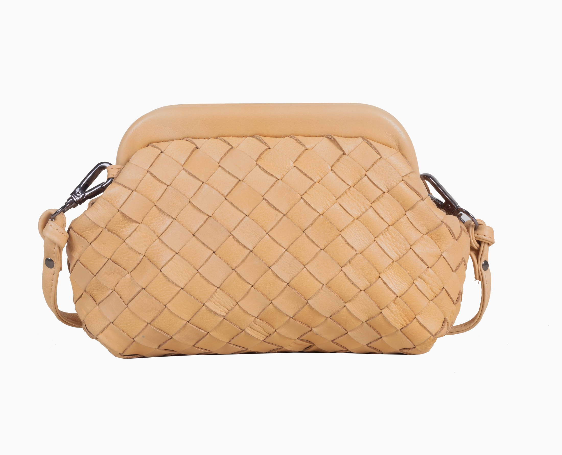 The PIA hand-crafted woven leather clutch is a striking luxe specialty item that stands apart from most others. Natural cowhide within our best-selling Super Soft Nappa leather, PIA is a cloud-like, clutch-style purse featuring a leather-covered, structured frame, and unique detachable shoulder strap. In addition to the stunning woven exterior, the interior is quite roomy. Wear it as a clutch, a crossbody, or a shoulder bag day or night.