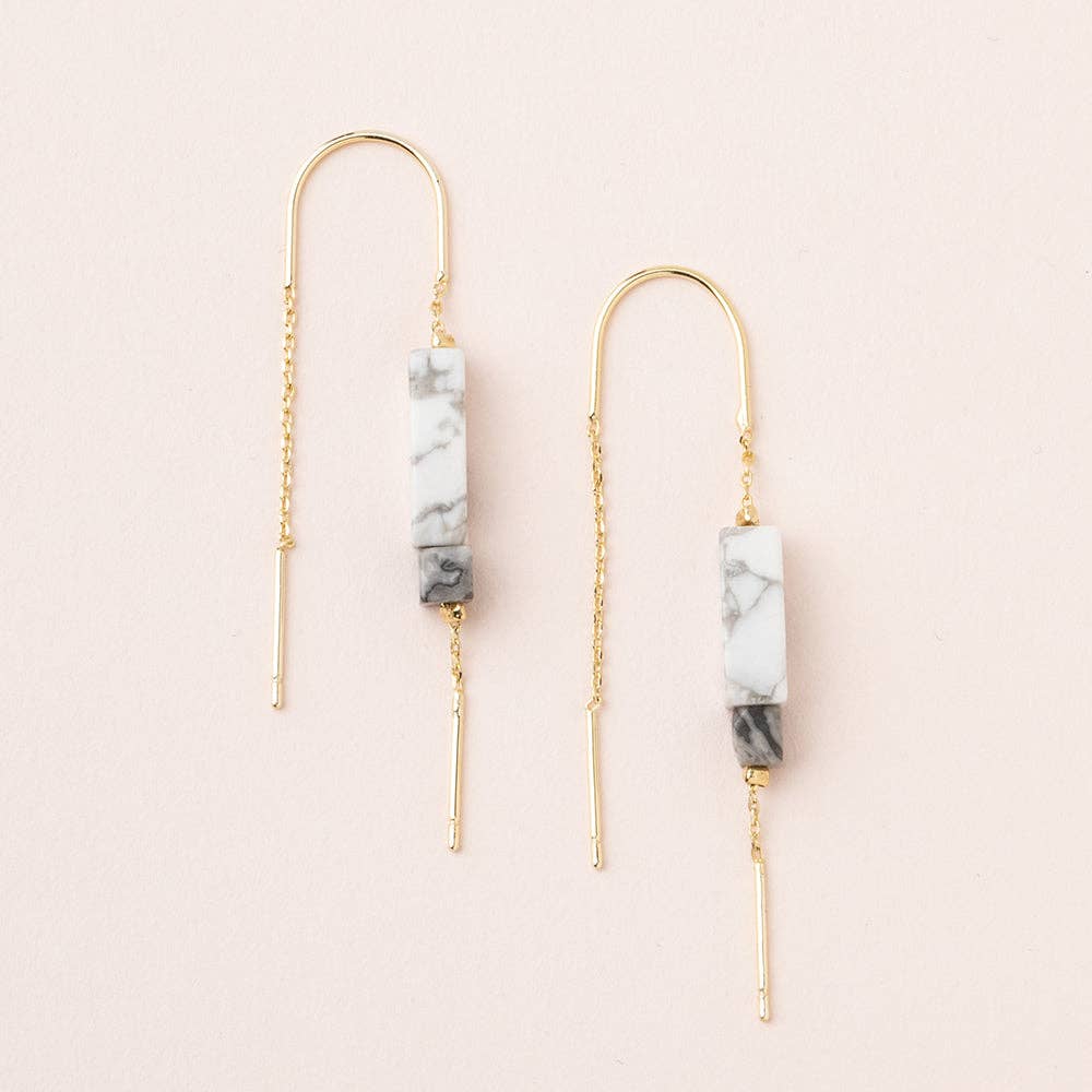Our new line of minimalistic charm to adorn your ears. Lightweight with the perfect amount of color and shape. Choose from silver or gold for an alluring, sleek and modern look. Whether you want to look polished or down-to-earth is up to you and your mood. • Materials: 2.25'' drop. Semi precious rectangle stones 1/2'' and 3/16''. 14K Gold dipped chain and wire. • Nickel and Cadmium free. • Hypoallergenic • Earrings come on embossed leather card with stone meaning on back. Howlite | Stone of harmony