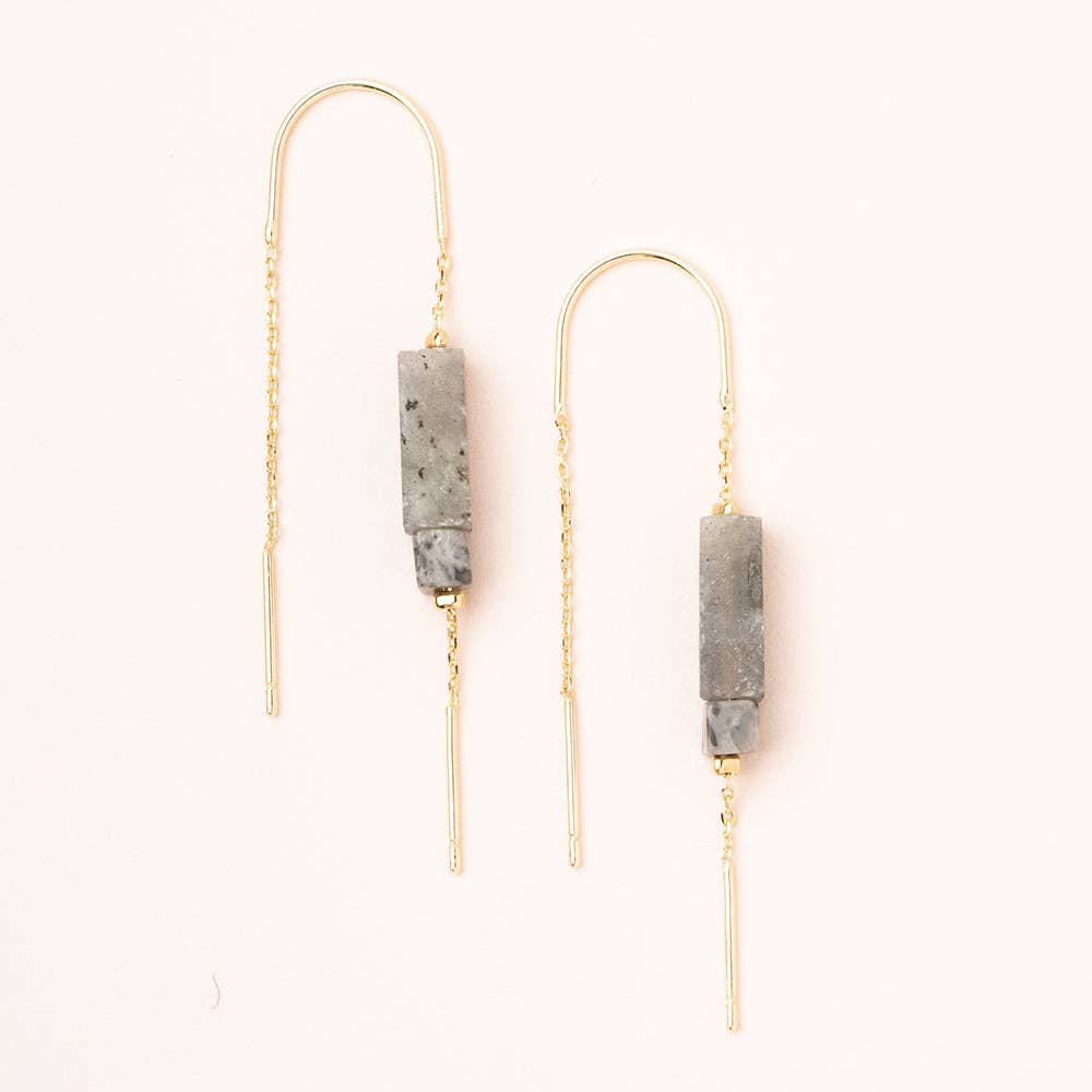 Our new line of minimalistic charm to adorn your ears. Lightweight with the perfect amount of color and shape. Choose from silver or gold for an alluring, sleek and modern look. Whether you want to look polished or down-to-earth is up to you and your mood. • Materials: 2.25'' drop. Semi precious rectangle stones 1/2'' and 3/16''. 14K Gold dipped chain and wire. • Nickel and Cadmium free. • Hypoallergenic • Earrings come on embossed leather card with stone meaning on back. Labradorite | Stone of magic