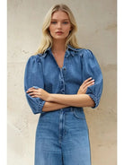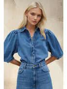 The Ridings Balloon Sleeved Denim Shirt—a timeless piece that brings effortless style to your everyday wardrobe. Crafted from soft denim, this blouse features charming puff sleeves and a classic lapel collar that adds polish to any outfit. Perfect for fall layering or wearing solo, it transitions seamlessly from casual days to dressed-up occasions. The relaxed fit and quality construction make it a versatile staple you'll reach for again and again.