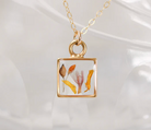 This Gold Mini Square Necklace showcases a delicate blend of statice, marigold, and sorghum flowers preserved in resin, elegantly set on an 18-inch gold filled chain. Handmade with precision, it offers a refined accessory that captures natural beauty with timeless sophistication.