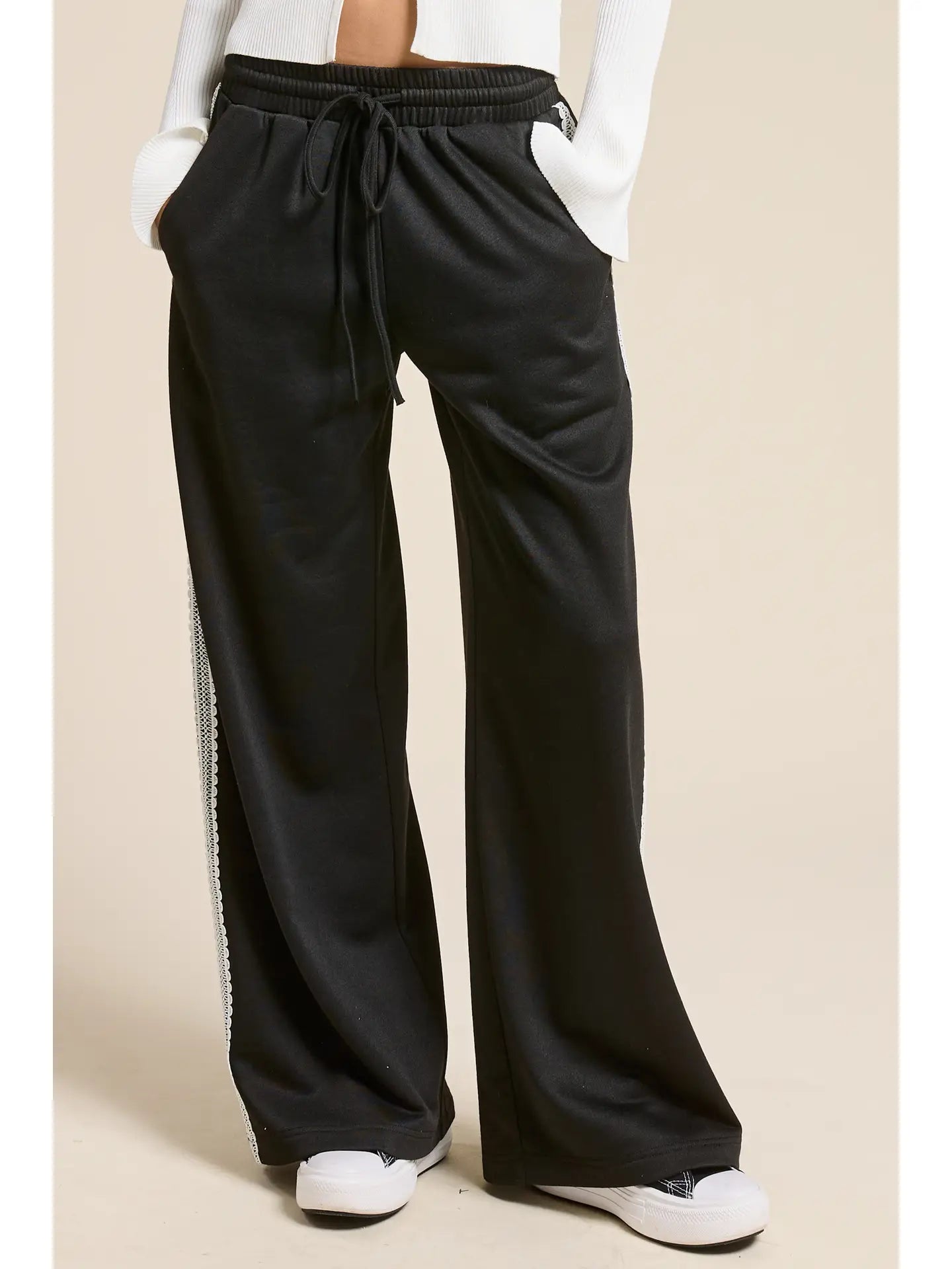 Sosa Black Lace Trim Wide Leg Track Pants