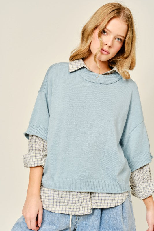 March Light Blue Round Neck Solid Sweater Top