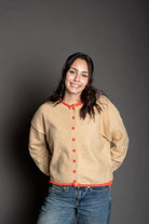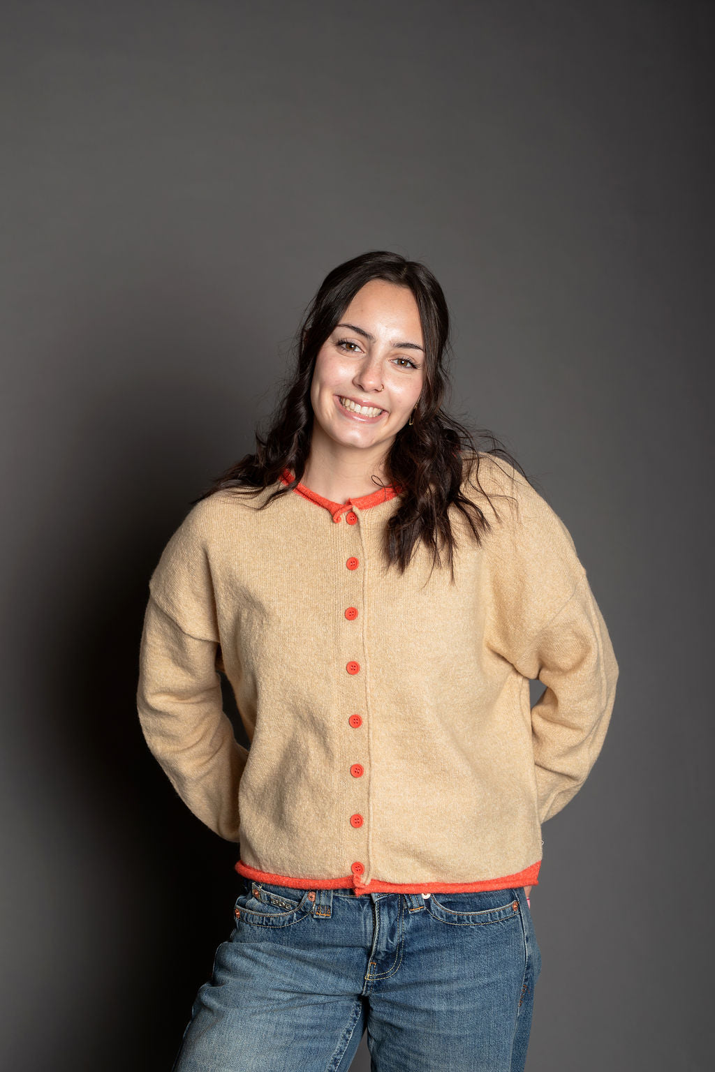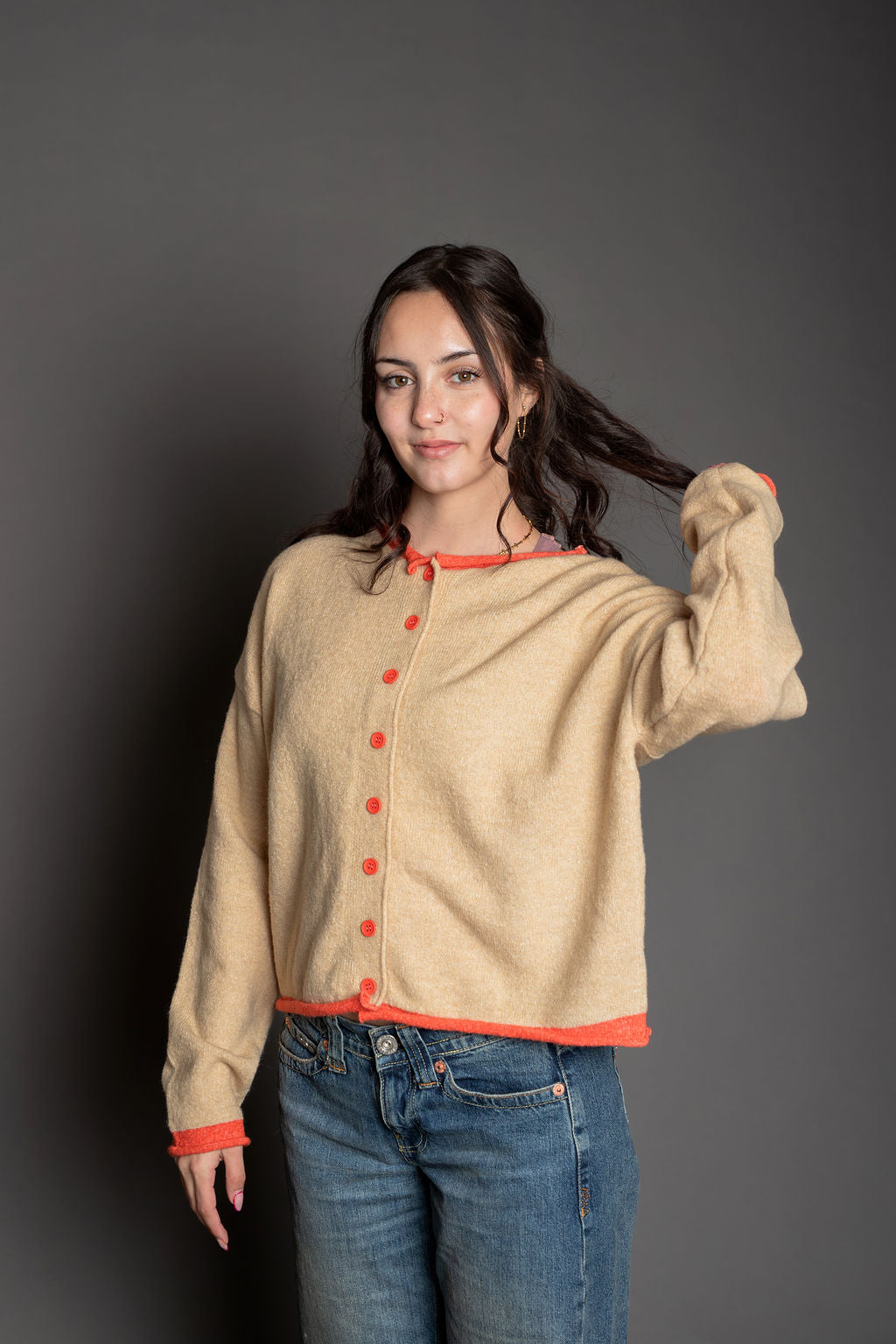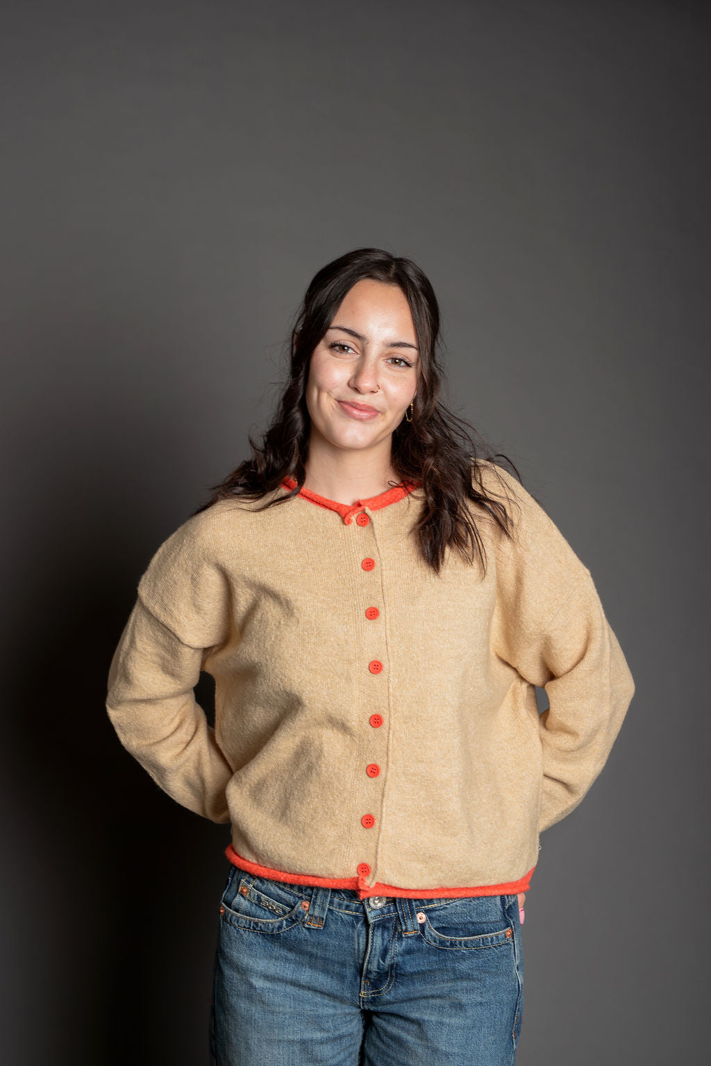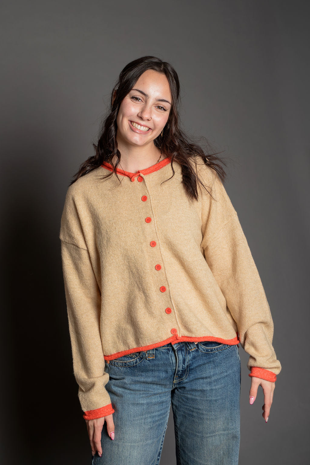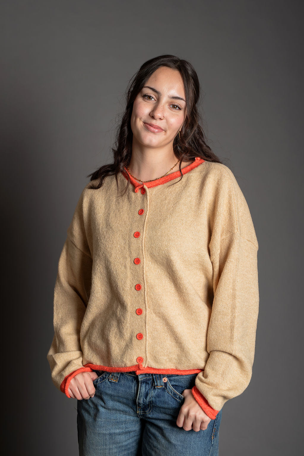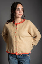 The Darcie Cardigan combines comfort and style with its soft knit blend of polyester and acrylic. This crew neck pullover features long sleeves and a classic cardigan silhouette, elevated by red contrast edging that adds visual interest. Perfect for layering over your favorite tee or wearing solo.