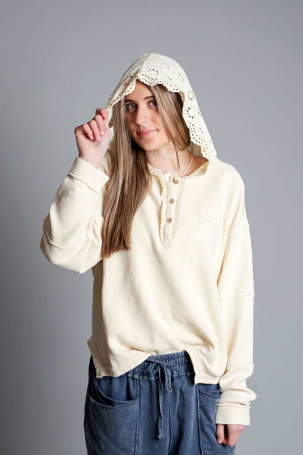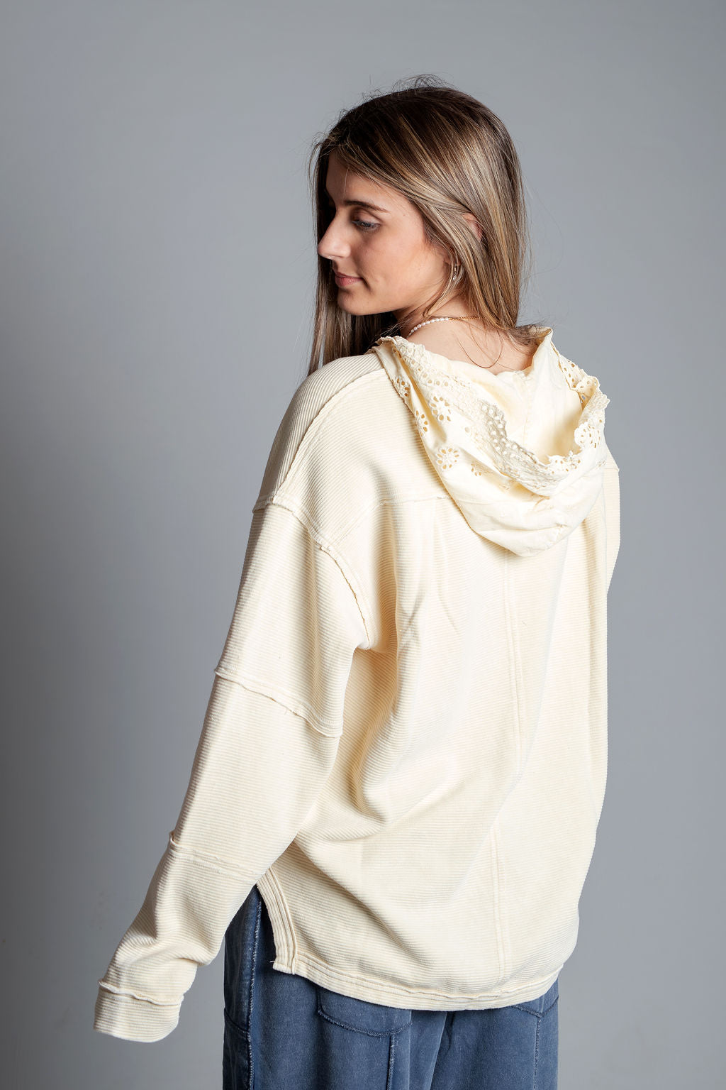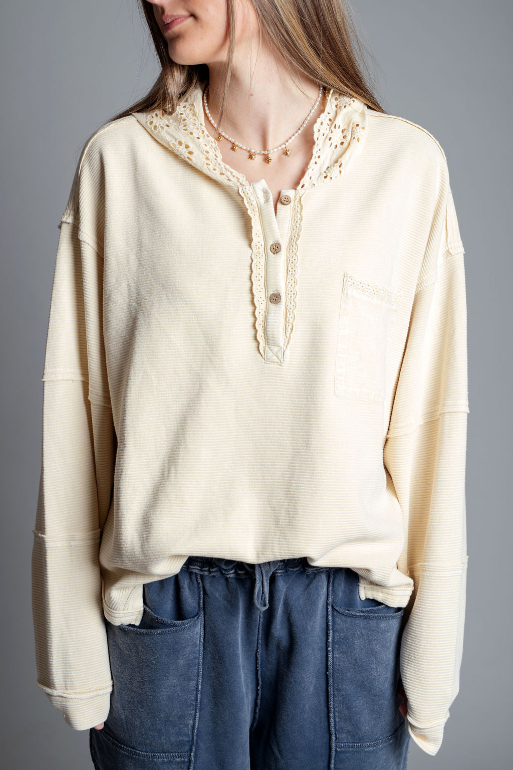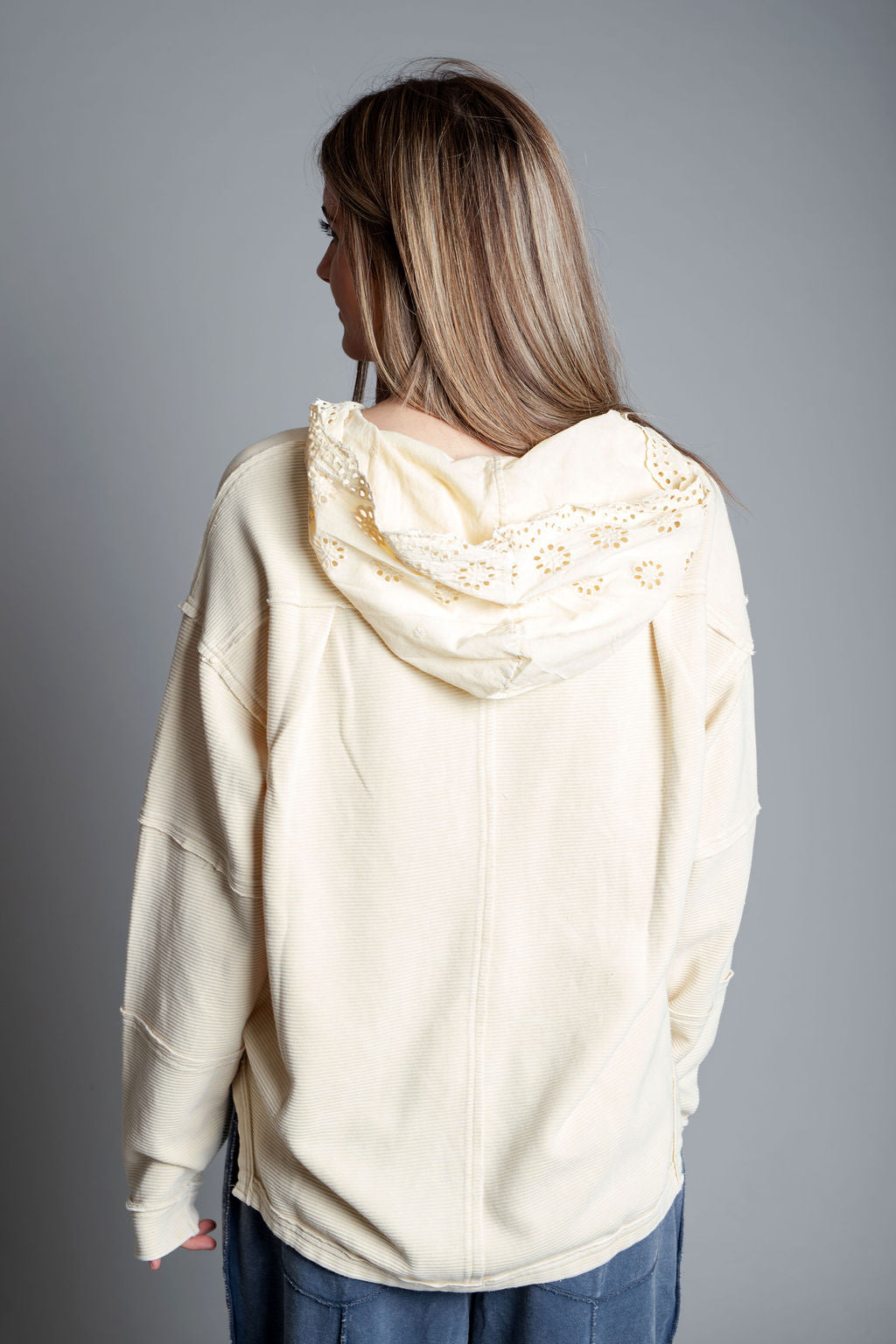 A comfortable and stylish essential! Featuring a soft, mineral-washed finish and textured knit fabric, this relaxed-fit hoodie combines cozy comfort with effortless boho-inspired style. The eyelet hood makes this such a fun, unique piece!