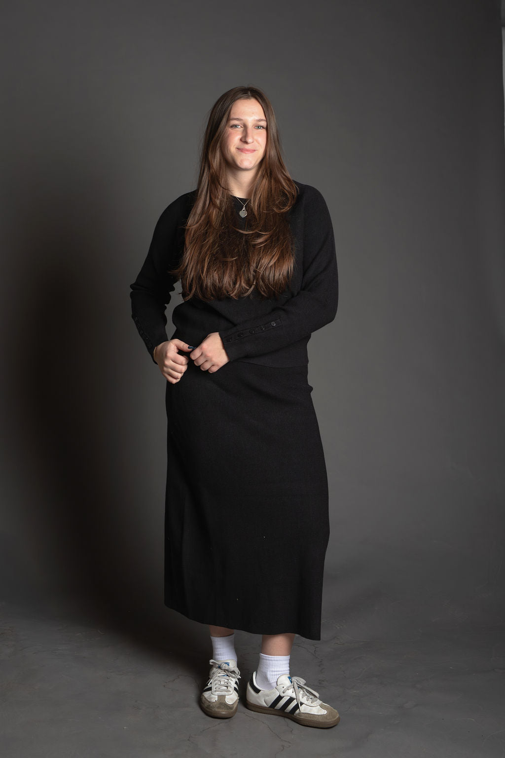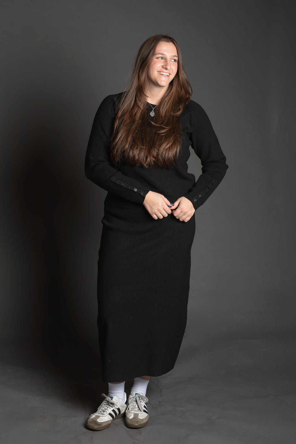 - Matching Set: Includes a pullover crewneck sweater and a coordinating midi-length skirt
