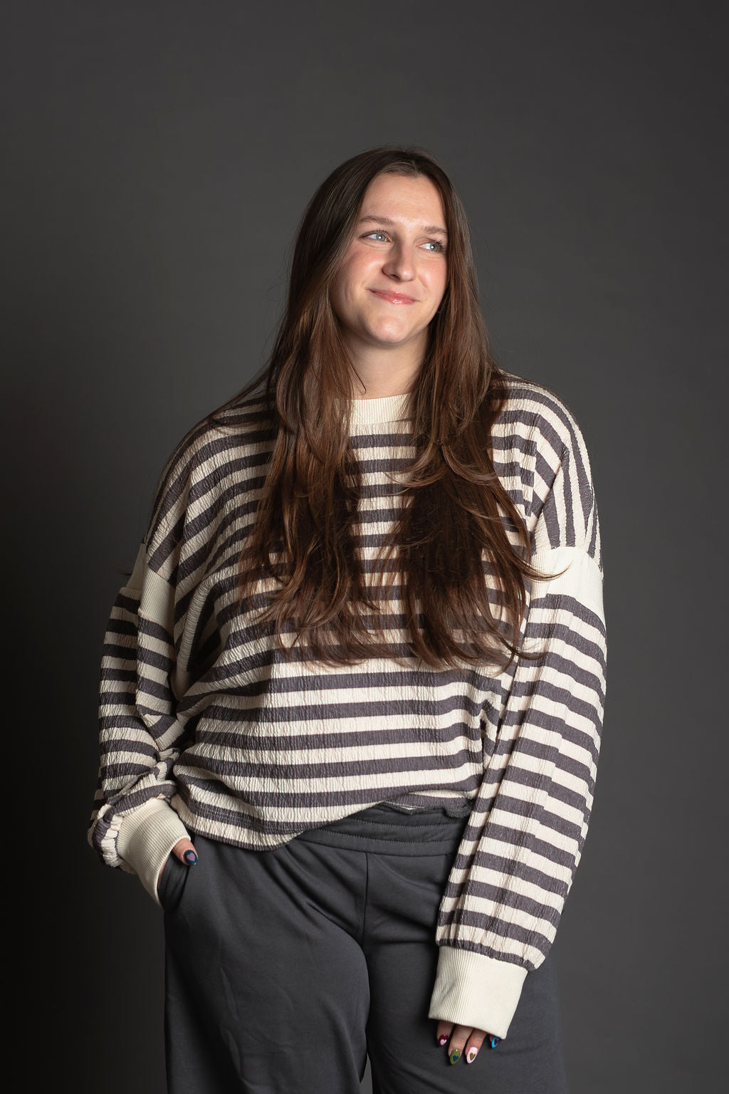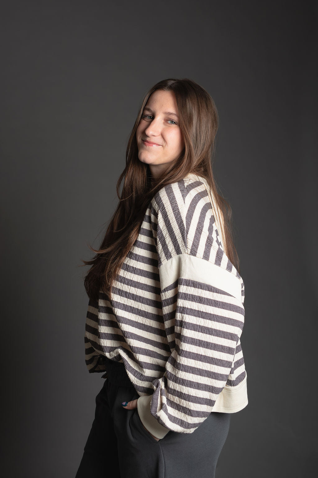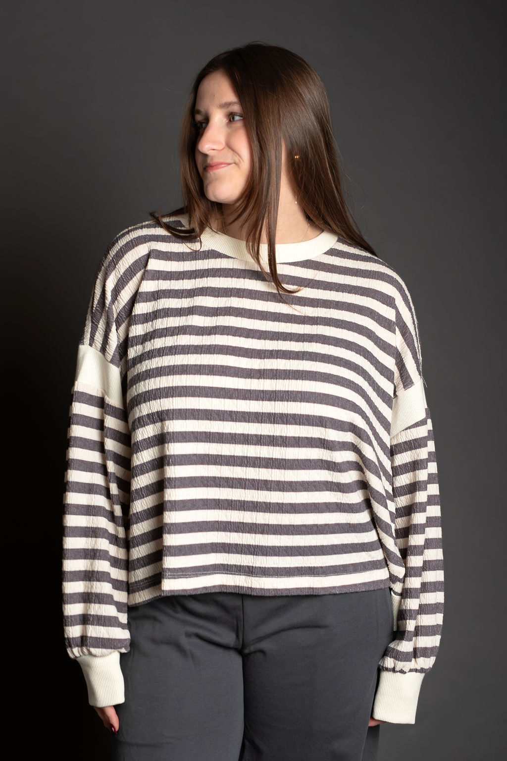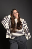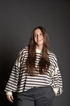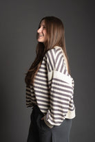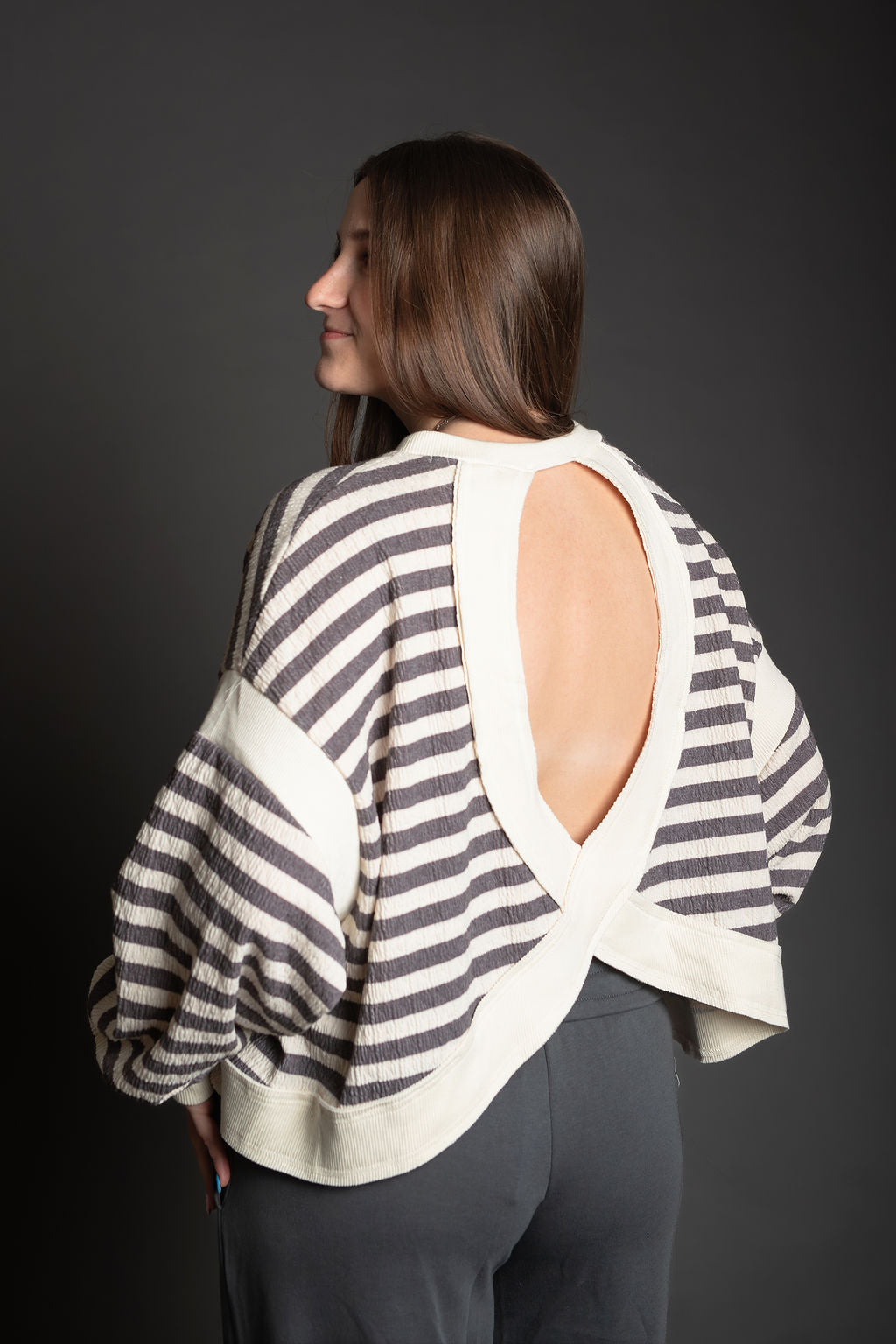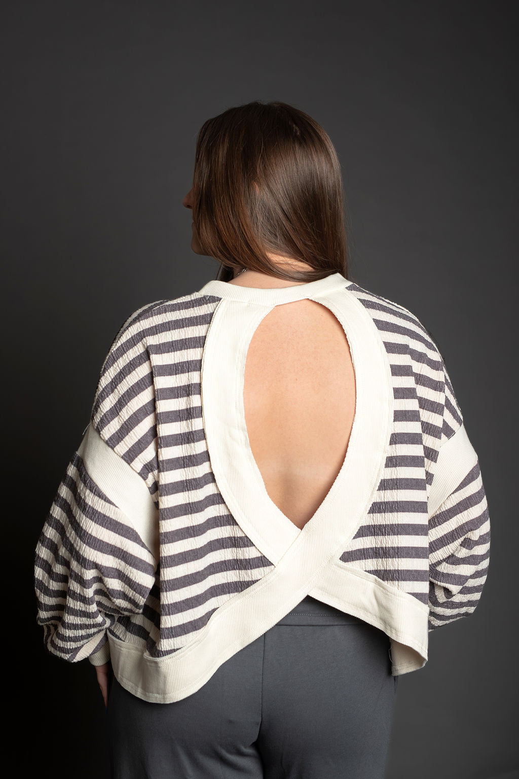 This oversized striped top features a relaxed, comfortable fit with long drop-shoulder sleeves that create an effortless silhouette. The standout detail is the overlap open back design, adding a touch of style and breathability. Contrast accents throughout enhance the classic striped pattern, making this piece perfect for casual everyday wear or dressing up with the right accessories.