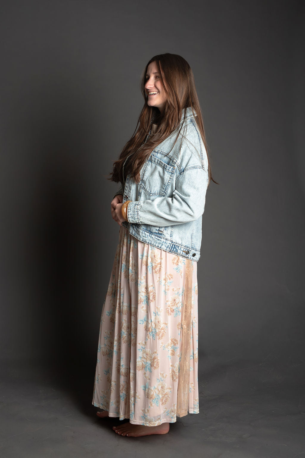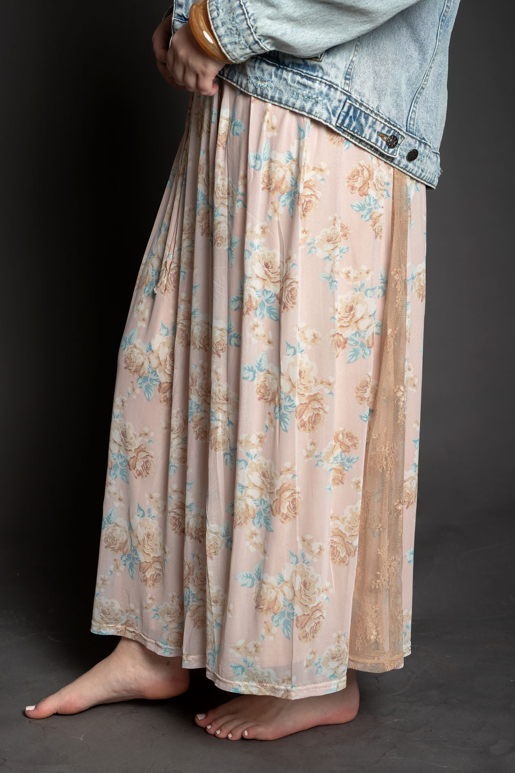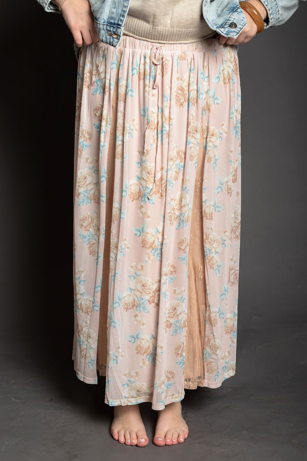 Darcie Blush Floral Mesh And Lace Midi Skirt