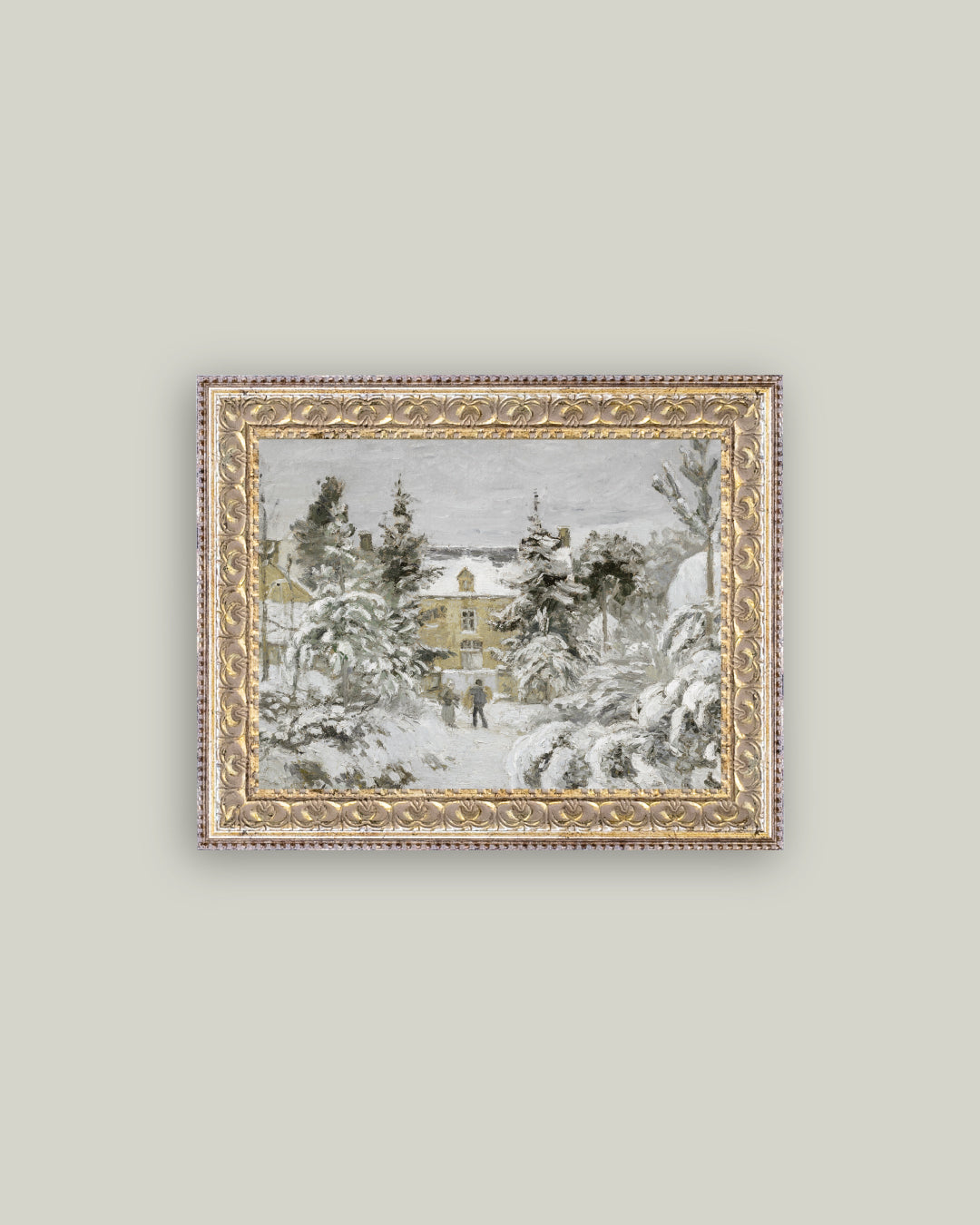 This charming vintage framed painting captures a serene winter scene of two figures enjoying a peaceful stroll through snow-laden trees. A warm yellow house glows invitingly in the background, adding a cozy focal point to this nostalgic artwork. Perfect for adding timeless elegance and a touch of nostalgia to any room's decor. The piece combines classic artistic charm with the comfort of a winter landscape.