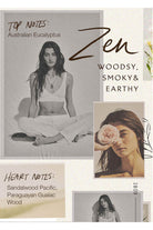 Zen is a sensual woodsy blend, infused with rich sandalwood and smoky guaiac wood (think: slow-burning incense), earthy patchouli and awakening eucalyptus.