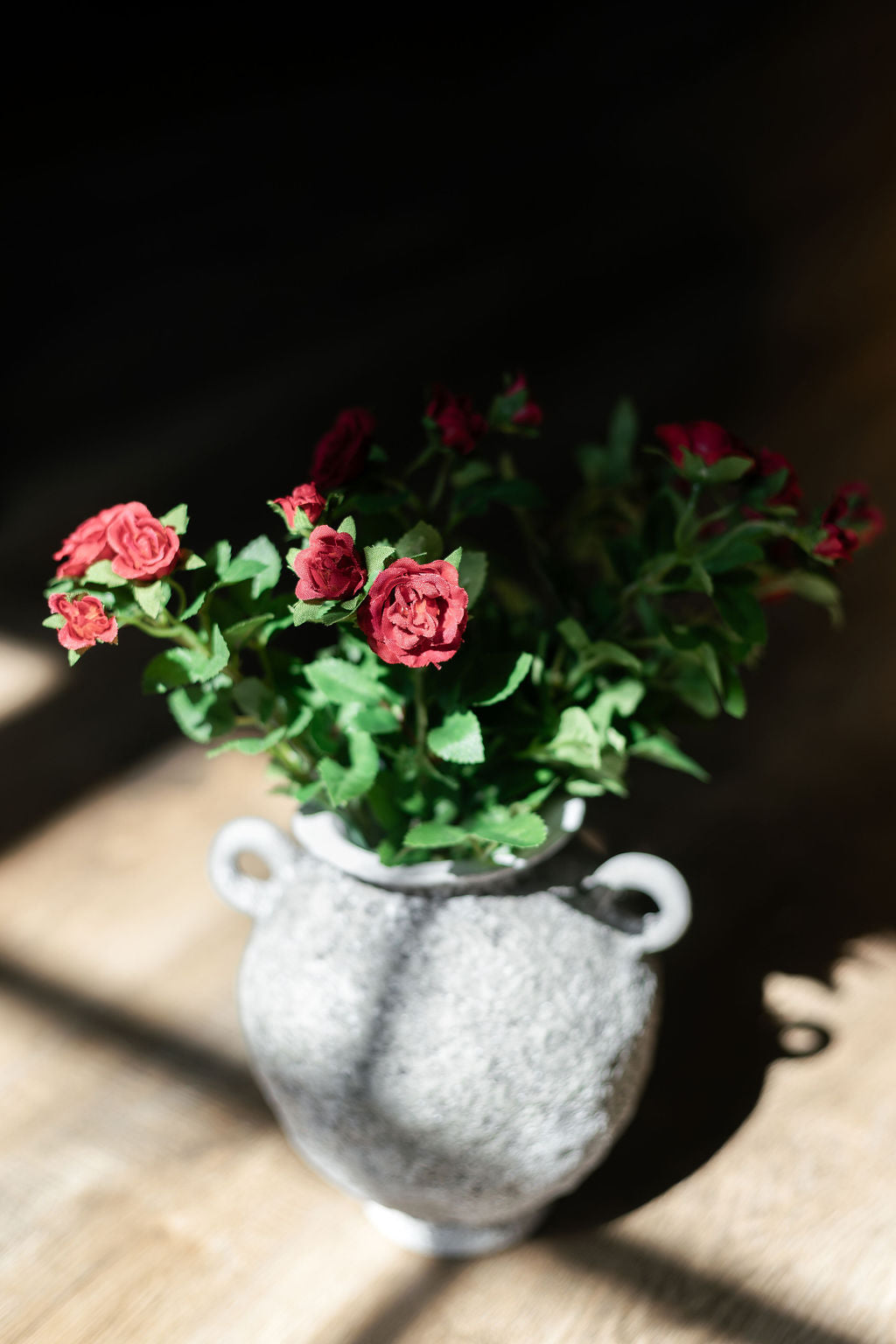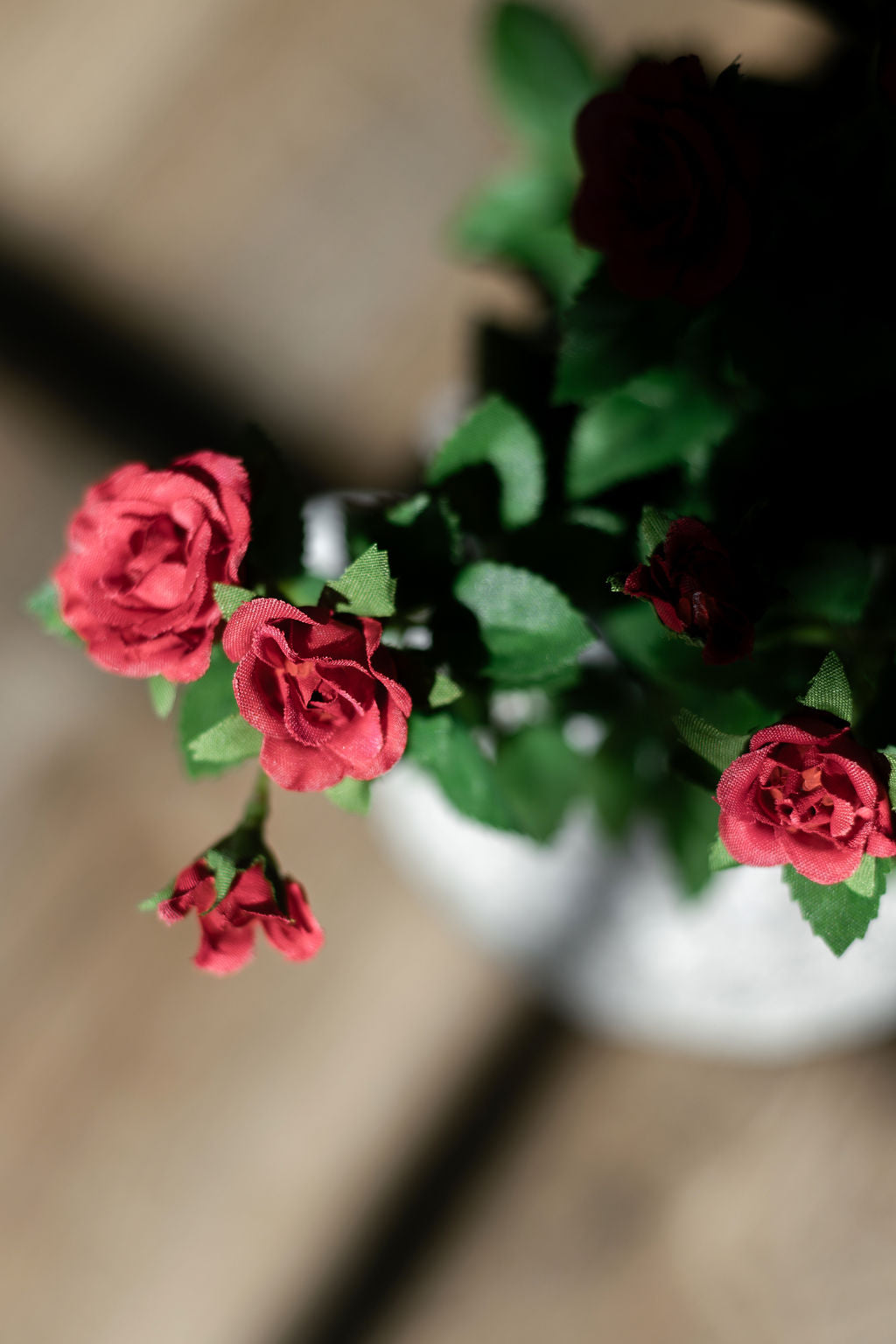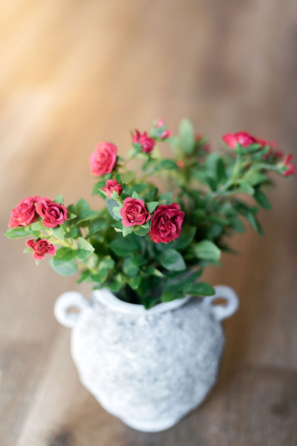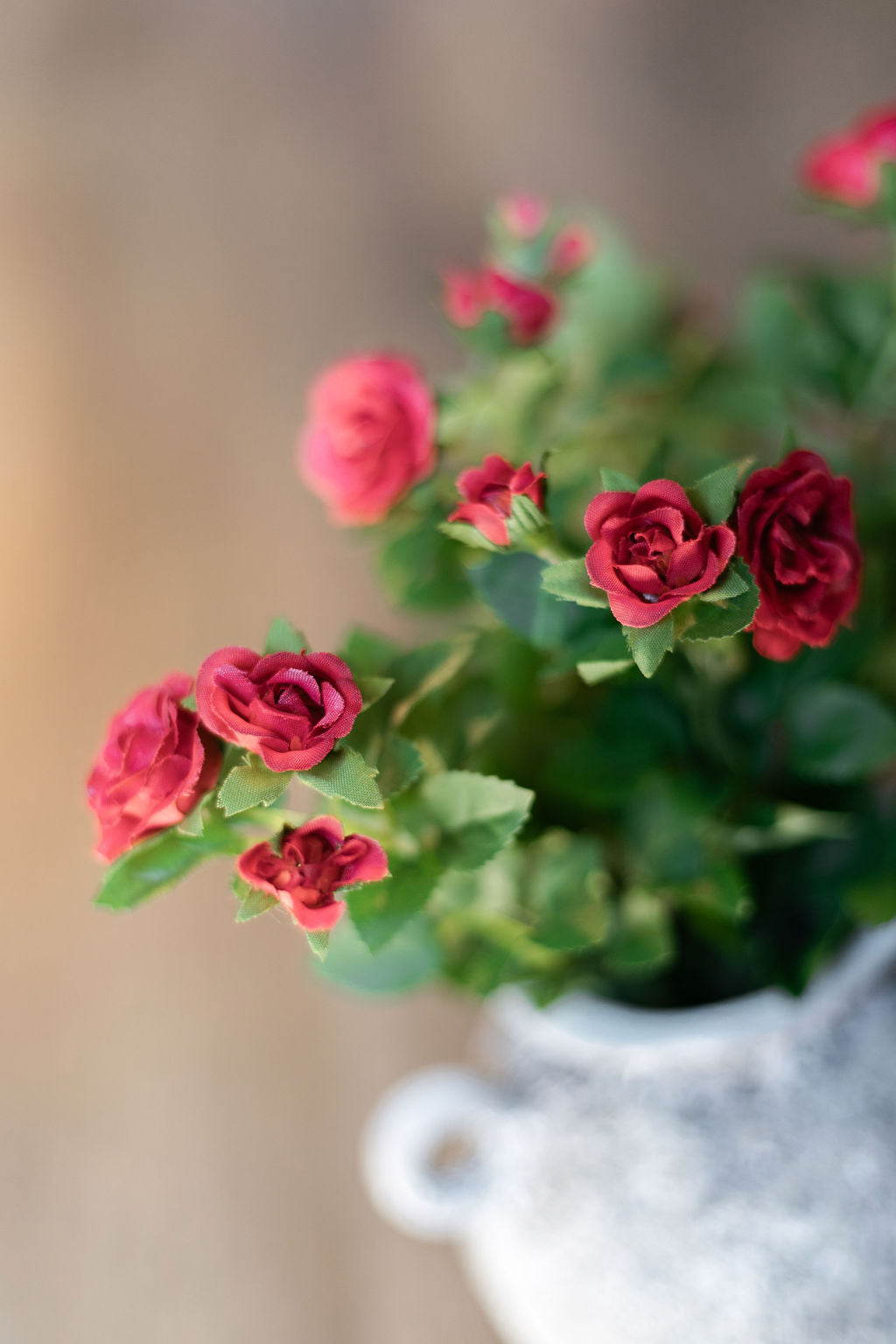 It's the perfect sweet pop of color and sophistication with our mini rose pick. The deep green foliage and rich scarlet red blossoms, delicately arranged on a mini 10" stem are the perfect way to add a little "life" and florals to your home decor. Perfect for a mini vase or put in a tiny bouquet.