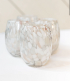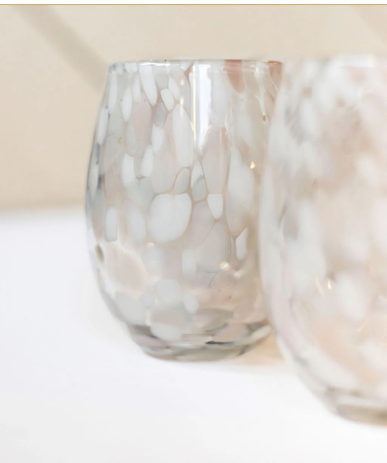 Each confetti stemless wine glass is artisan blown and fully handcrafted using ancient glass techniques, with lively color sprinkled throughout. Perfect for entertaining or eye-catching home decor. Slight variations in color are to be expected—individual glasses are one-of-a-kind, no two pieces will be exactly alike.