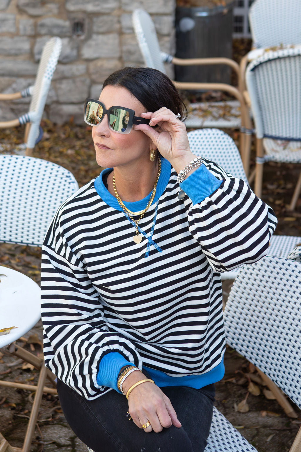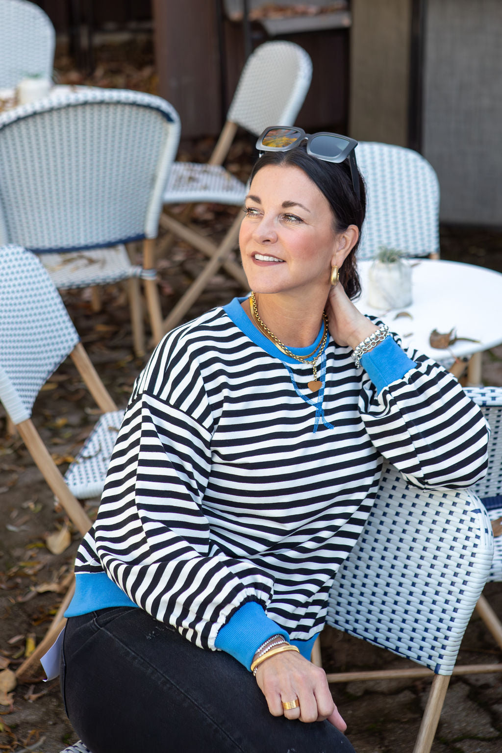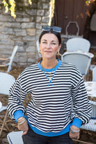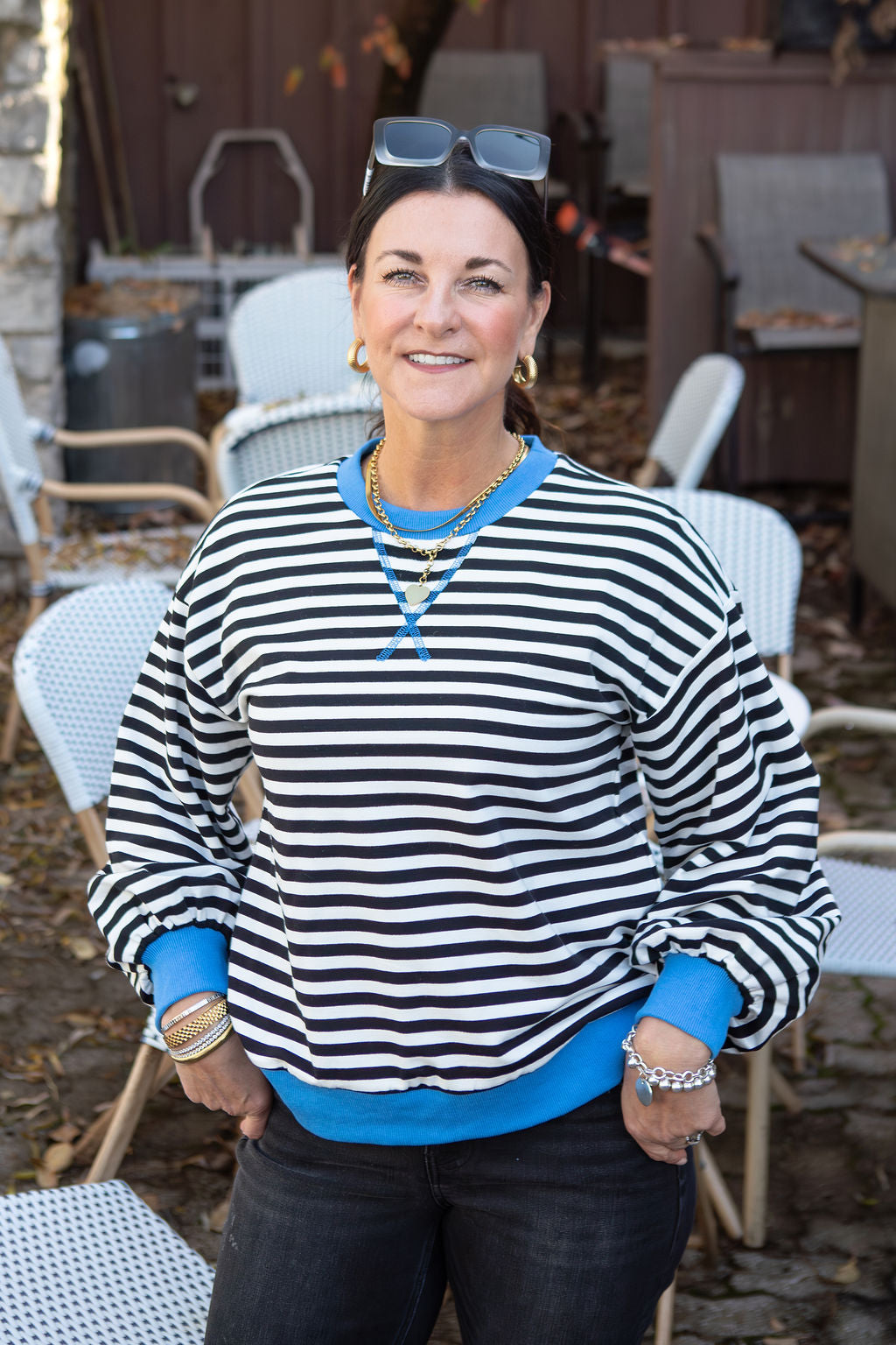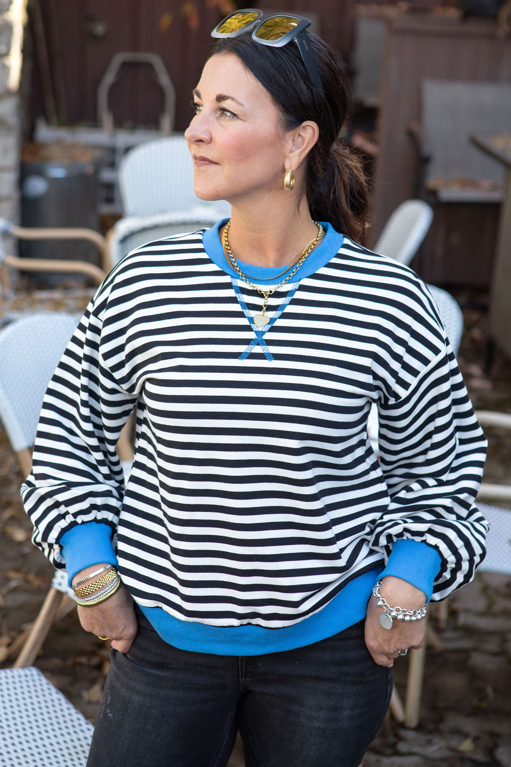 Long puff sleeves stripe sweatshirt with v-notched neckline, solid contrast binding detail. - Model is 5'10'' and is wearing a Small.(wear ivory/black, hunter green/navy) - Model is 5'7'' and is wearing a Small.
