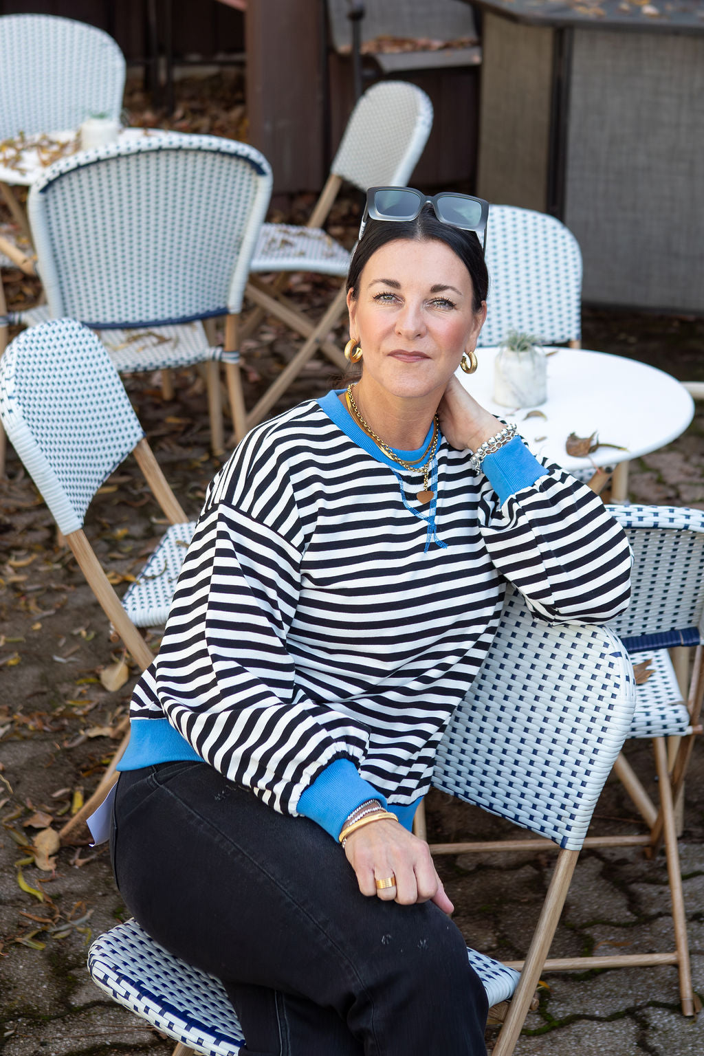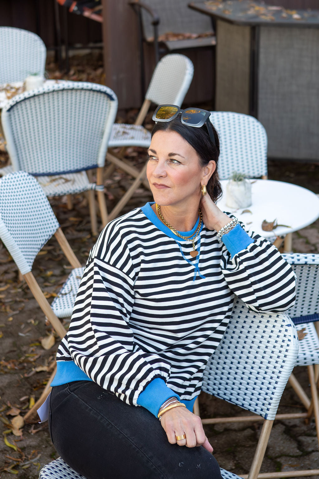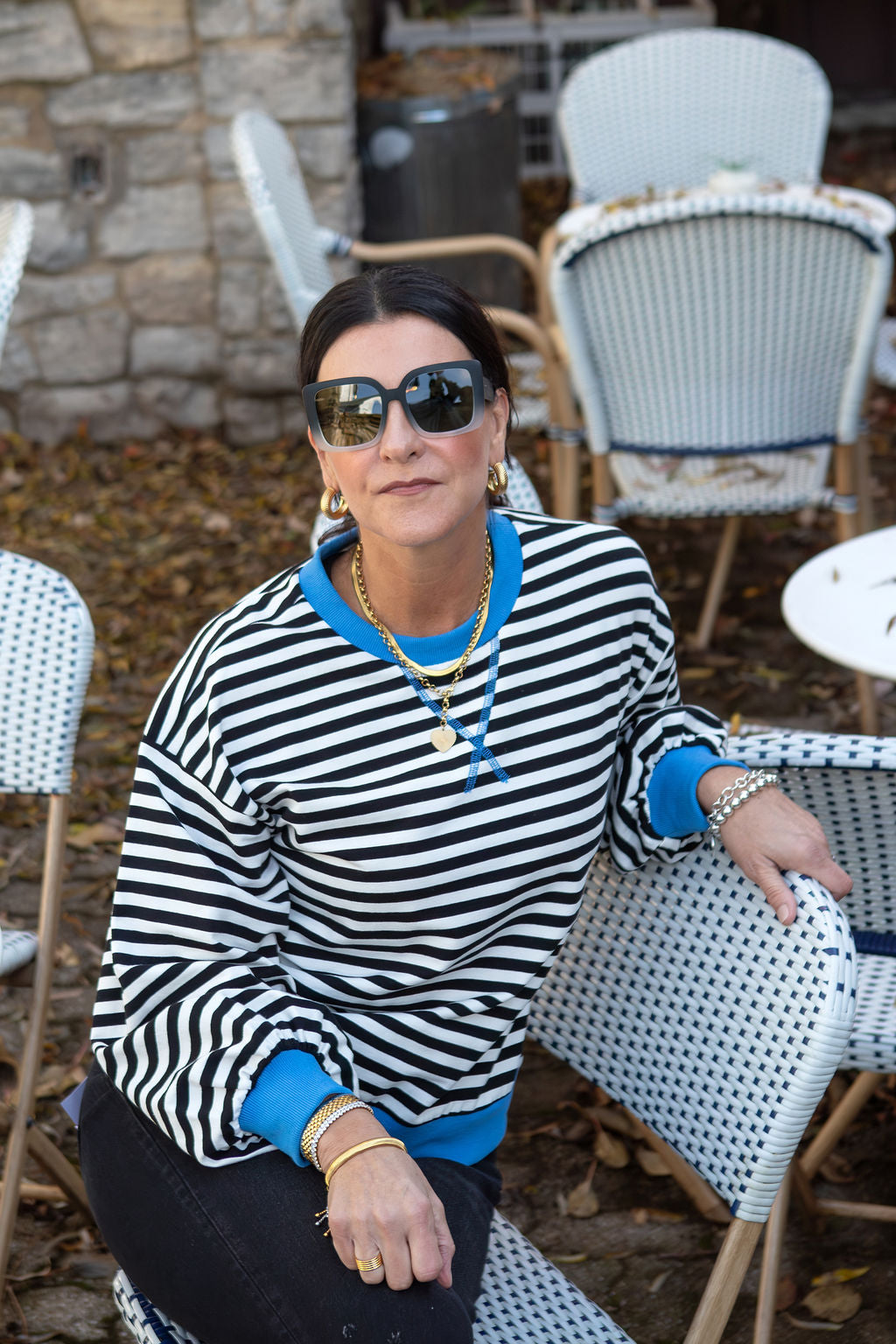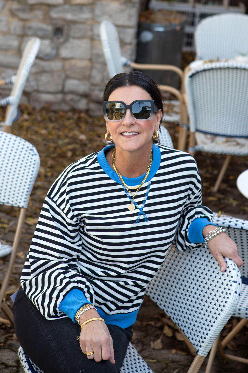 Long puff sleeves stripe sweatshirt with v-notched neckline, solid contrast binding detail. - Model is 5'10'' and is wearing a Small.(wear ivory/black, hunter green/navy) - Model is 5'7'' and is wearing a Small.